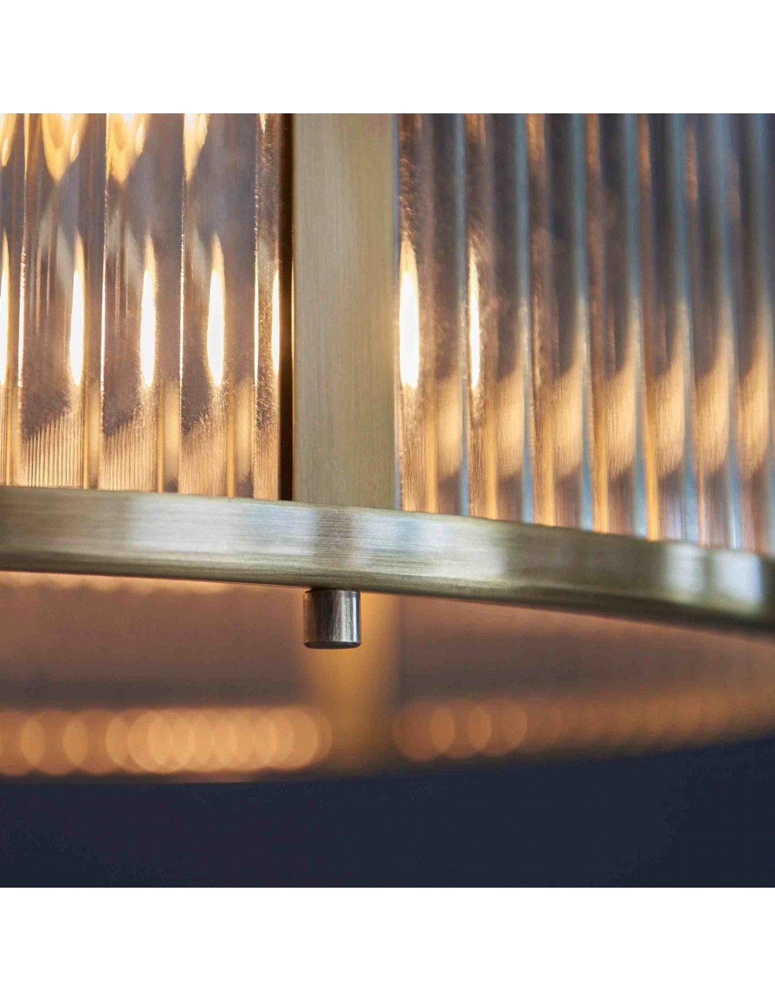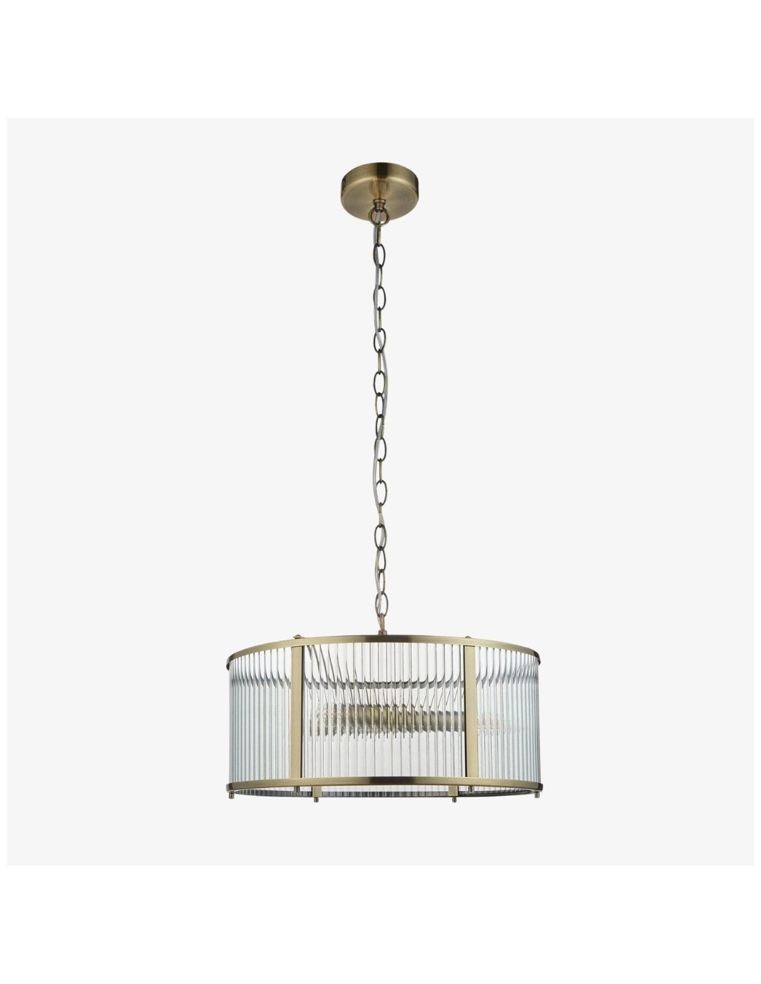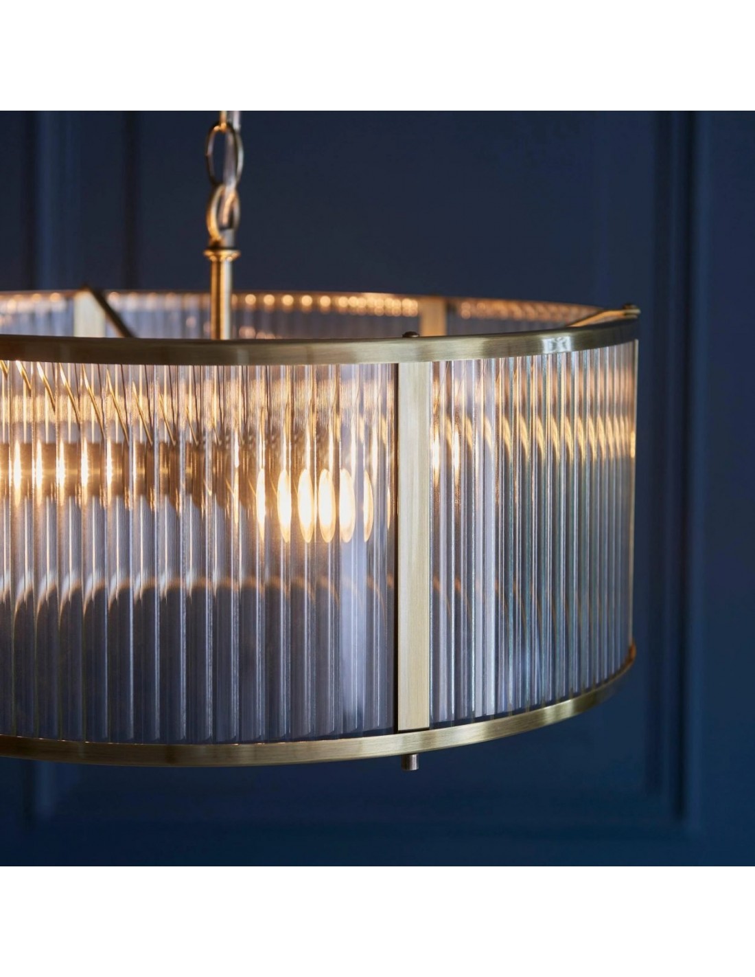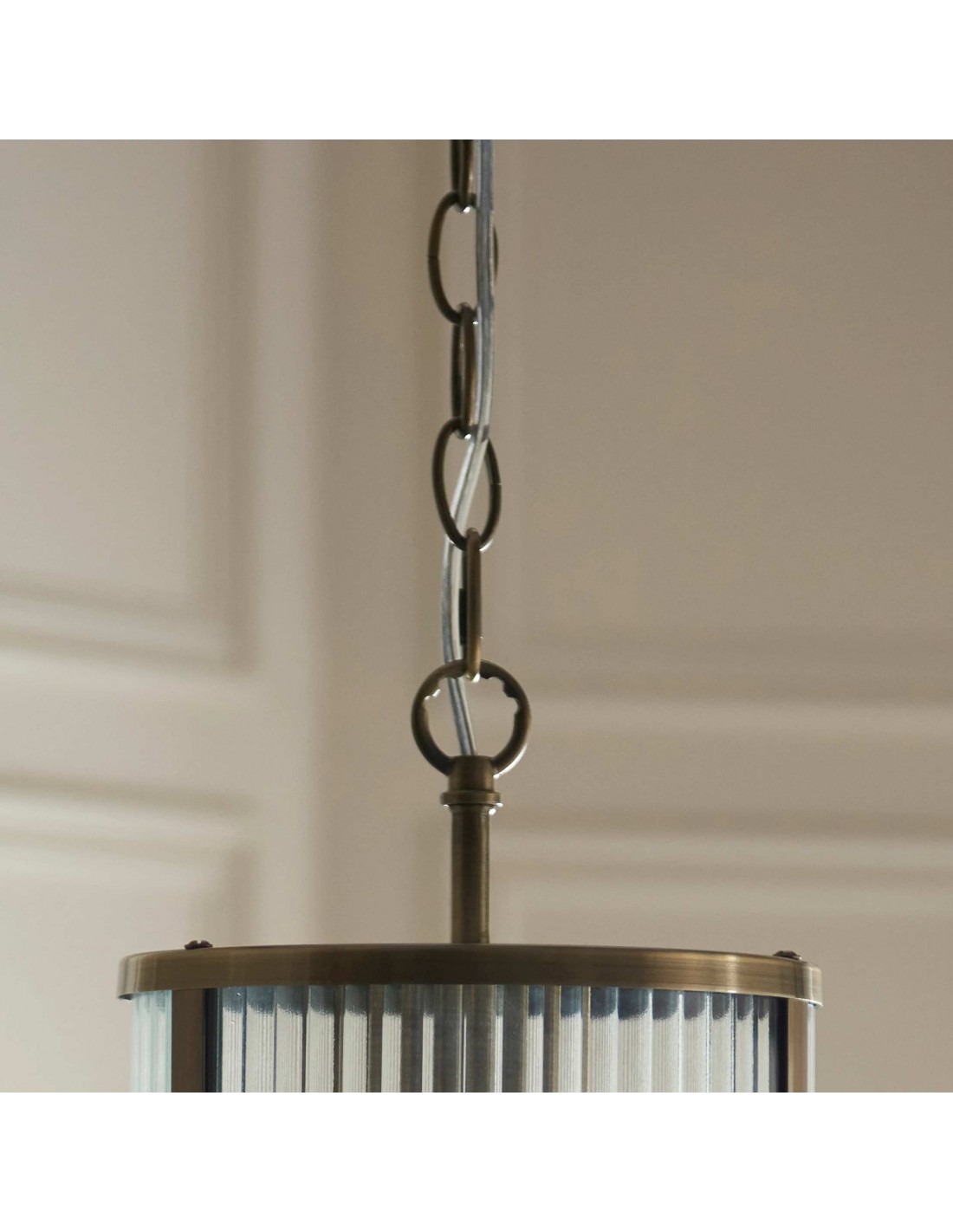 La lampada a sospensione abbina paralumi in vetro scanalato e testurizzato a un elegante rosone in metallo per creare una luce morbida e filtrata. Disponibile in configurazioni singole, a 3, 4 o 5 luci, ogni apparecchio è regolabile in altezza. Senza tempo ma contemporaneo, si adatta a isole cucina, sale da pranzo, bar e spazi dedicati all'ospitalità.