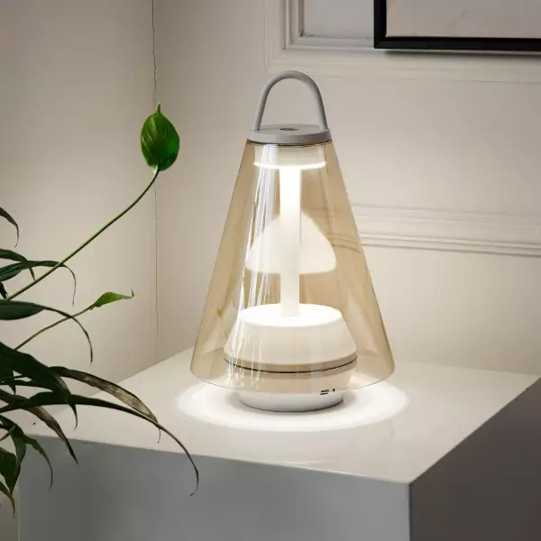 La lampada da tavolo Shuttle è elegante e versatile, perfetta sia per gli interni che per gli esterni. Il suo design accattivante e alla moda è completato da una copertura in vetro soffiato lavorato a mano. Inoltre, è comodamente alimentata da una batteria ricaricabile e da una porta USB. Portala ovunque tu vada: la maniglia superiore ti permette di trasportare la lampada a LED Shuttle ovunque tu vada.