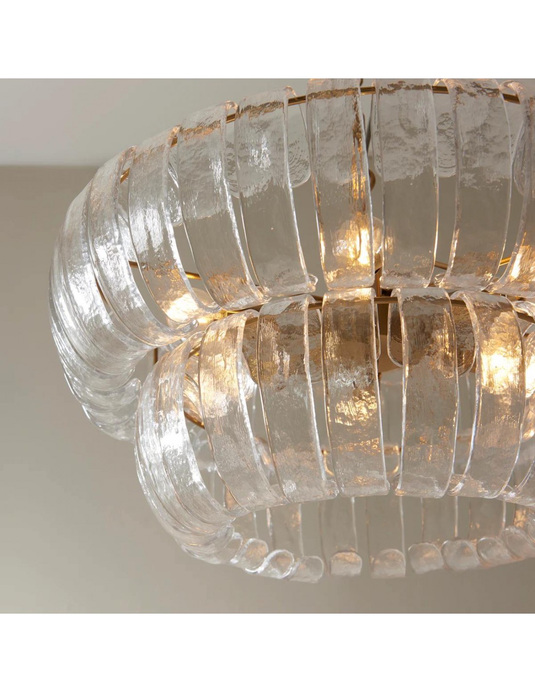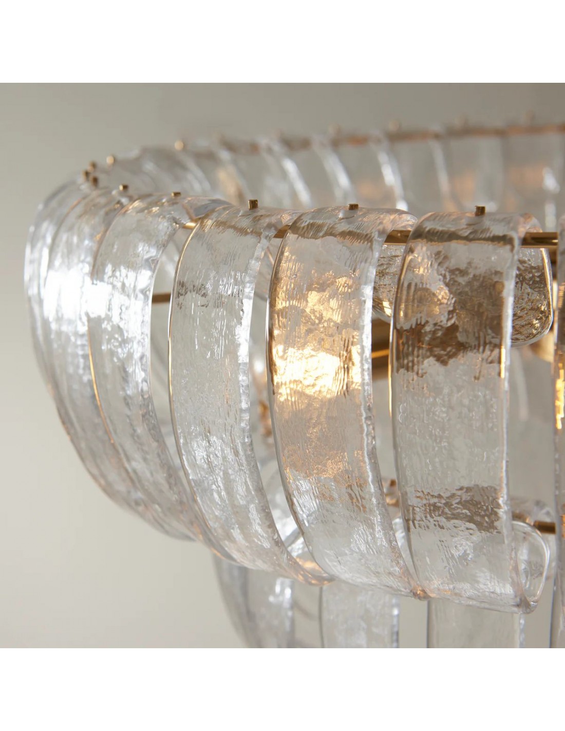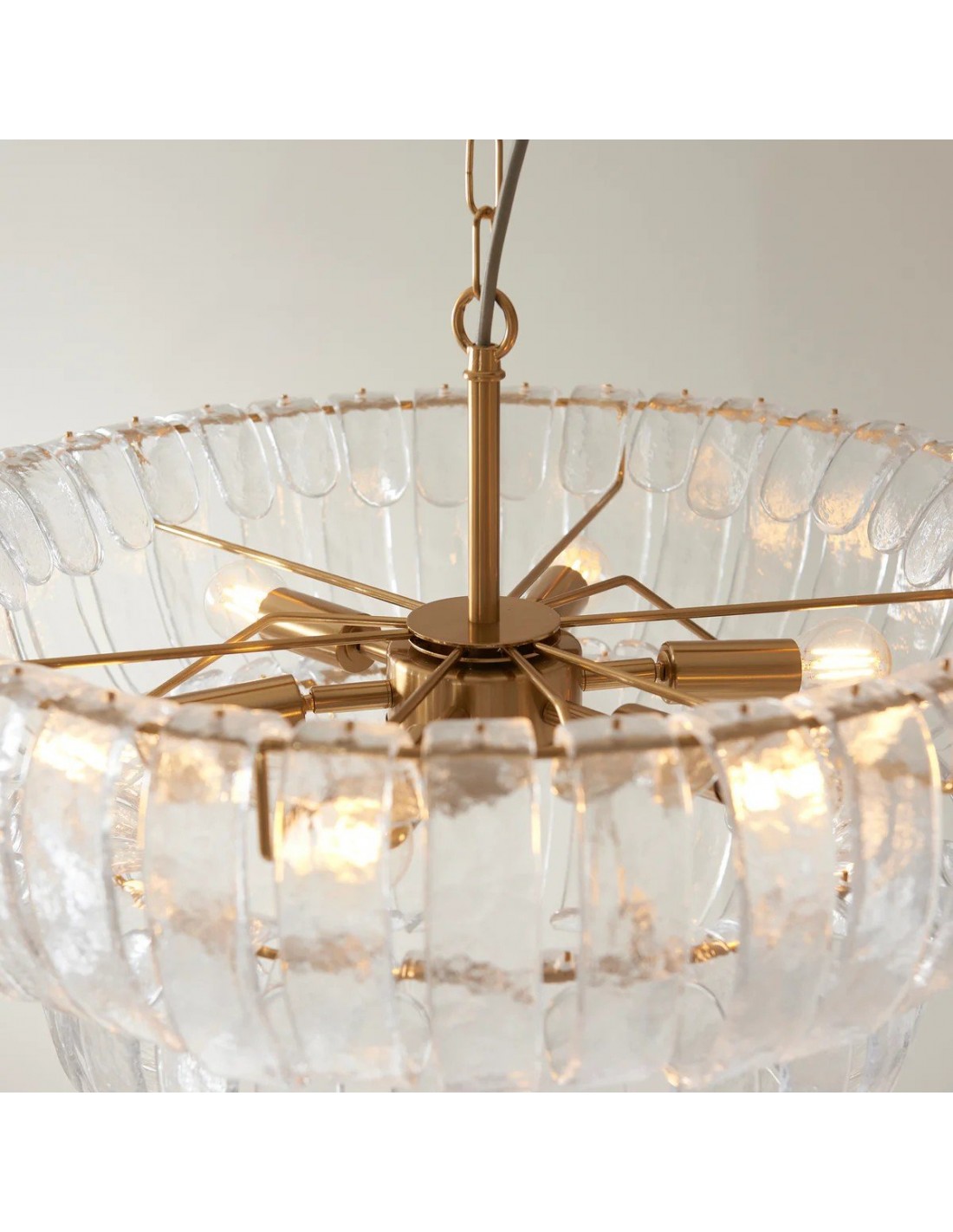 Lampada a sospensione Solara a 6 luci con pannelli in vetro curvato fatti a mano che si dispongono a cascata su due livelli per formare un alone morbido e scintillante. Incorniciata da una calda struttura metallica, è ideale per sale da pranzo, ingressi e soggiorni alti.