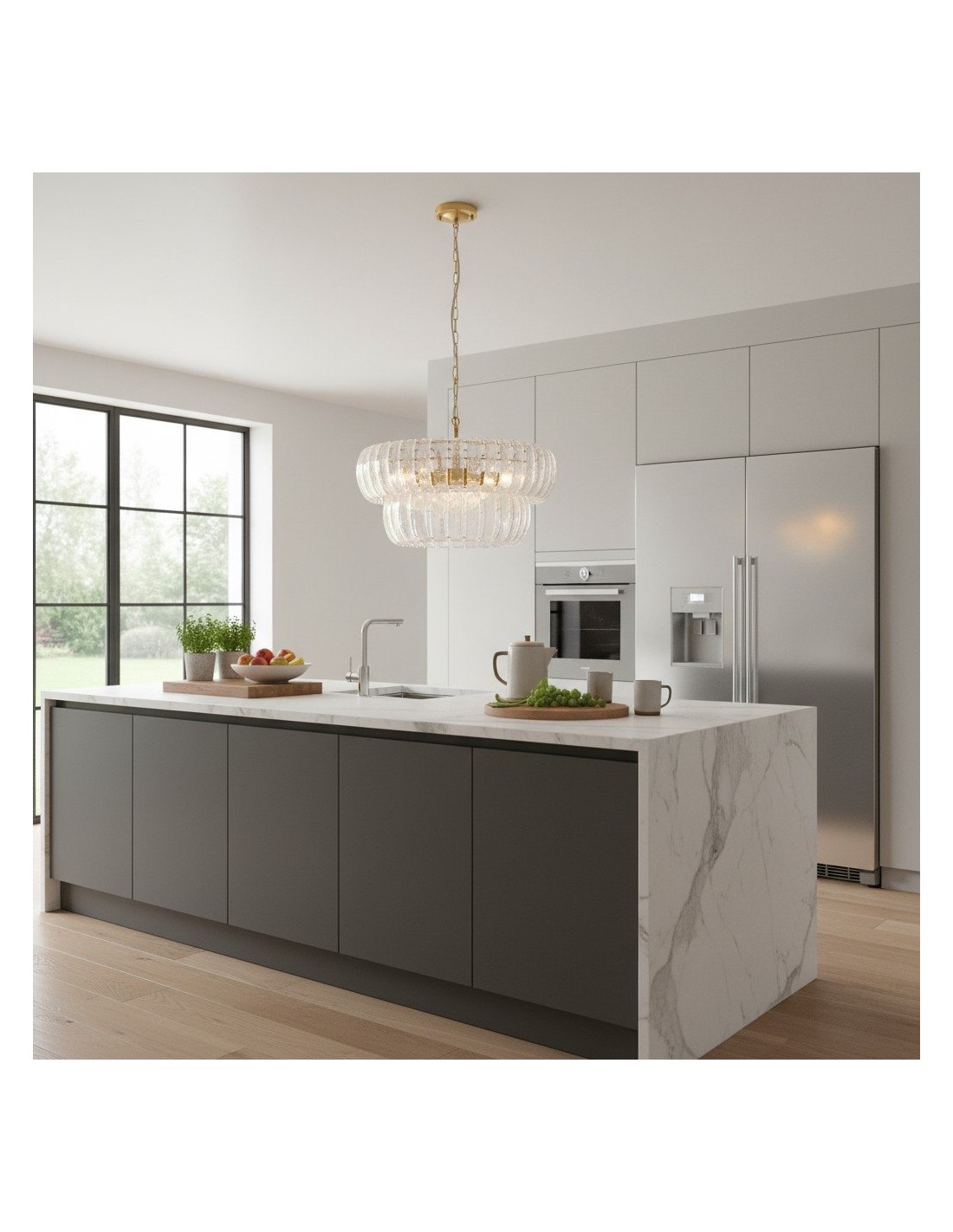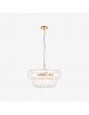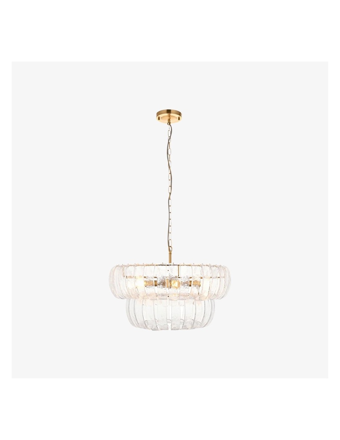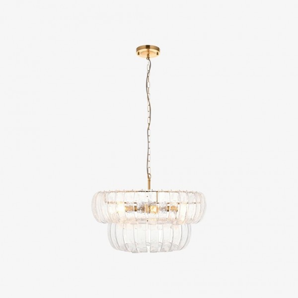 Lampada a sospensione Solara a 6 luci con pannelli in vetro curvato fatti a mano che si dispongono a cascata su due livelli per formare un alone morbido e scintillante. Incorniciata da una calda struttura metallica, è ideale per sale da pranzo, ingressi e soggiorni alti.