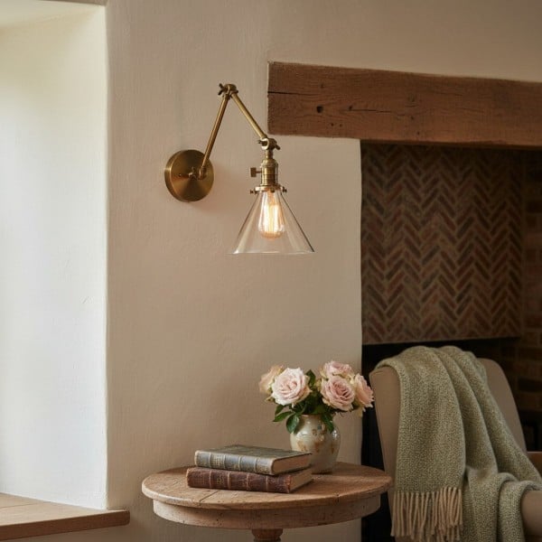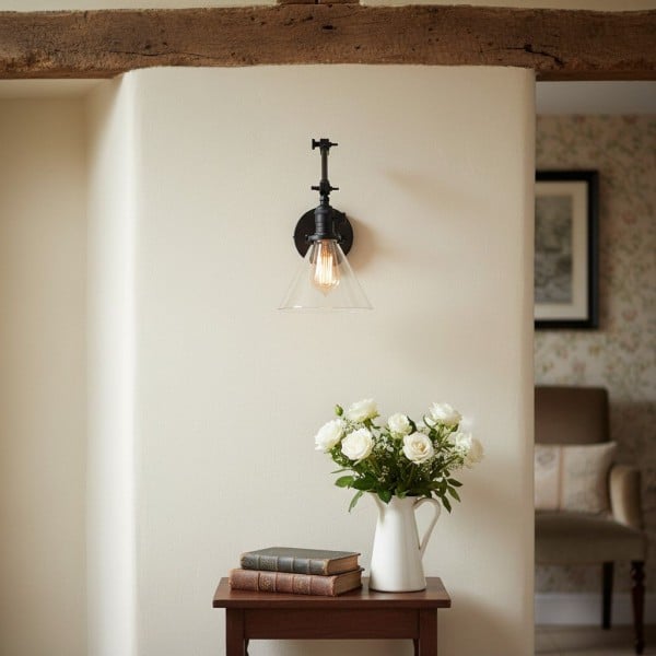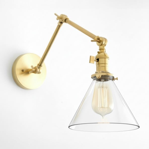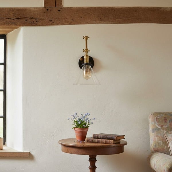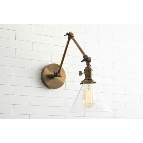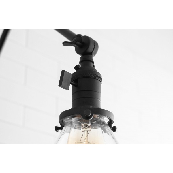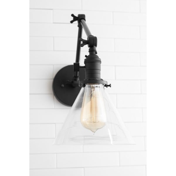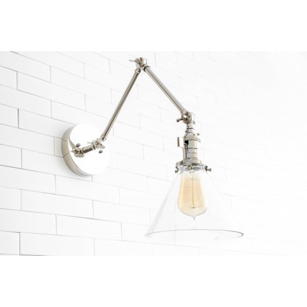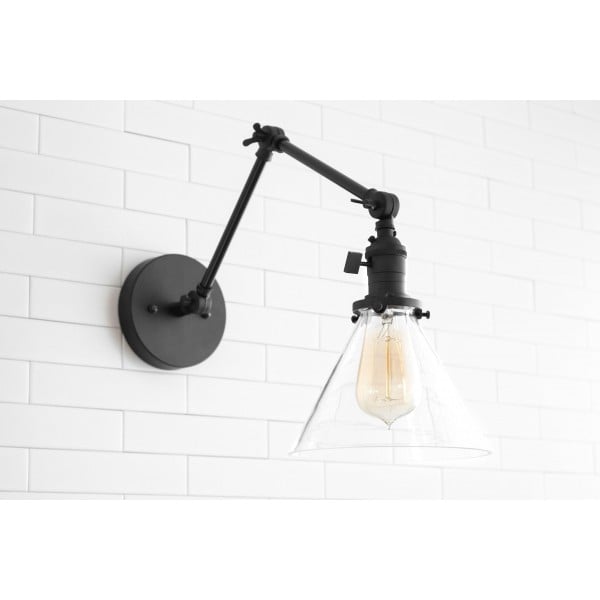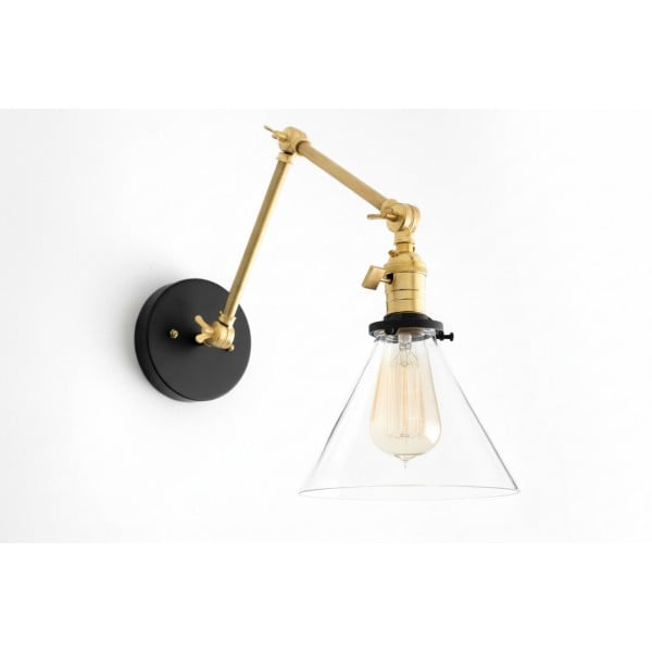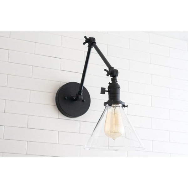 Questa lampada da parete industriale è dotata di un braccio metallico completamente regolabile con giunti rotanti per un'illuminazione precisa. Il paralume conico in vetro trasparente offre una visibilità pulita, completando al contempo il design di ispirazione vintage. Perfetta per angoli lettura, studi e bar alla ricerca di un fascino meccanico.