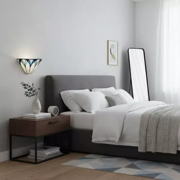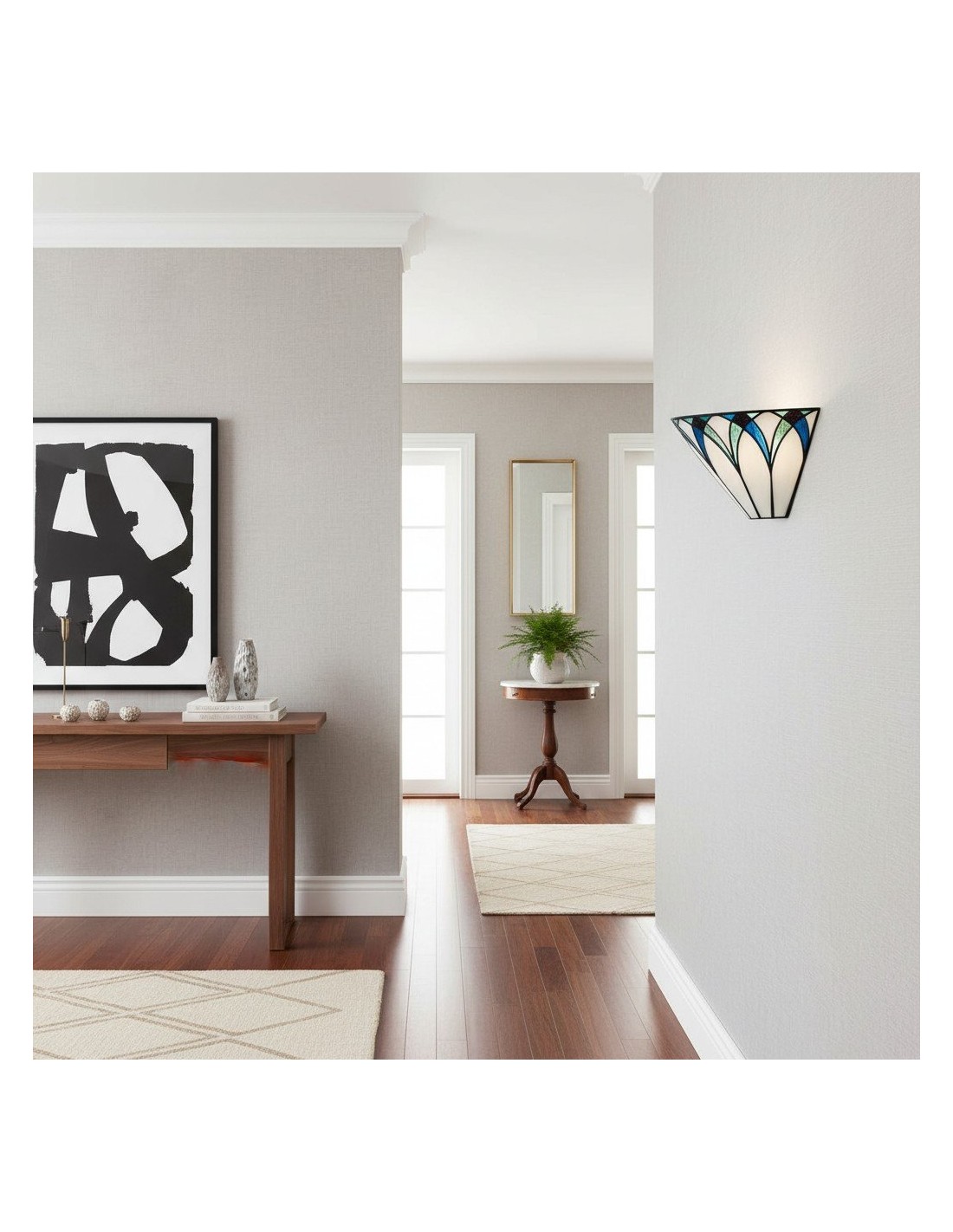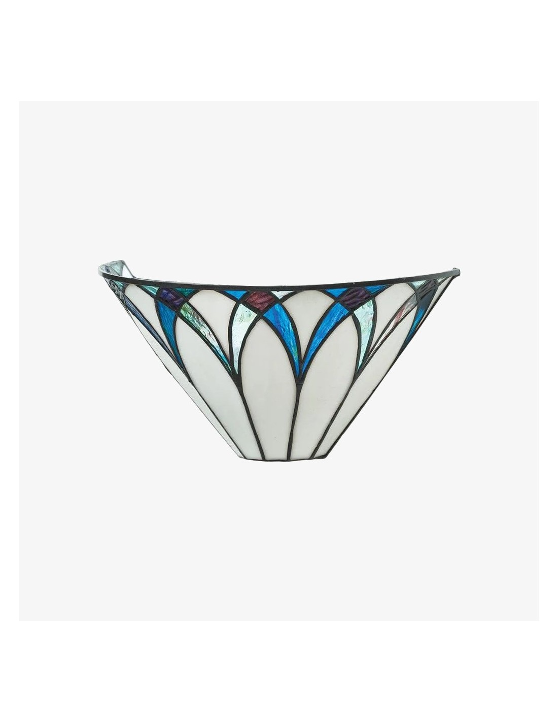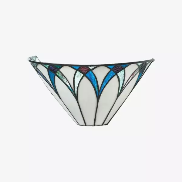Il paralume da parete artigianale TF Allanton è caratterizzato da vetri colorati intarsiati con strisce di piombo e incastonati in una base in metallo. Il motivo Art Déco e il vetro stratificato creano una luce calda, simile a quella di un gioiello. Perfetto per soggiorni, corridoi e altri spazi.