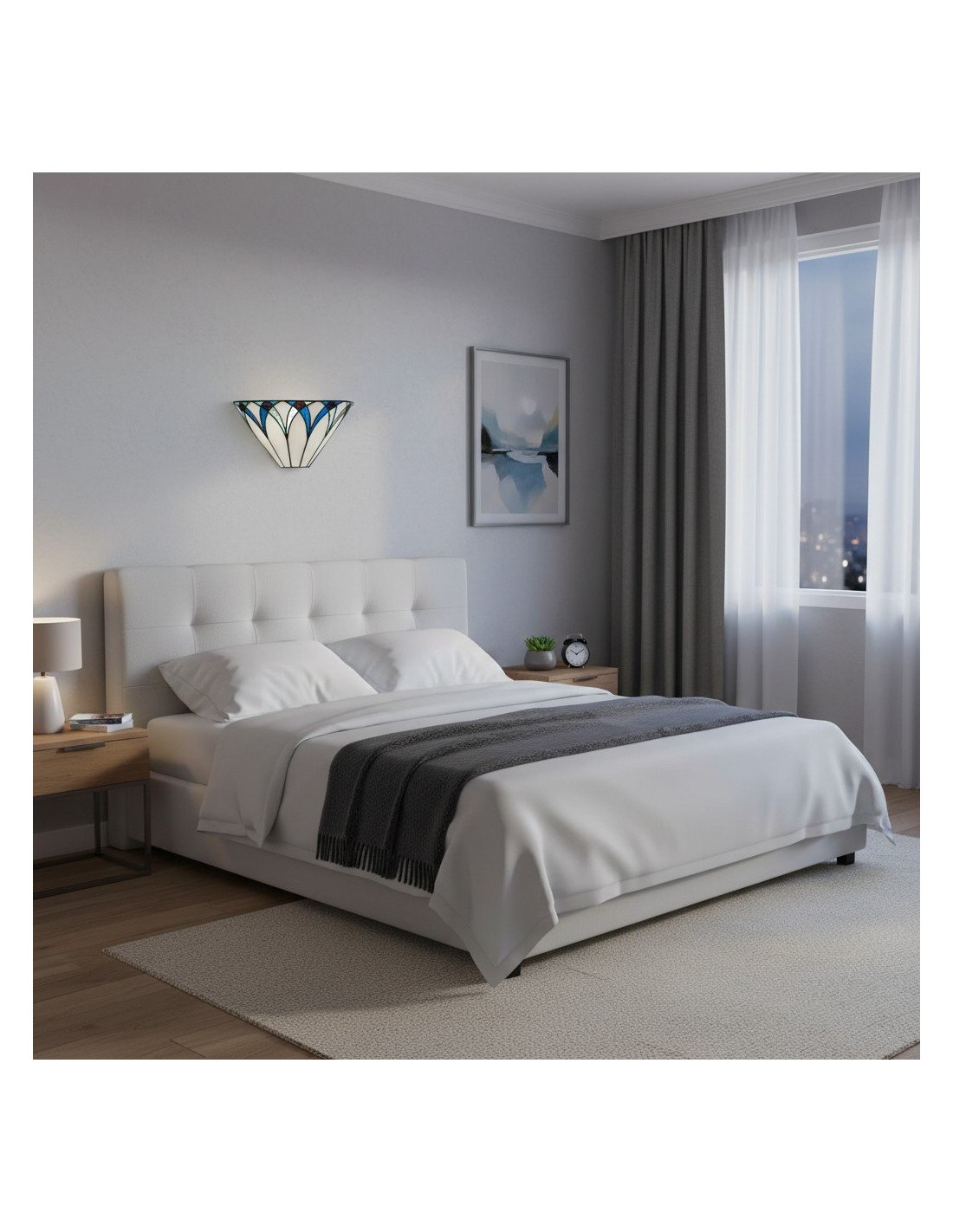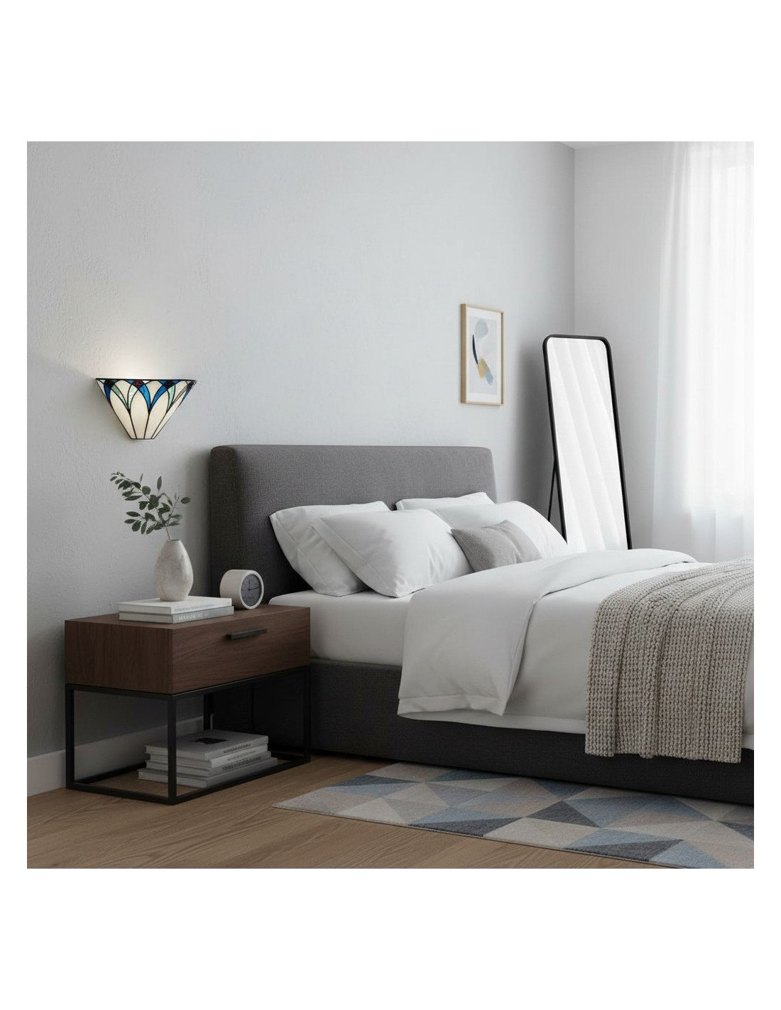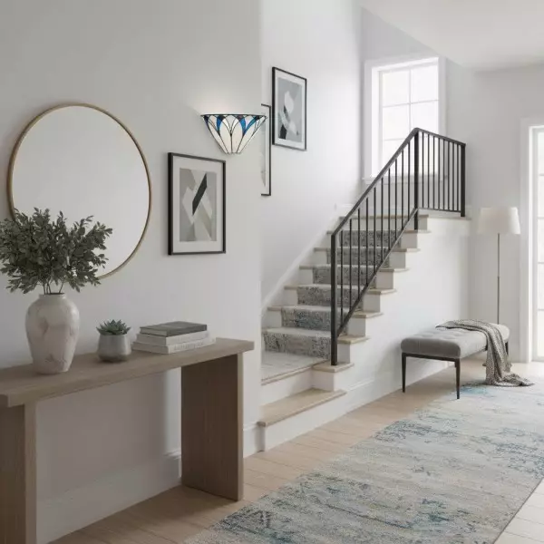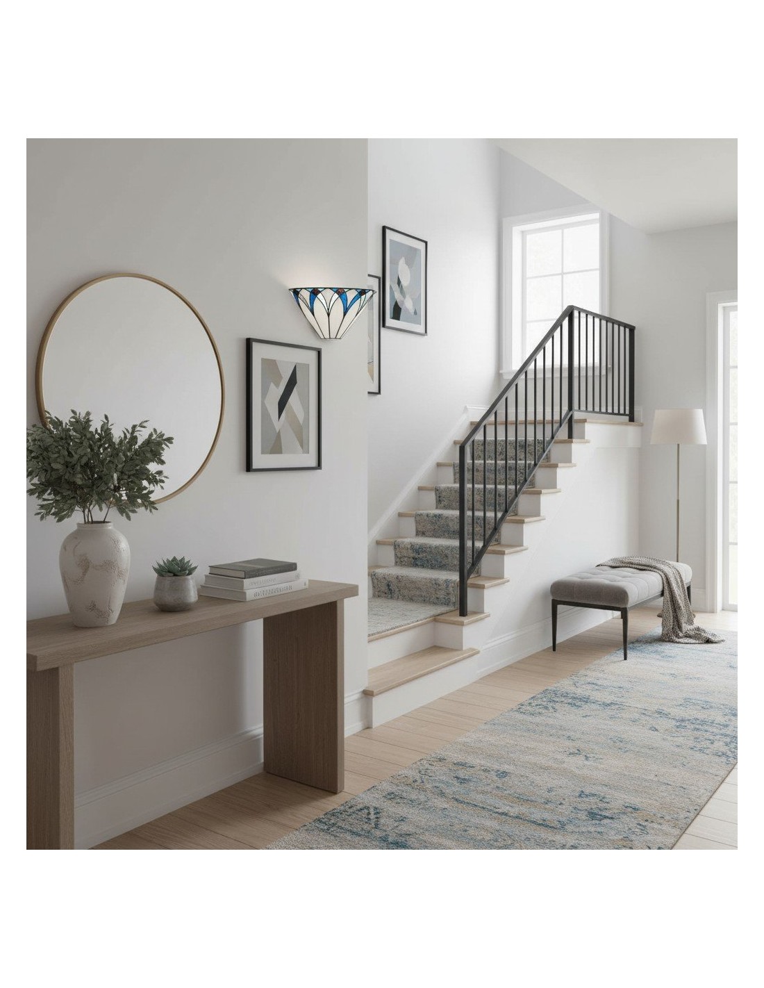 Il paralume da parete artigianale TF Allanton è caratterizzato da vetri colorati intarsiati con strisce di piombo e incastonati in una base in metallo. Il motivo Art Déco e il vetro stratificato creano una luce calda, simile a quella di un gioiello. Perfetto per soggiorni, corridoi e altri spazi.