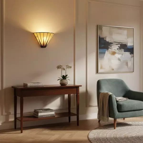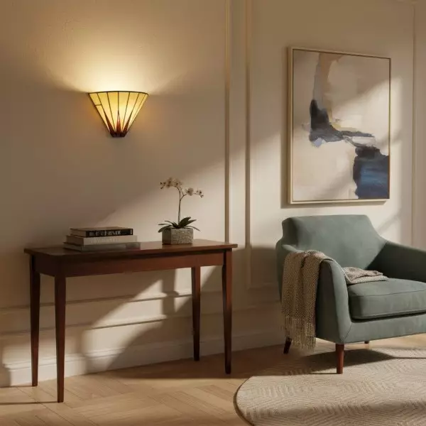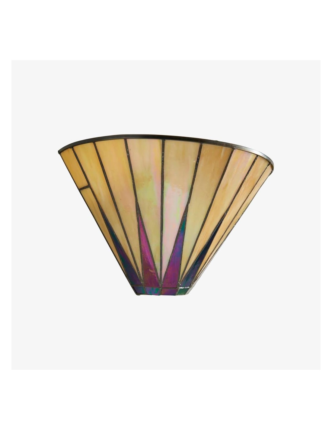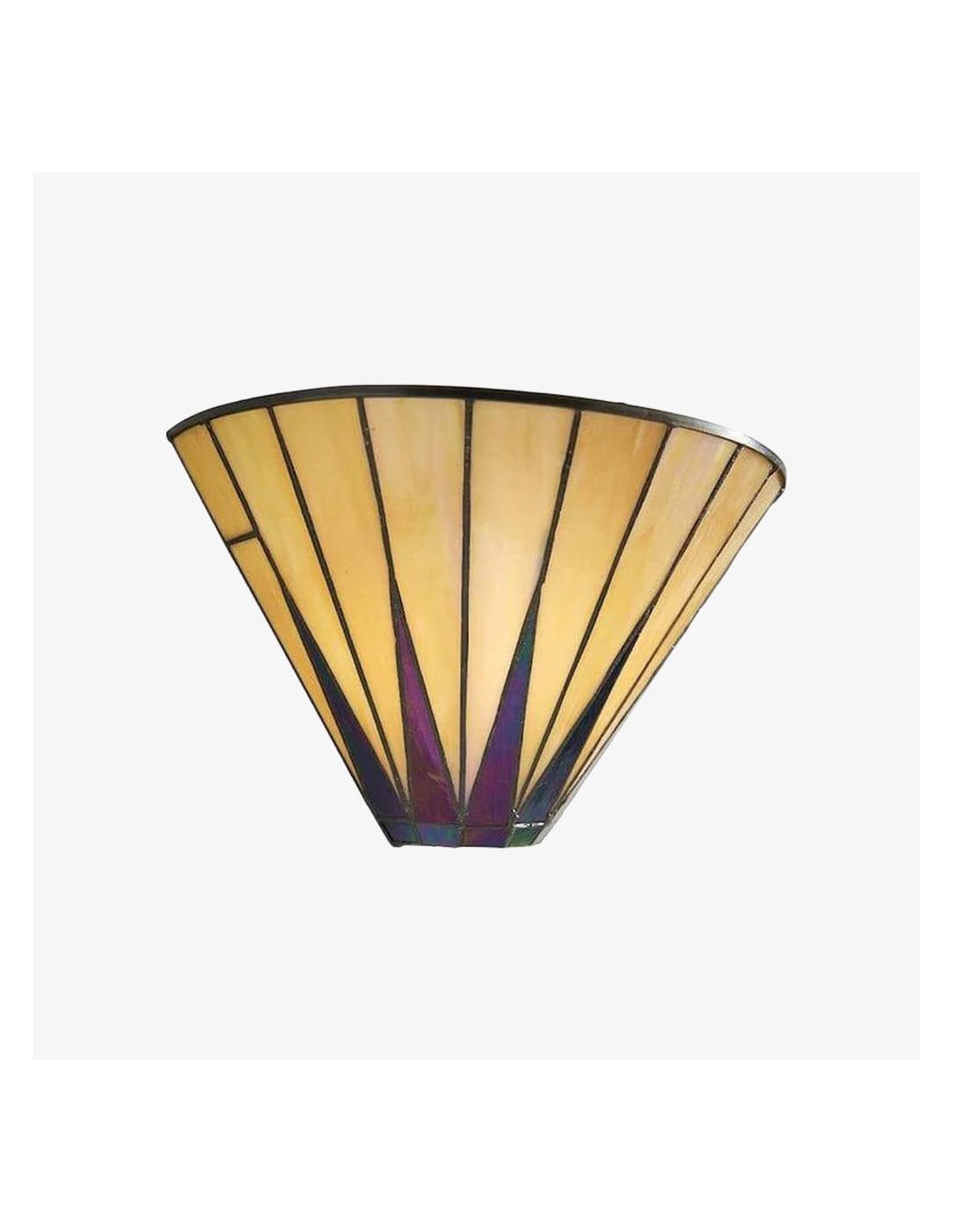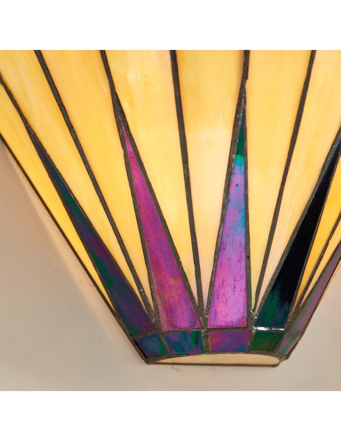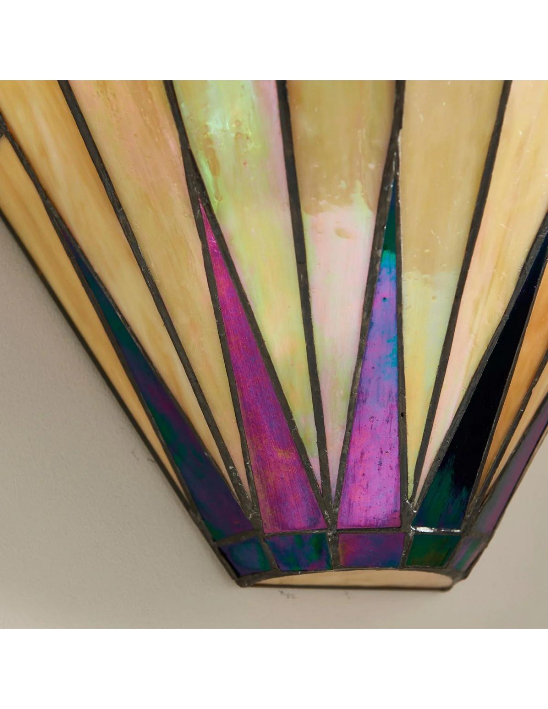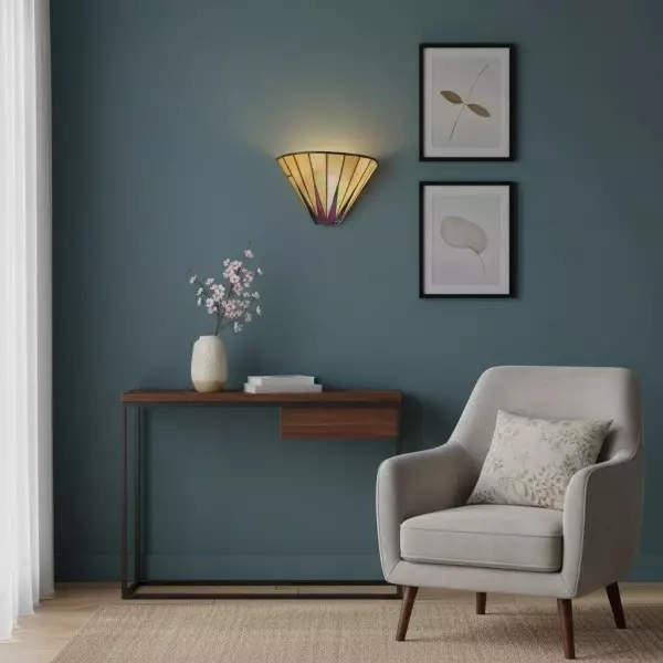 Illumina il tuo spazio con il fascino celestiale della nostra lampada da parete Dark Star Tiffany. Questa squisita applique presenta un accattivante motivo a stella, realizzato a mano da singoli pezzi di vetro artistico di alta qualità in tonalità intense e contrastanti.