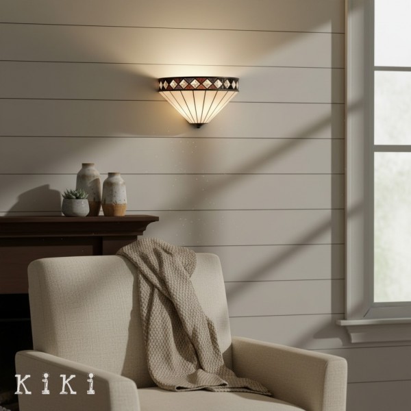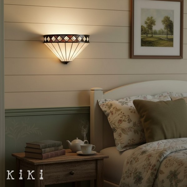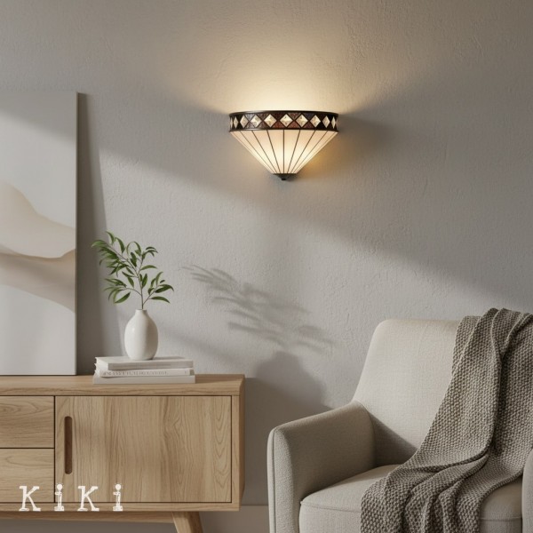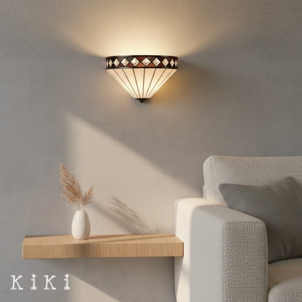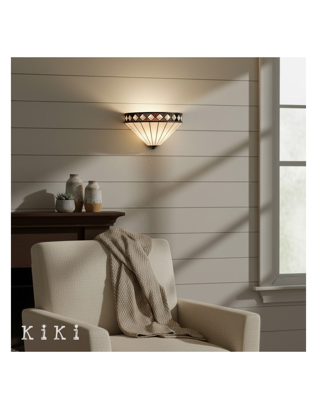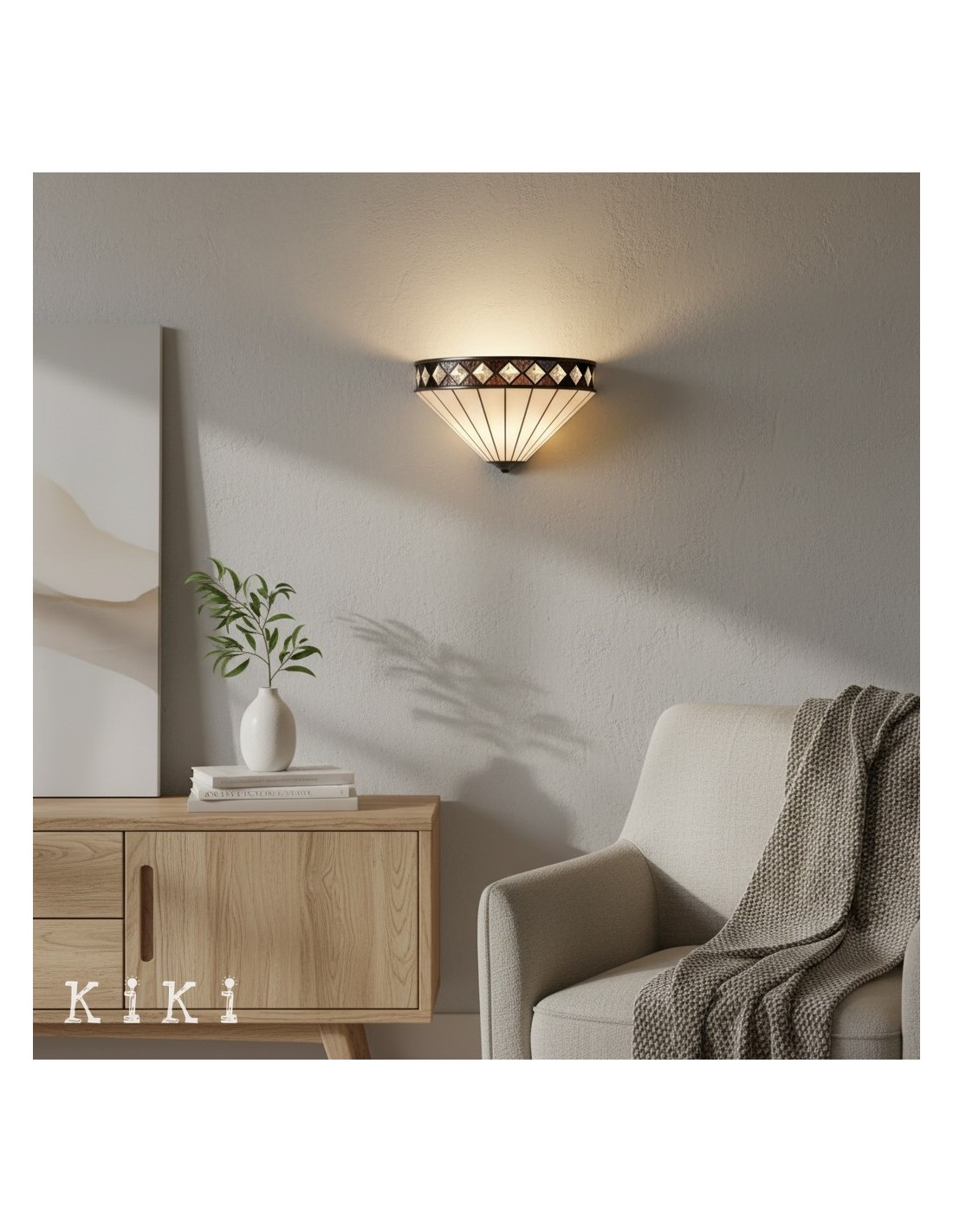 Valorizza la tua casa con questa applique ispirata all'Art Déco, caratterizzata da un paralume in vetro lavorato a mano con delicati riflessi iridescenti. Il motivo geometrico a rombi, abbinato a un'elegante struttura in metallo, crea un raffinato tocco decorativo, adatto sia ad interni moderni che classici.