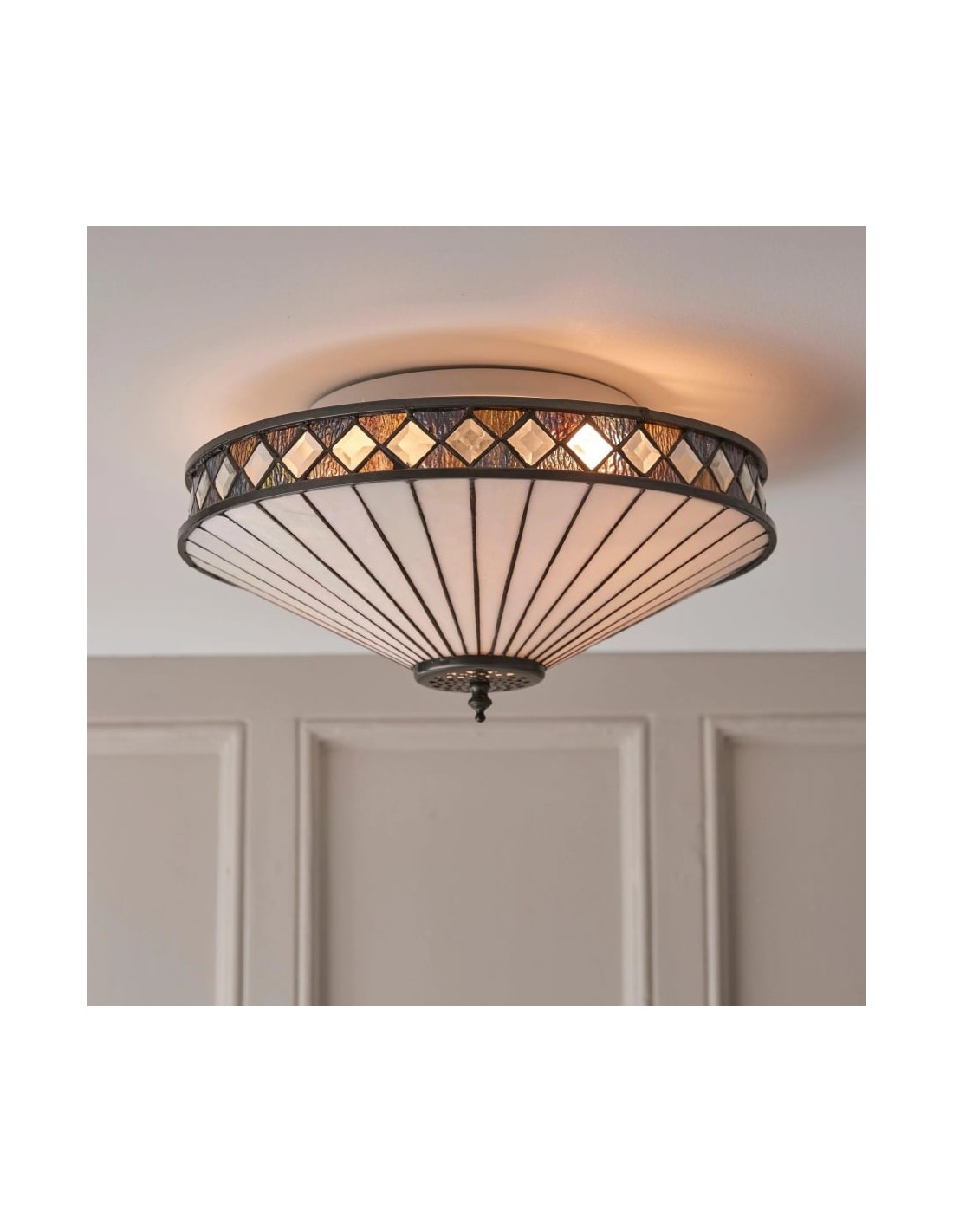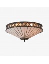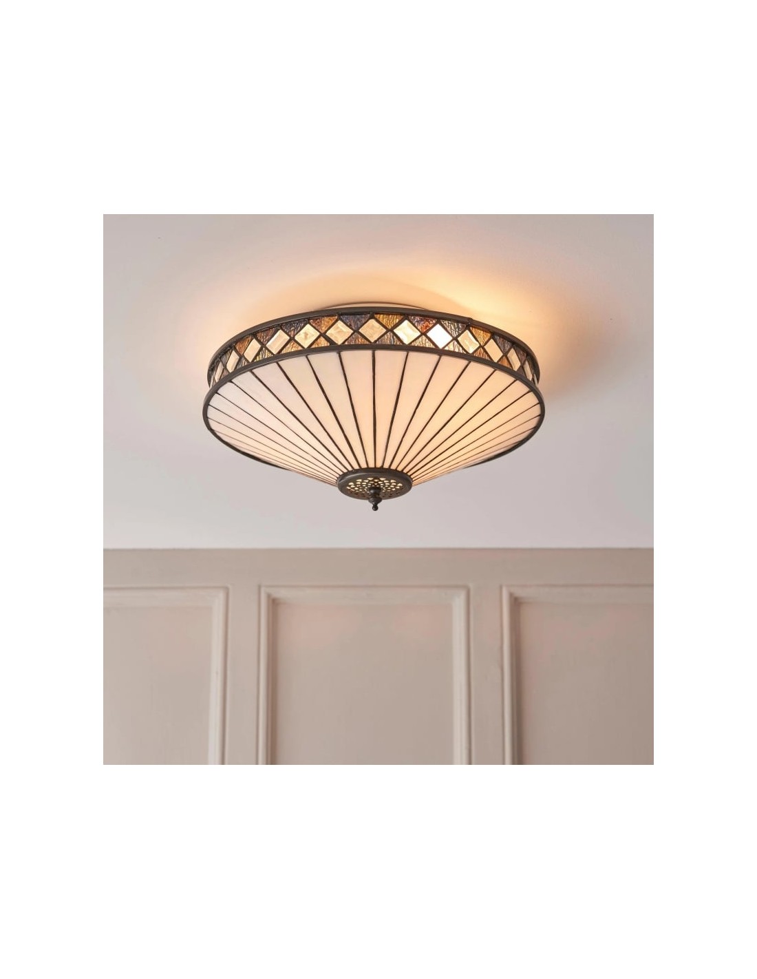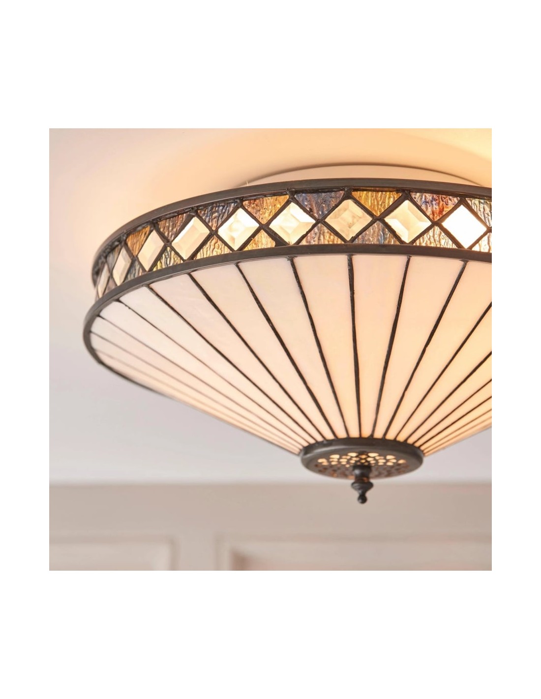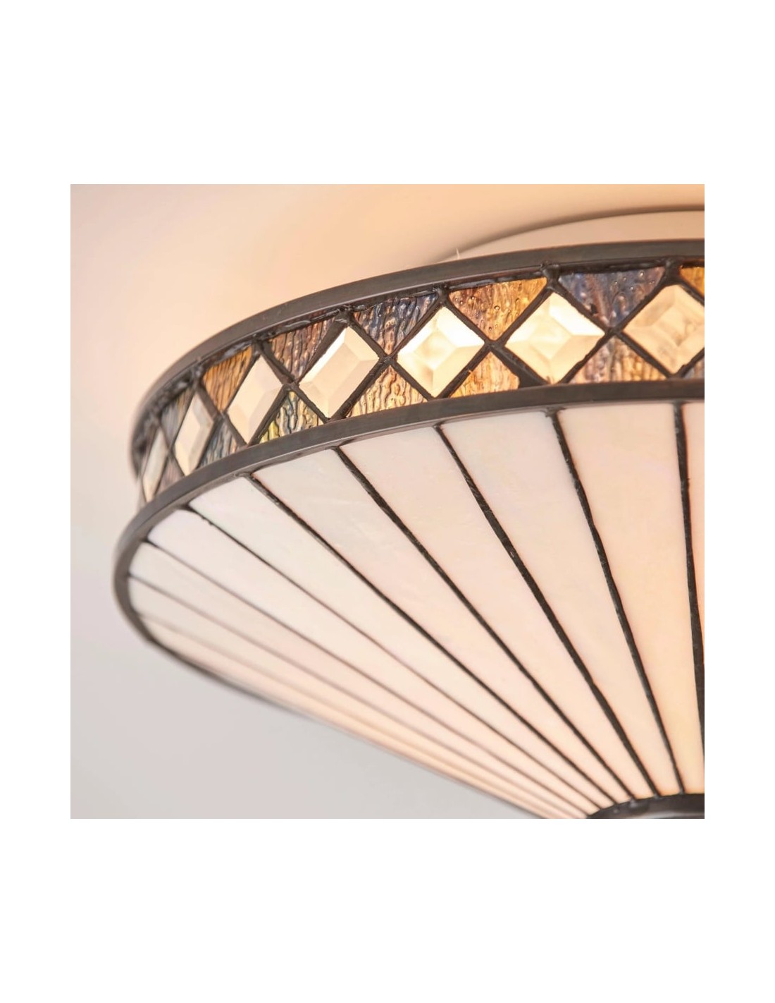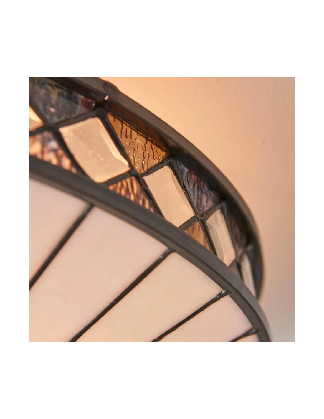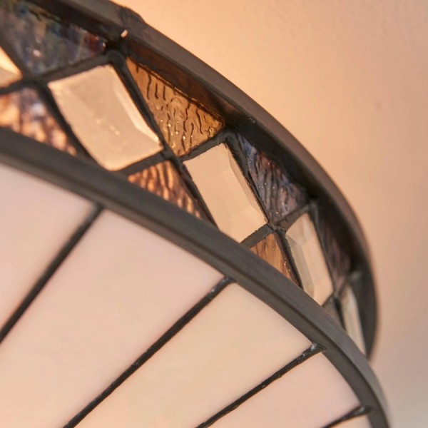Scopri l'eleganza Art Déco senza tempo della collezione TF Fargo. Questa lampada a filo è caratterizzata da un paralume in stile Tiffany realizzato a mano con vetri colorati color crema e ambra iridescenti, che creano un audace motivo geometrico. Il suo design discreto è perfetto per soffitti bassi, diffondendo una luce calda e accogliente in qualsiasi stanza.