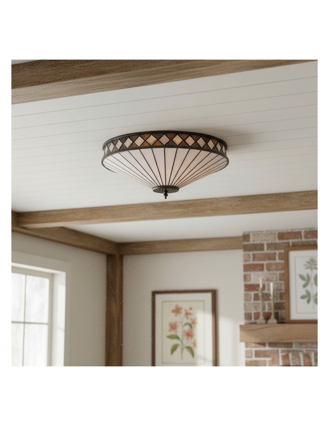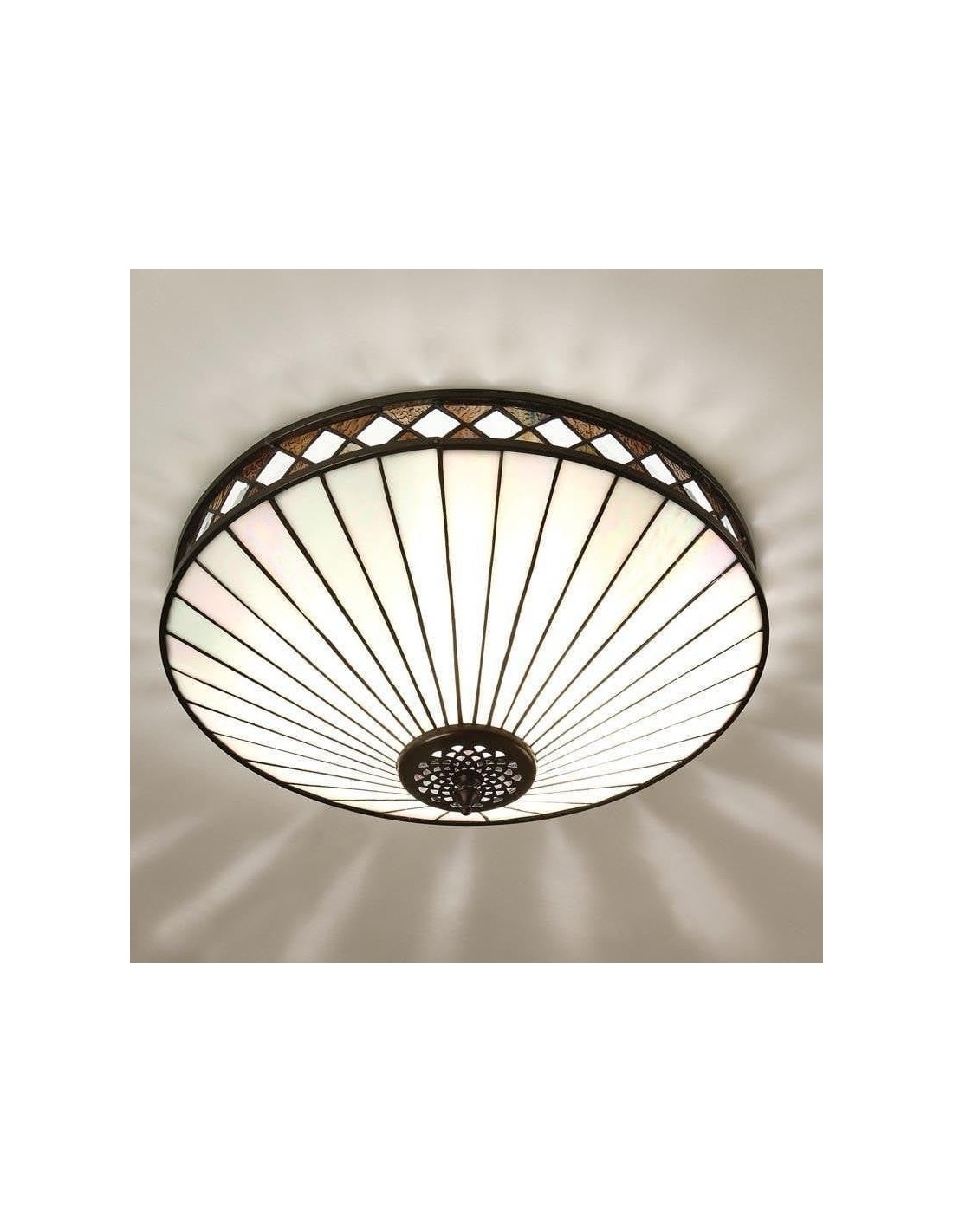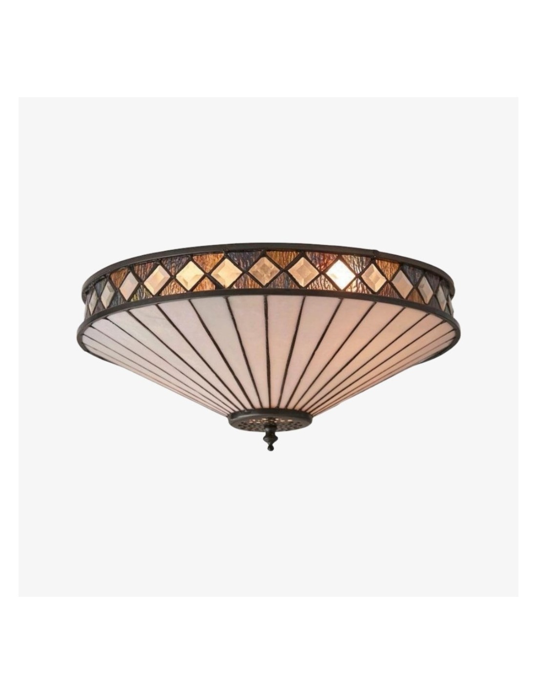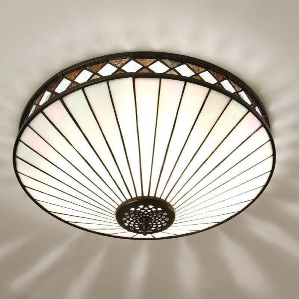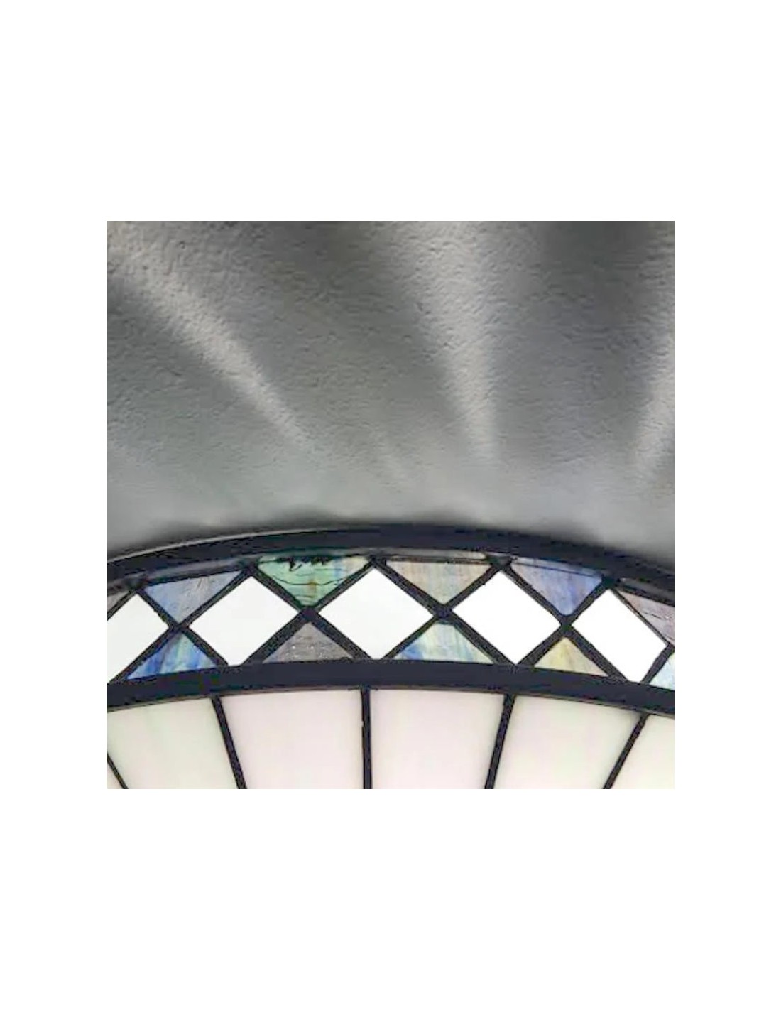 Scopri l'eleganza Art Déco senza tempo della collezione TF Fargo. Questa lampada a filo è caratterizzata da un paralume in stile Tiffany realizzato a mano con vetri colorati color crema e ambra iridescenti, che creano un audace motivo geometrico. Il suo design discreto è perfetto per soffitti bassi, diffondendo una luce calda e accogliente in qualsiasi stanza.