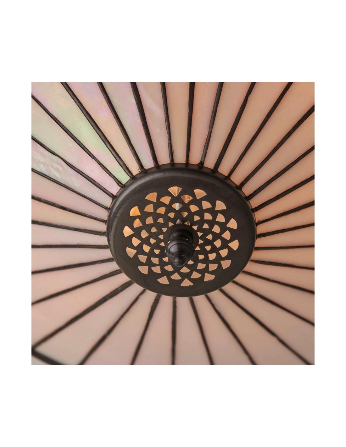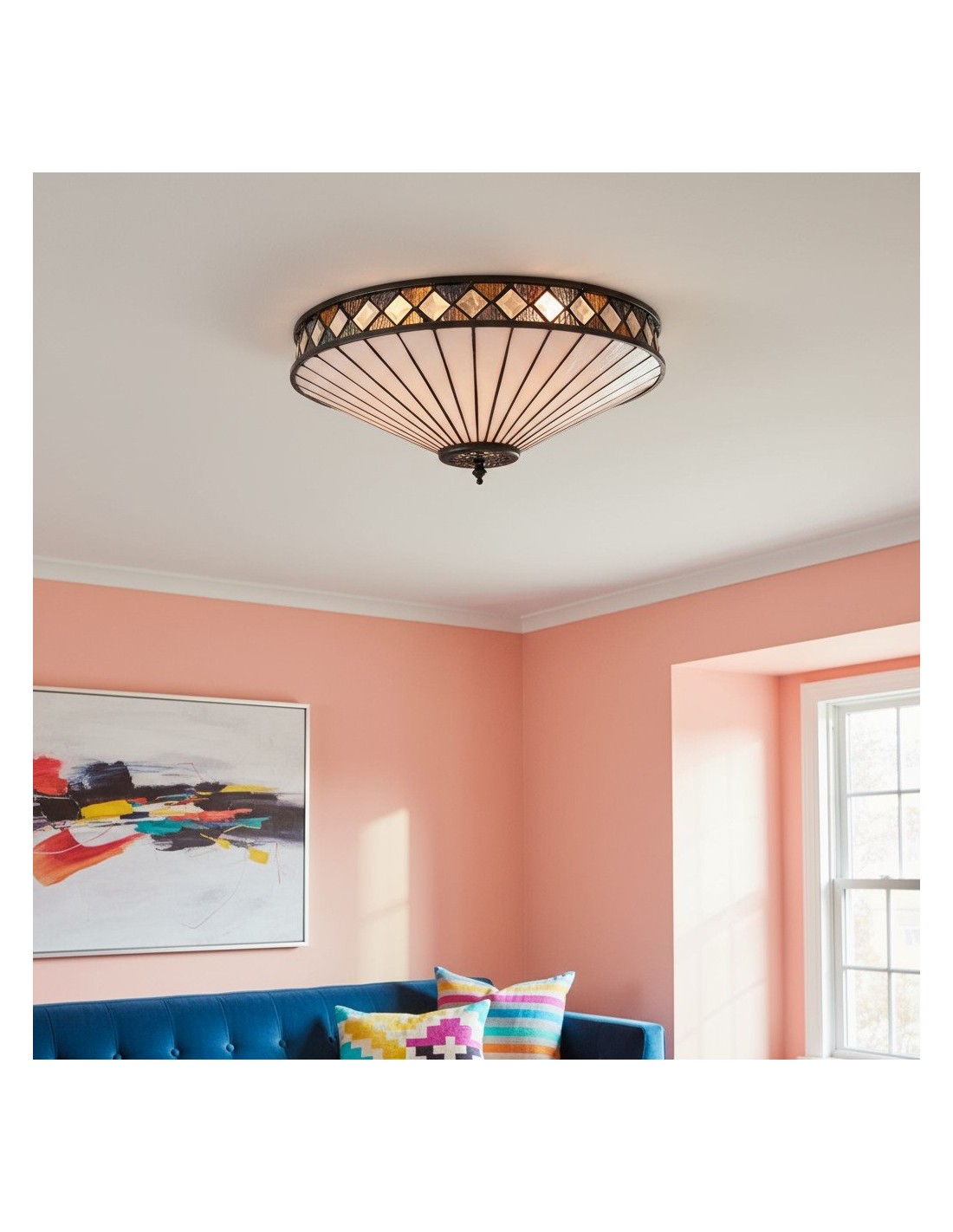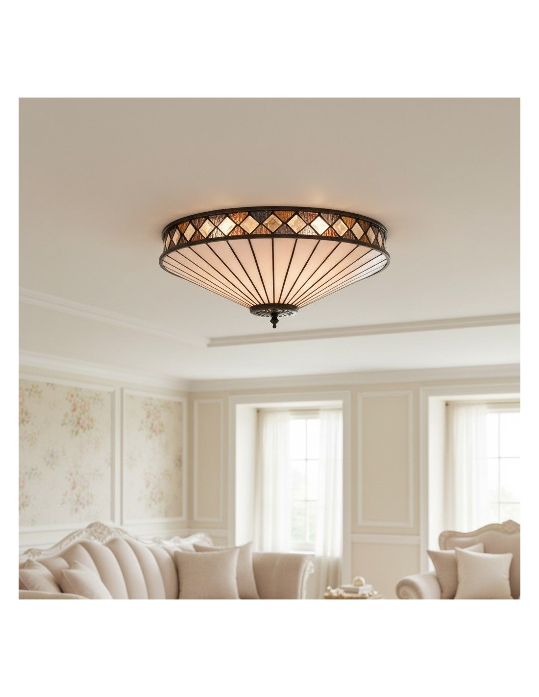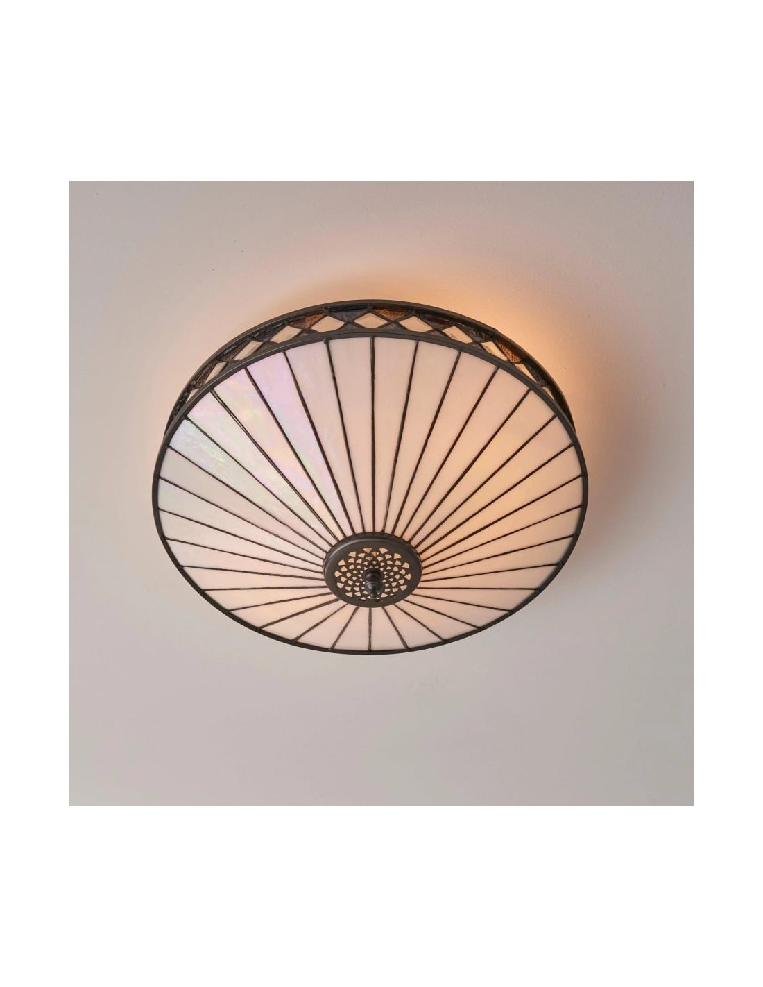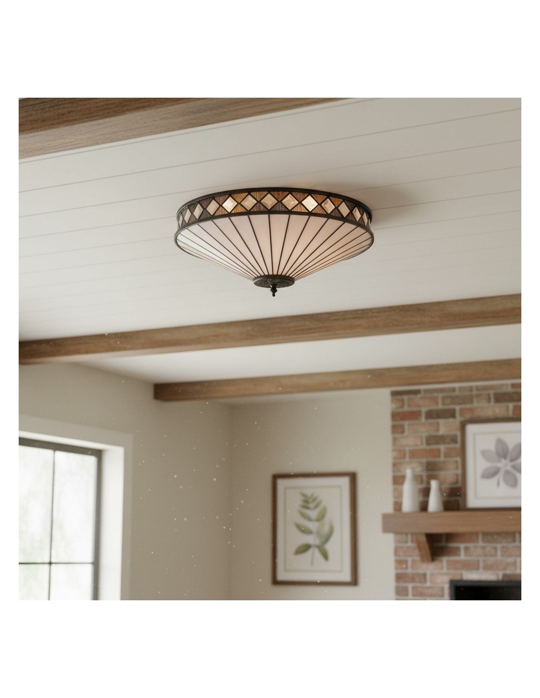 Scopri l'eleganza Art Déco senza tempo della collezione TF Fargo. Questa lampada a filo è caratterizzata da un paralume in stile Tiffany realizzato a mano con vetri colorati color crema e ambra iridescenti, che creano un audace motivo geometrico. Il suo design discreto è perfetto per soffitti bassi, diffondendo una luce calda e accogliente in qualsiasi stanza.