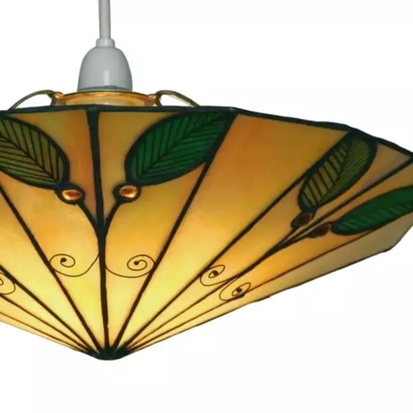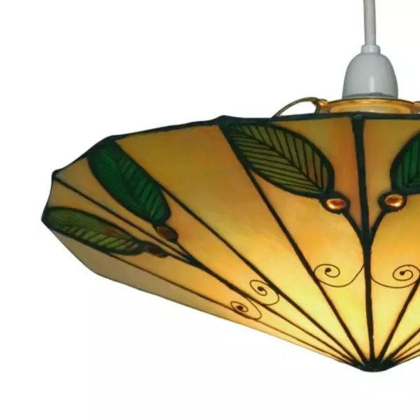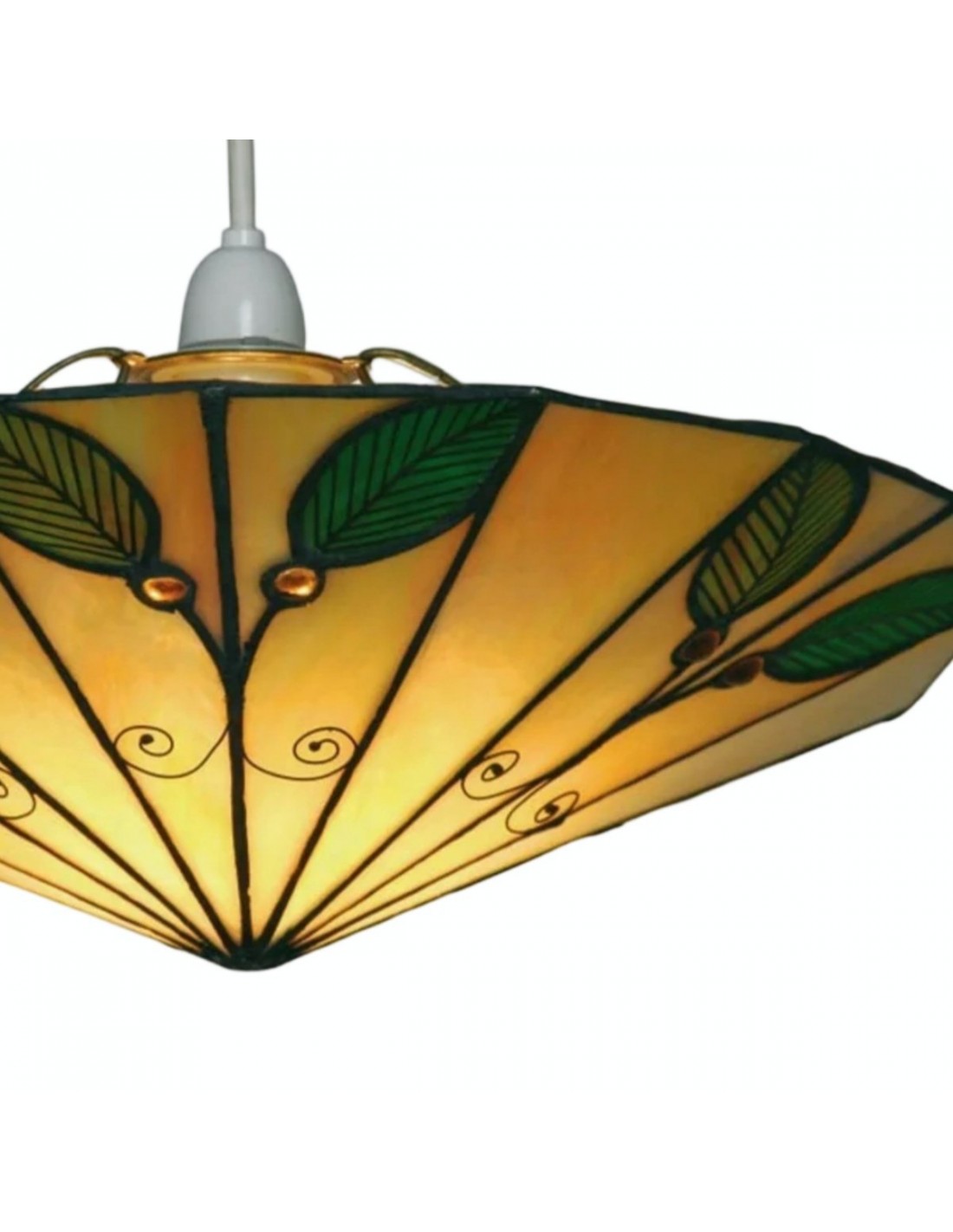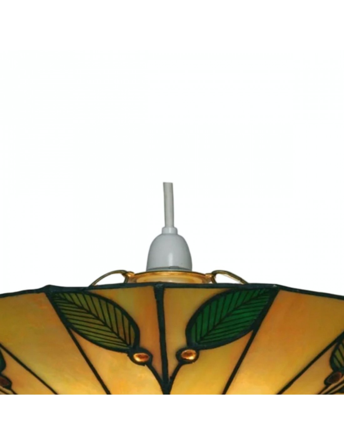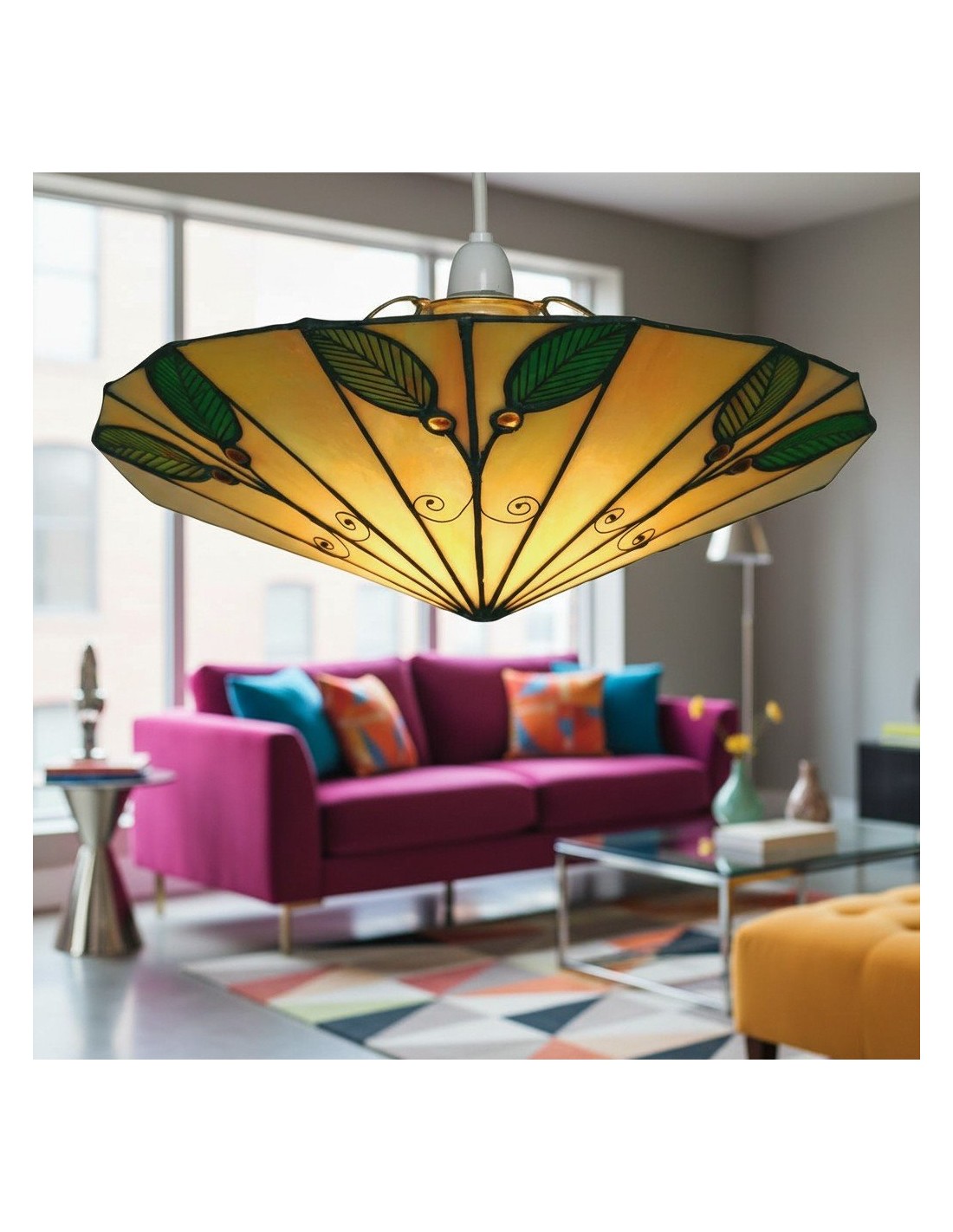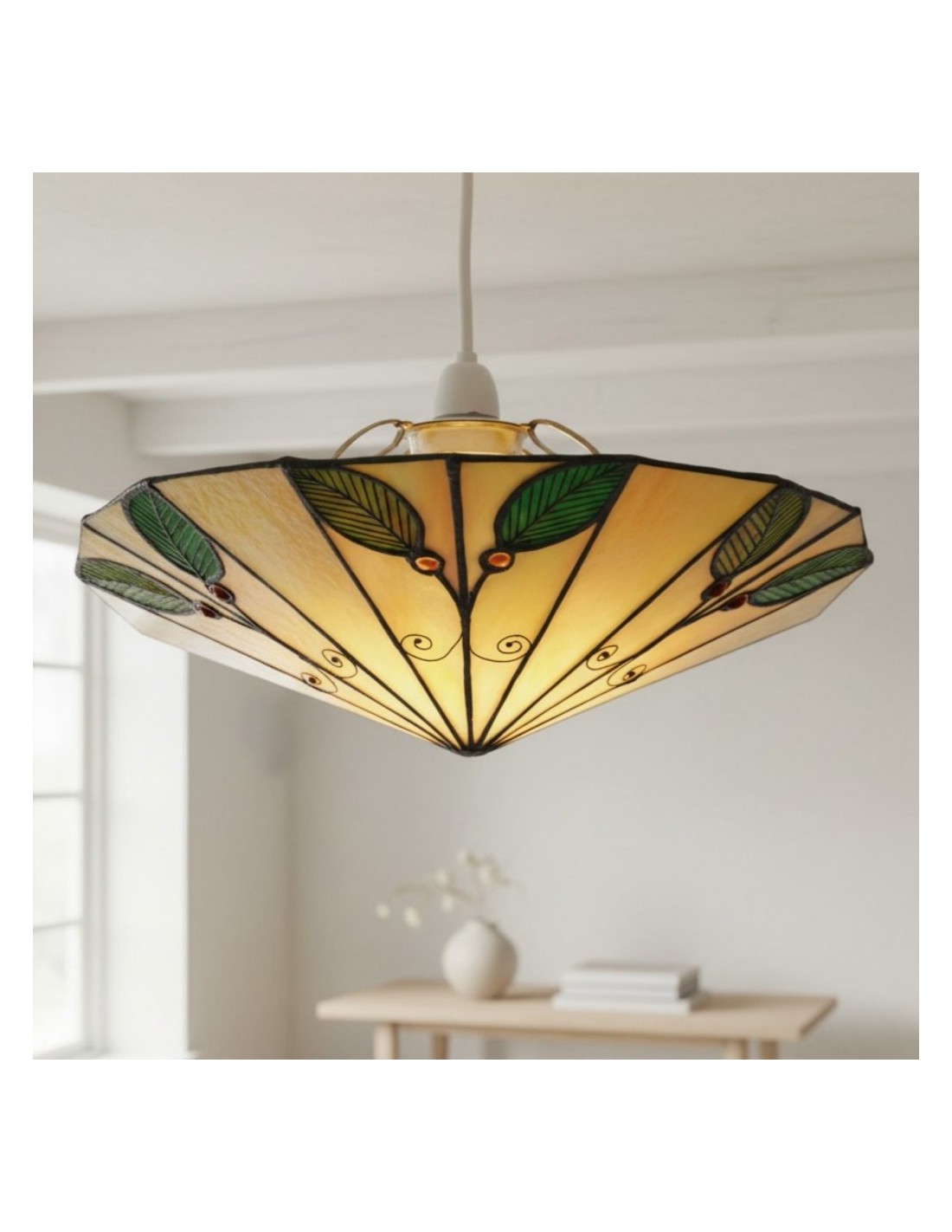 Trasforma i tuoi interni con questo splendido paralume in stile Tiffany di TF Harken. Realizzato a mano in vivaci vetrate colorate con un intricato motivo a foglie, diffonde una luce calda e colorata.
