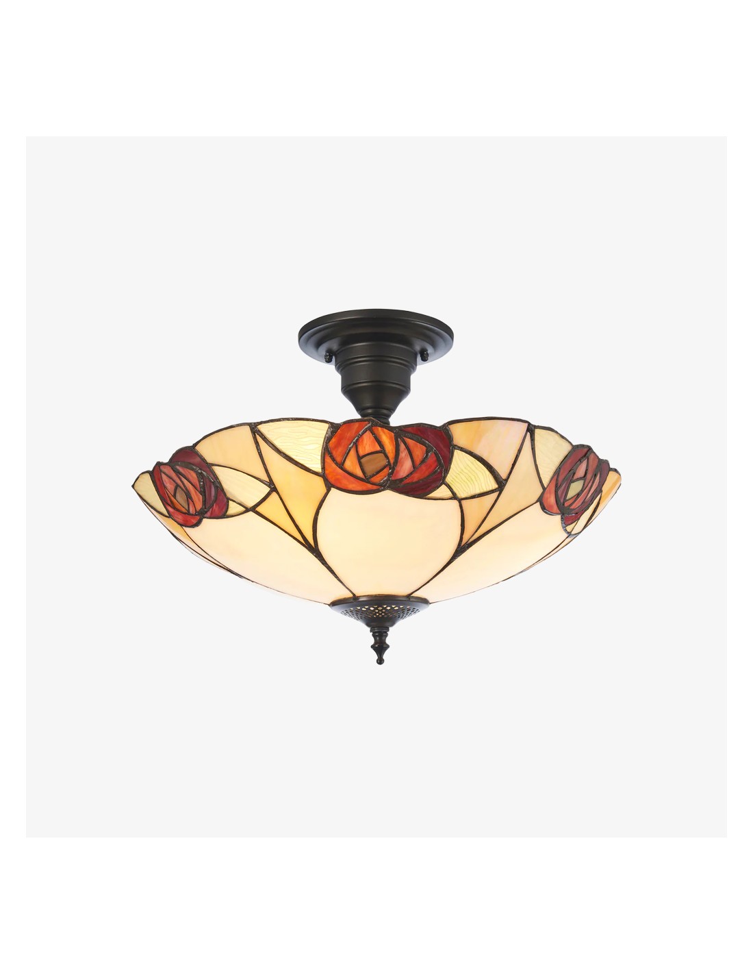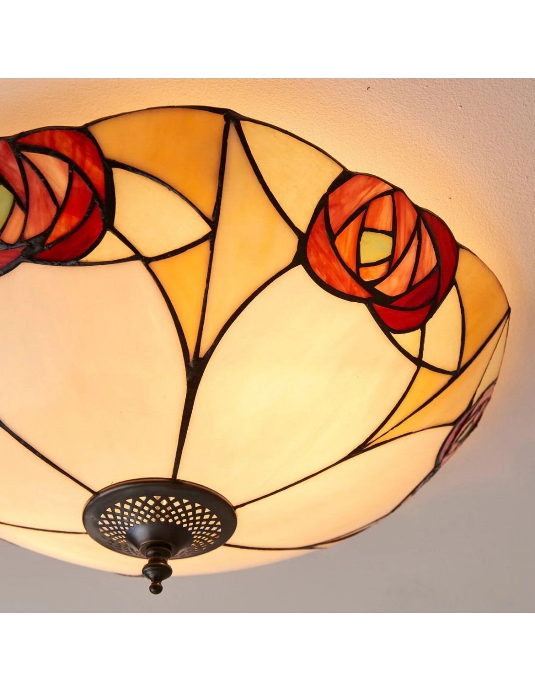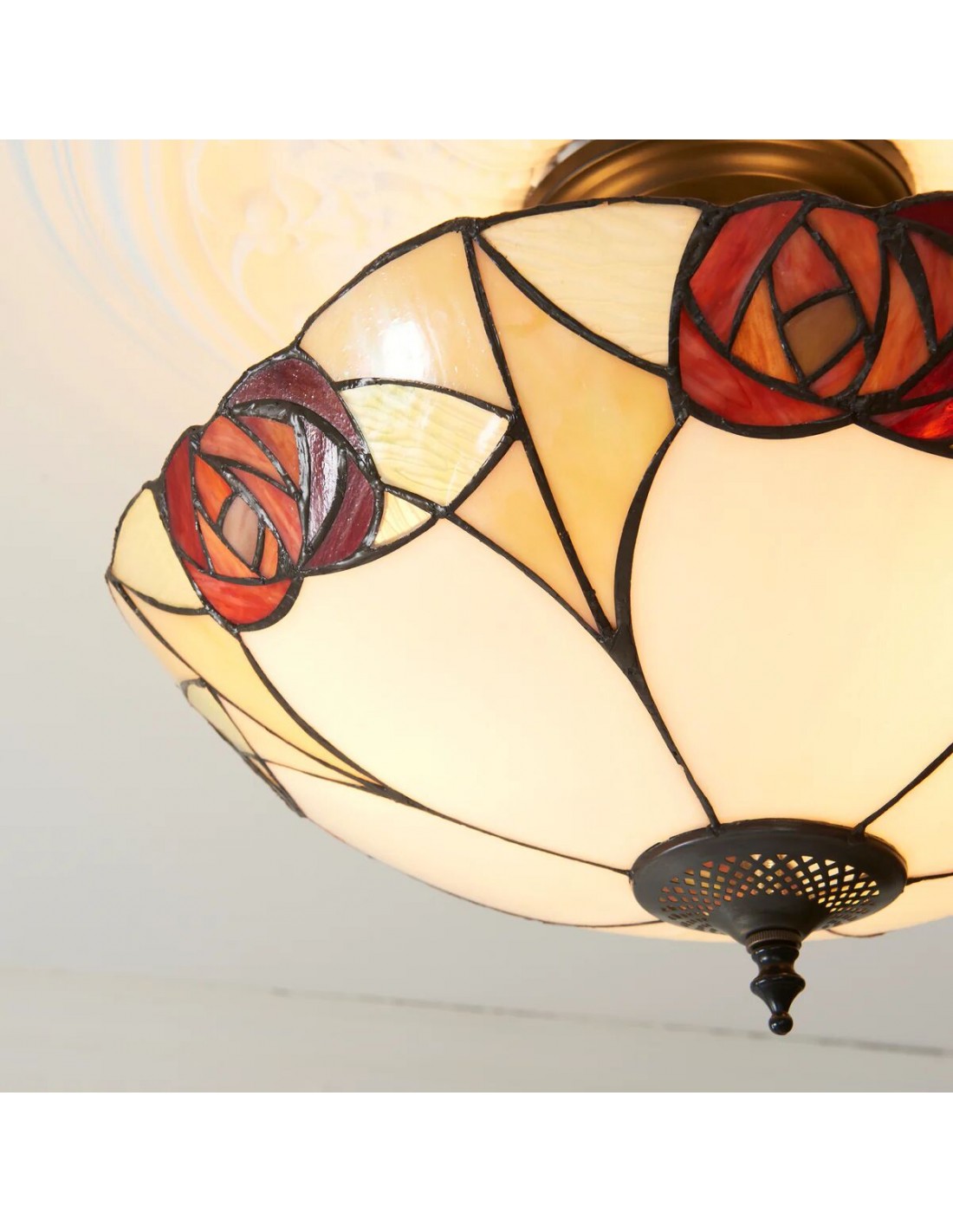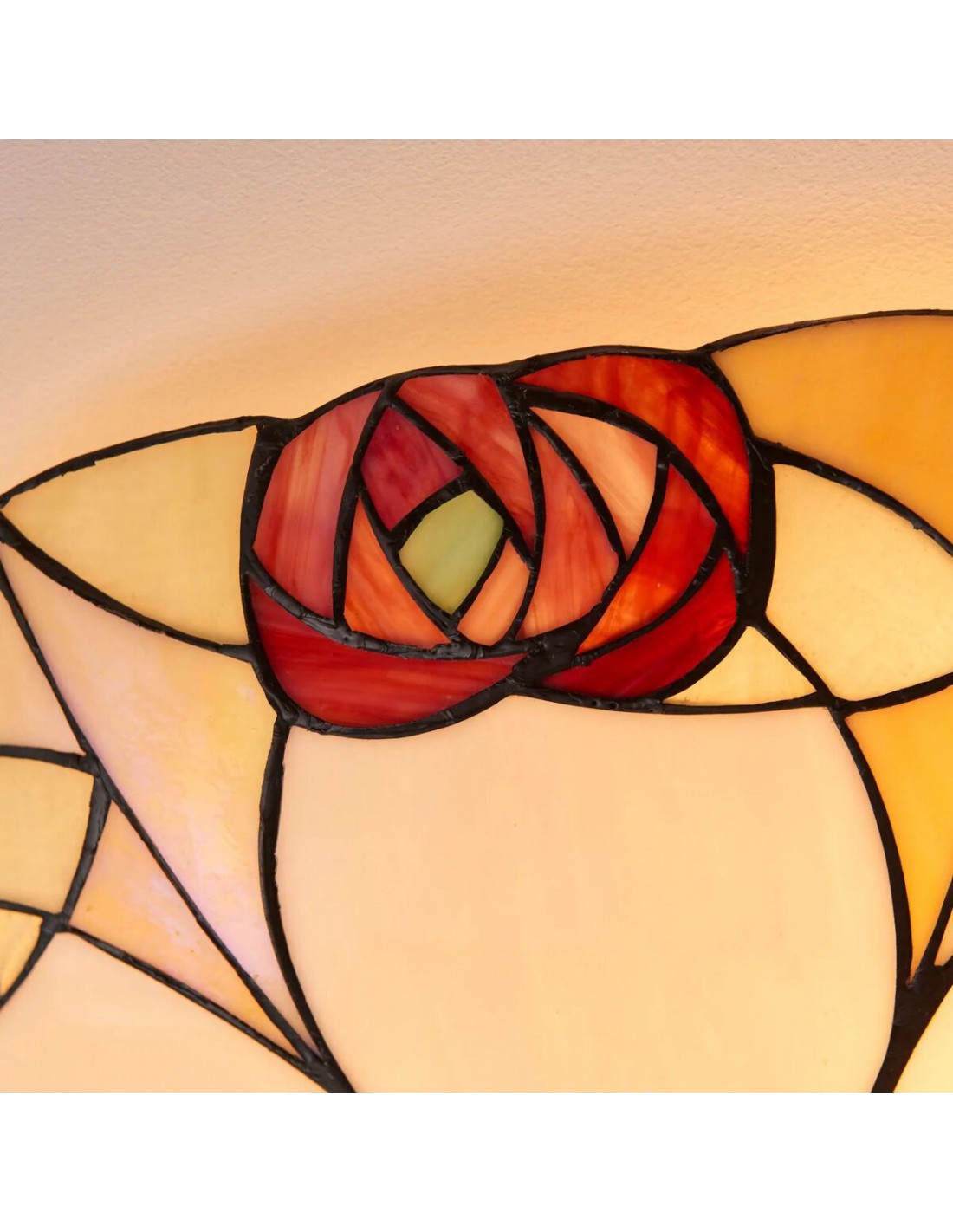 Ogni lampada da soffitto è un capolavoro di design geometrico, con pannelli di vetro colorato realizzati a mano, meticolosamente assemblati nel tradizionale stile Tiffany. I motivi intricati creano una luce calda e accogliente che trasforma qualsiasi spazio con il suo fascino vintage.