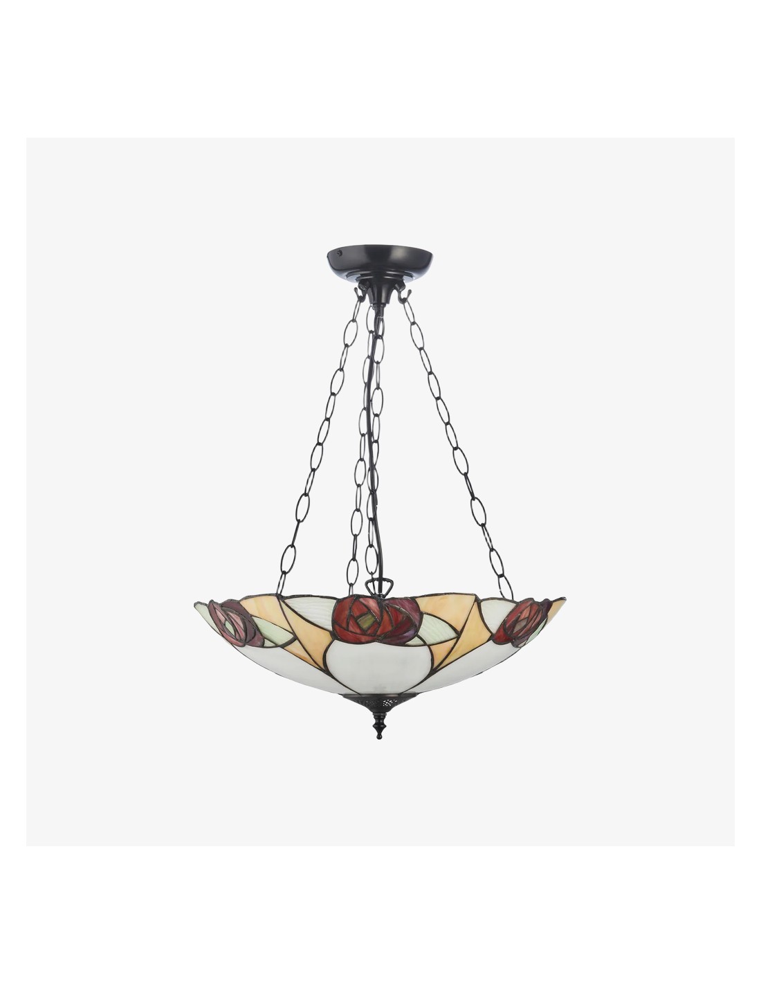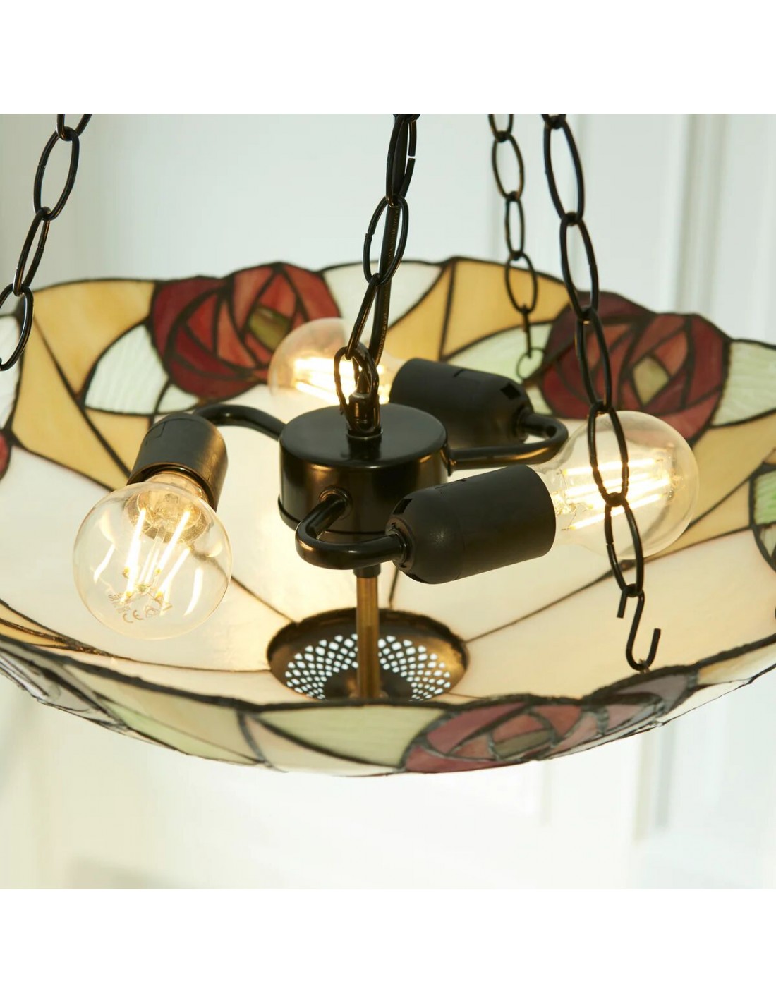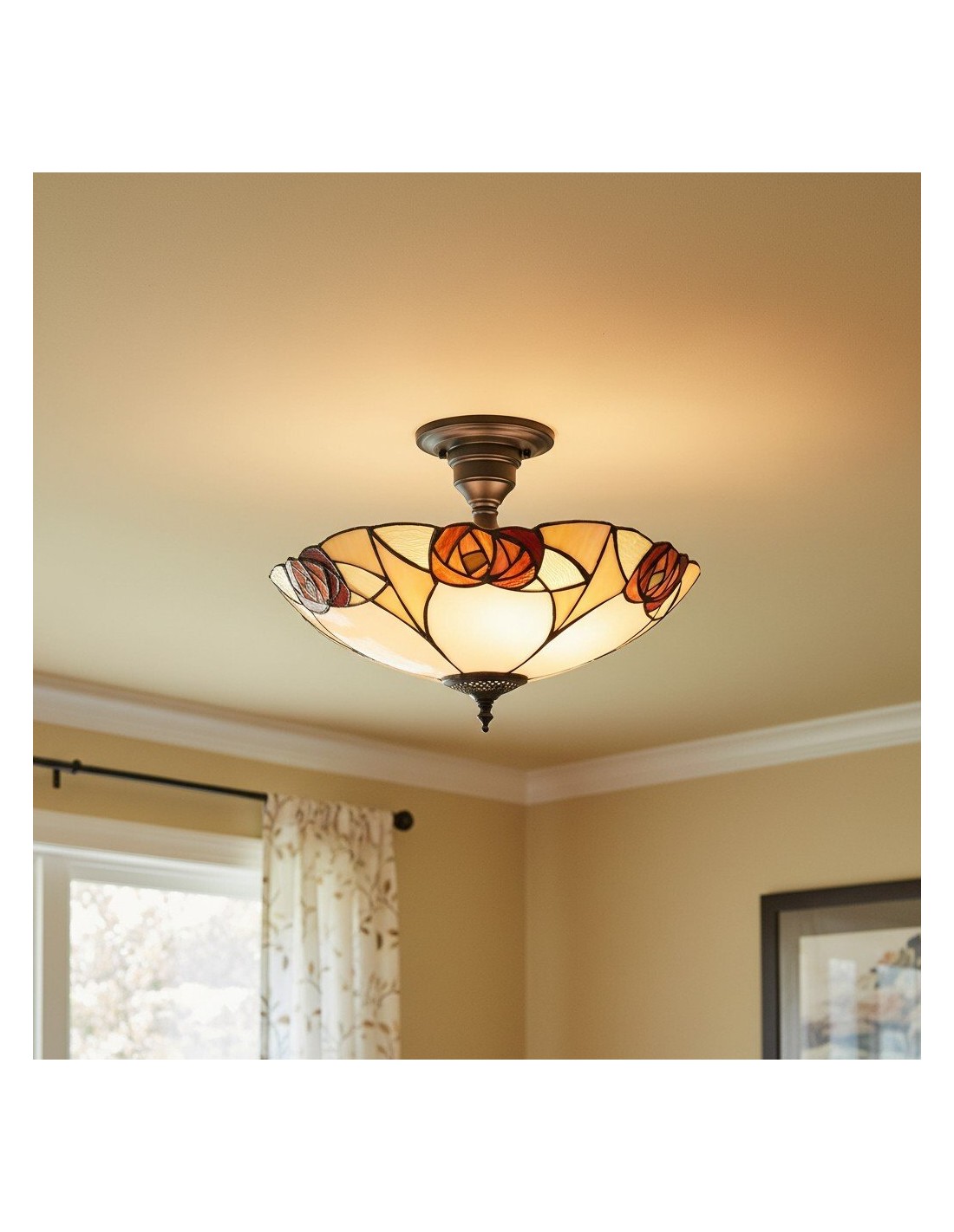 Ogni lampada da soffitto è un capolavoro di design geometrico, con pannelli di vetro colorato realizzati a mano, meticolosamente assemblati nel tradizionale stile Tiffany. I motivi intricati creano una luce calda e accogliente che trasforma qualsiasi spazio con il suo fascino vintage.