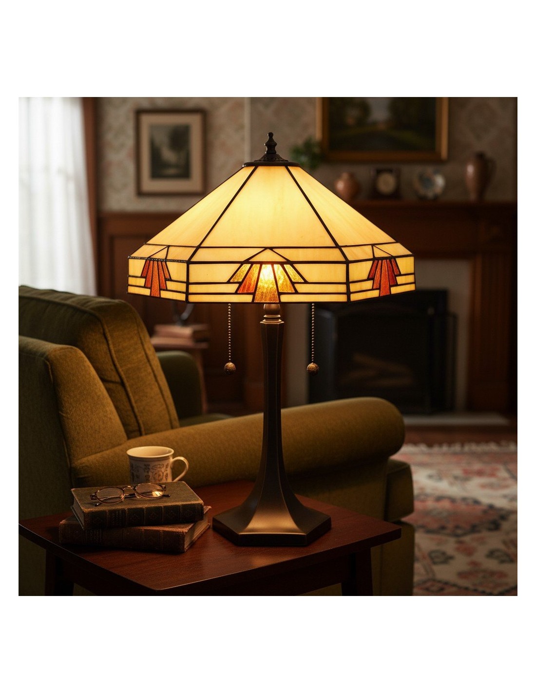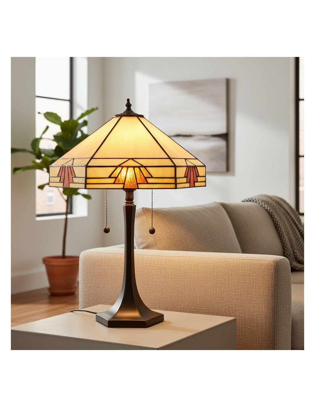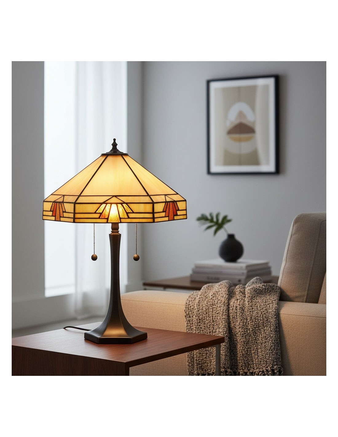 La lampada da tavolo TiffStar Nevada è caratterizzata da vetrate colorate dai toni tenui e caldi, abbinate a linee geometriche nitide, che creano una luce delicatamente radiosa. La base in metallo di ispirazione Art Déco conferisce una presenza solida e raffinata. Perfetta per soggiorni, camere da letto o studi, ideale per l'illuminazione d'ambiente o da lavoro.
