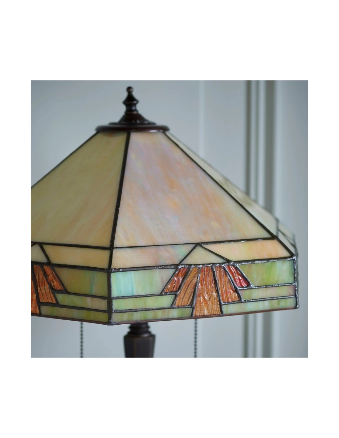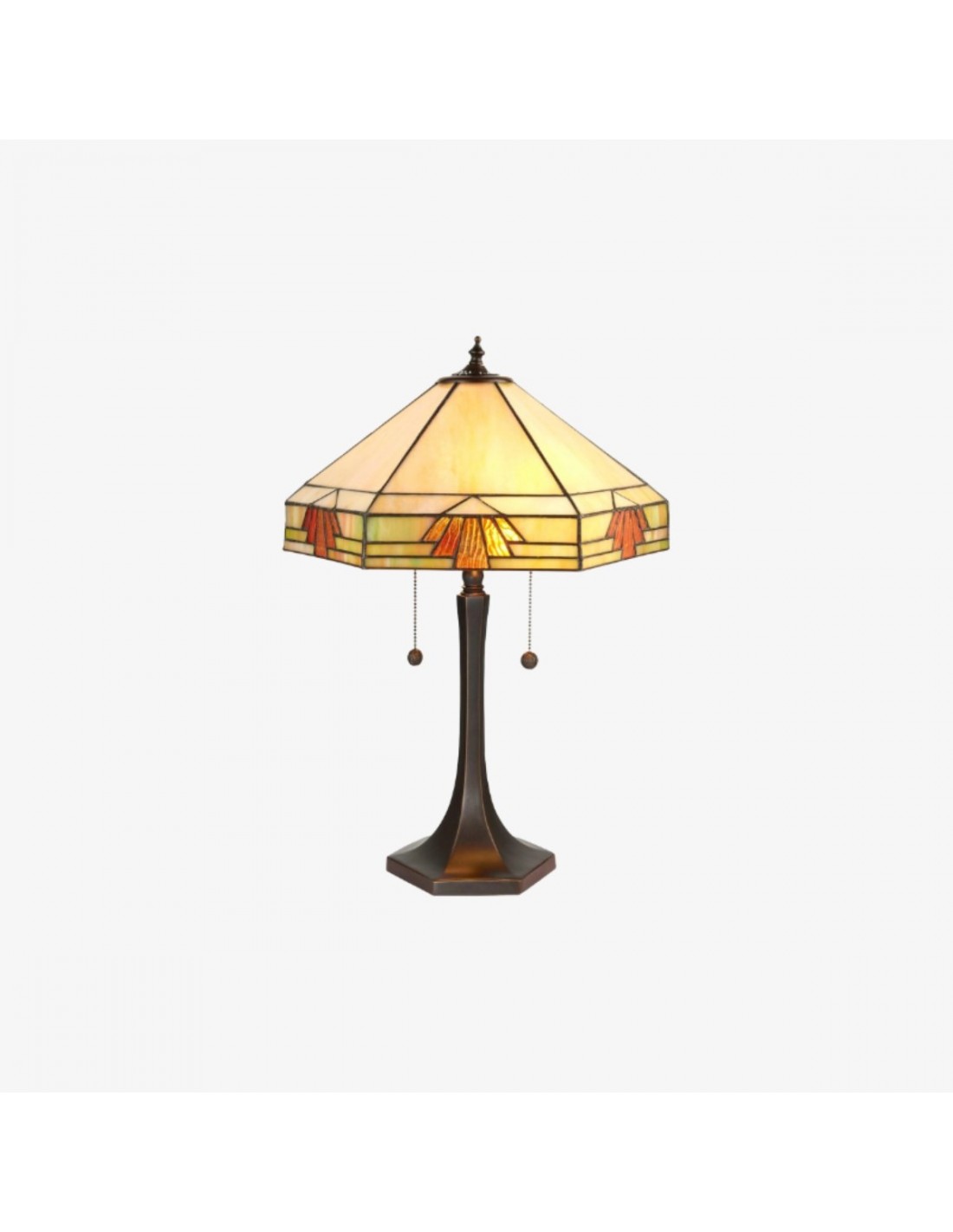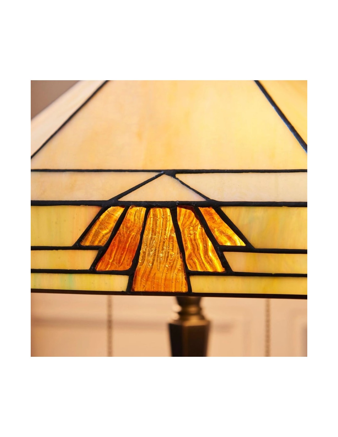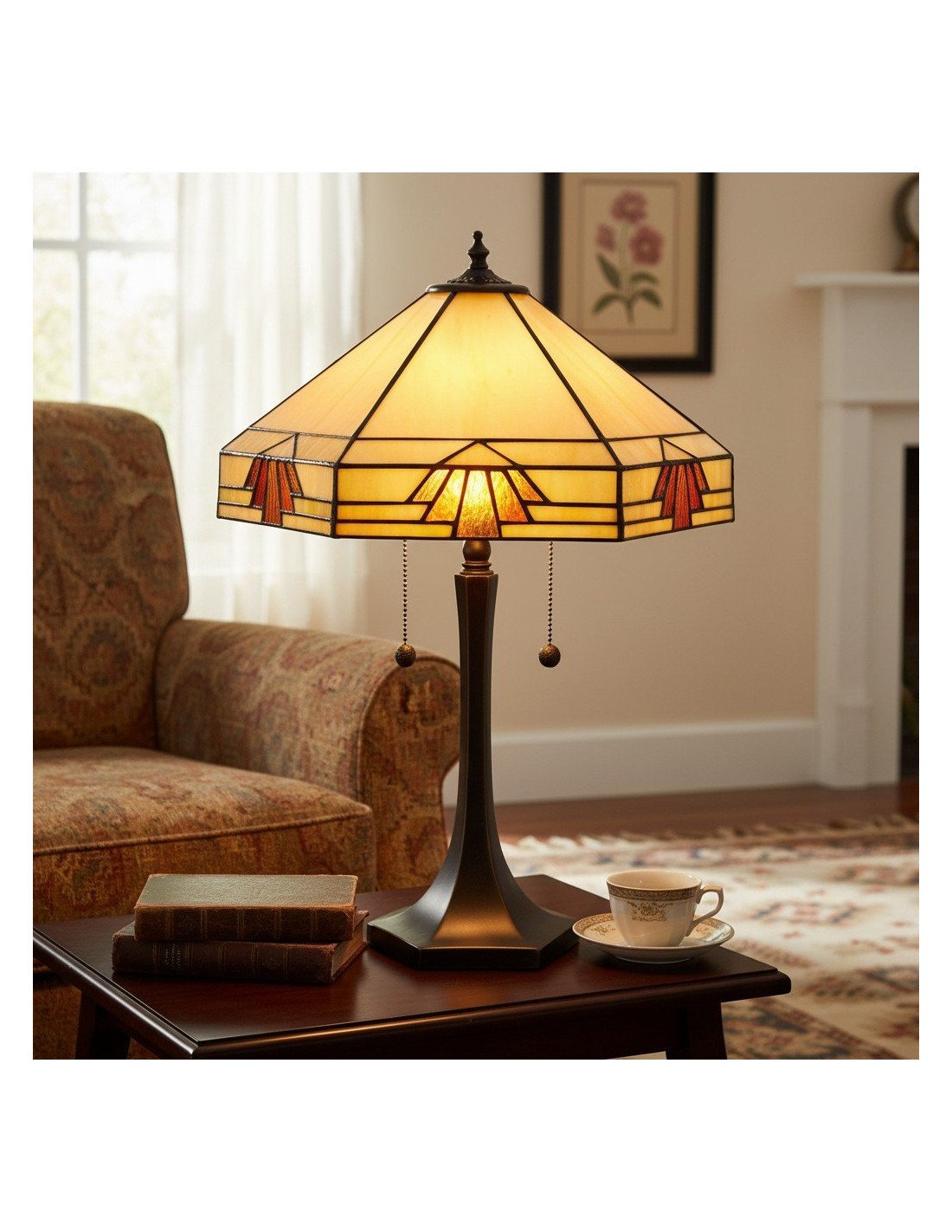 La lampada da tavolo TiffStar Nevada è caratterizzata da vetrate colorate dai toni tenui e caldi, abbinate a linee geometriche nitide, che creano una luce delicatamente radiosa. La base in metallo di ispirazione Art Déco conferisce una presenza solida e raffinata. Perfetta per soggiorni, camere da letto o studi, ideale per l'illuminazione d'ambiente o da lavoro.