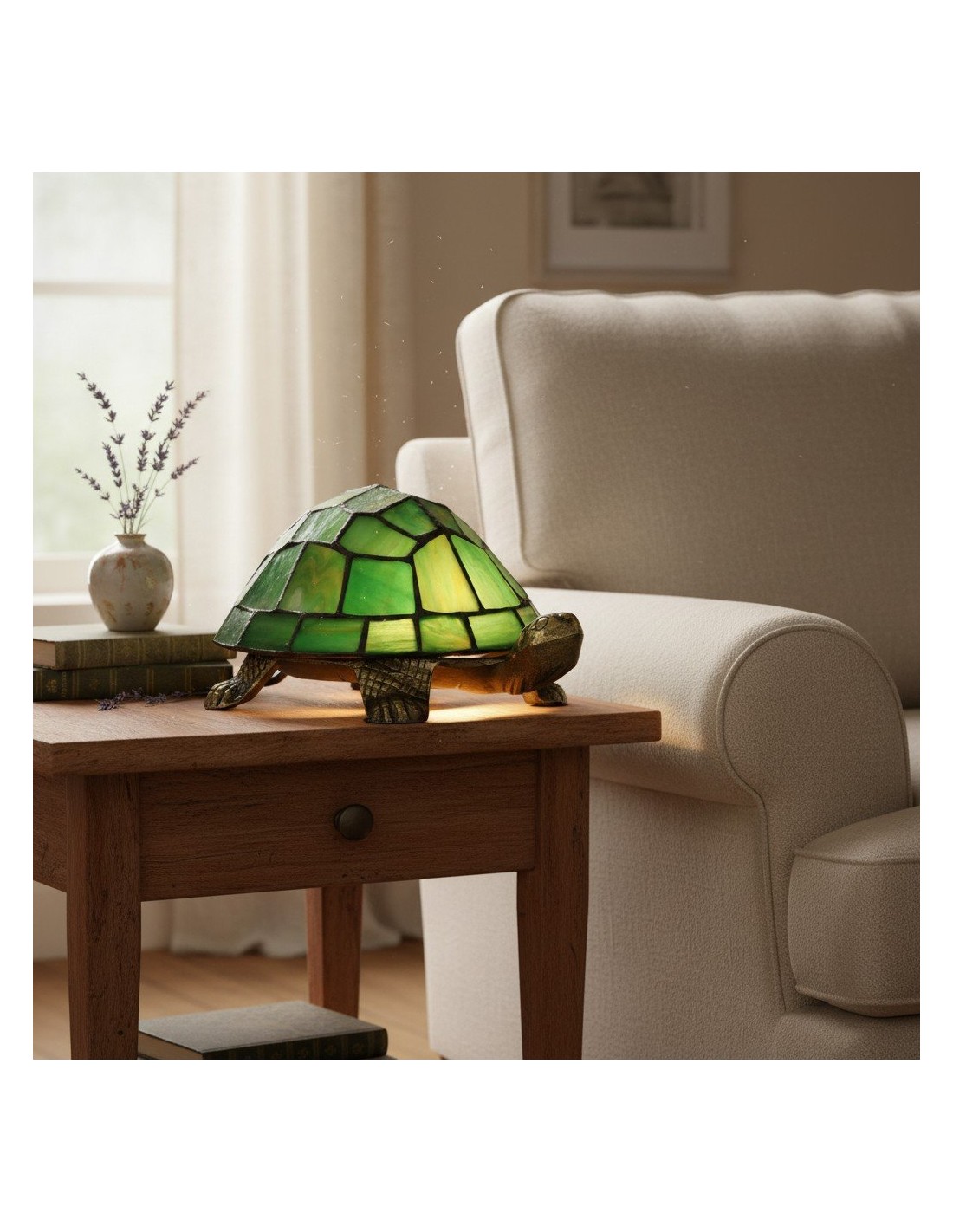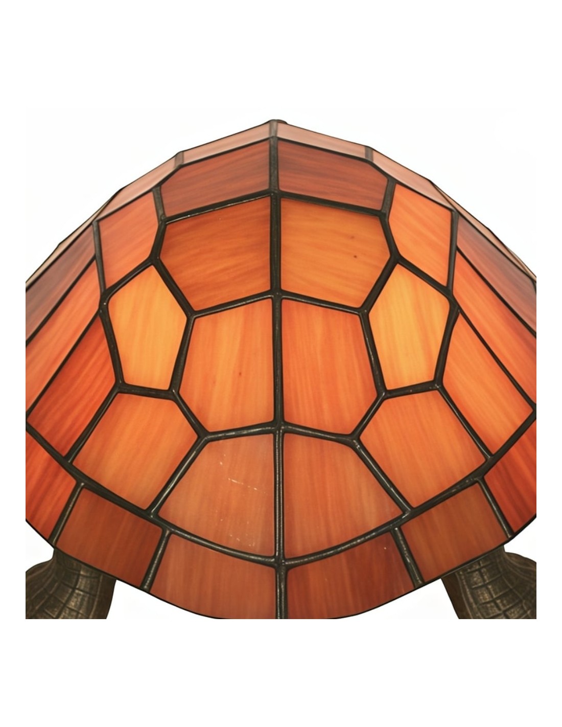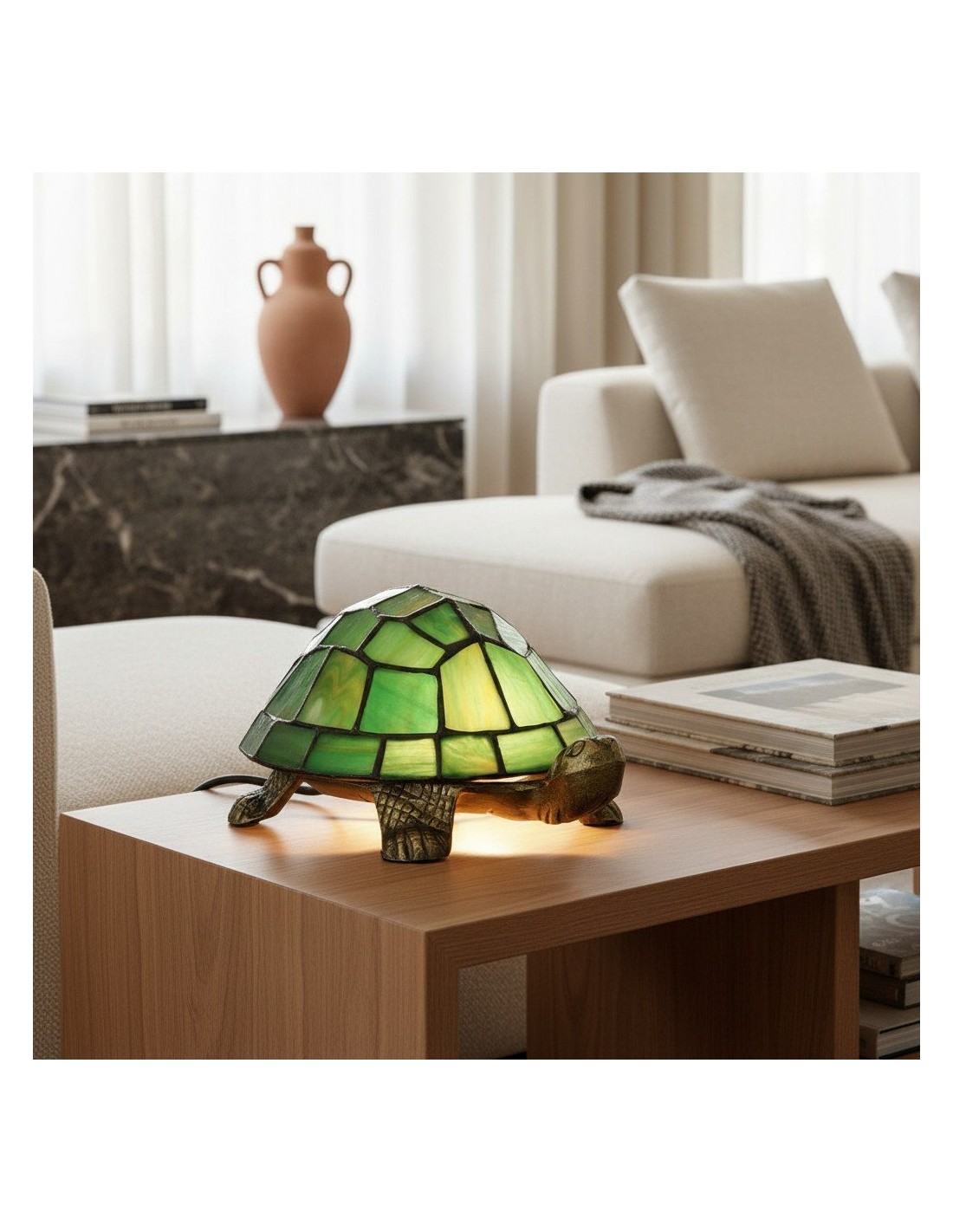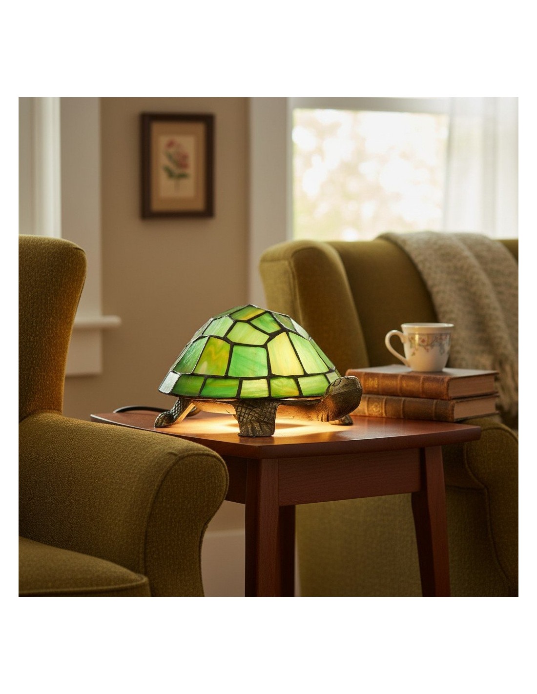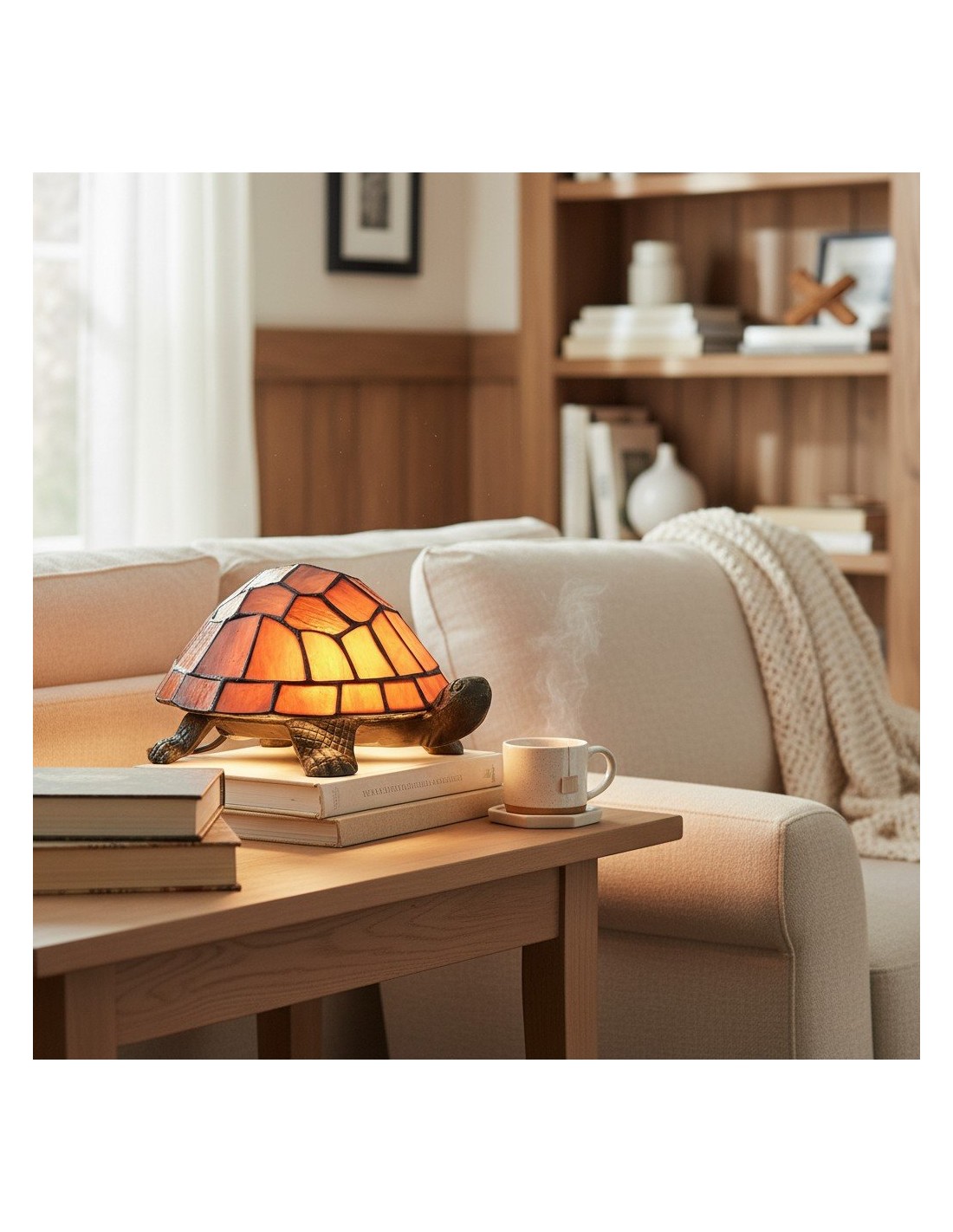 Una lampada da tavolo in stile Tiffany con paralume in vetro colorato con motivo tartaruga. Quando è accesa, diffonde una luce calda e soffusa, ideale per comodini, scrivanie o tavolini. Compatta e versatile, aggiunge un tocco di fascino vintage a soggiorni, camere da letto o uffici domestici.