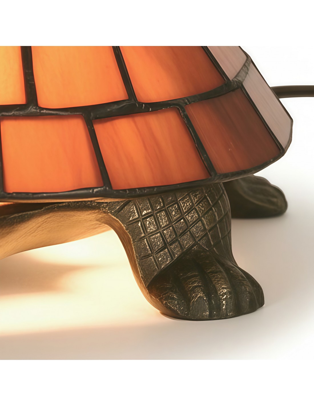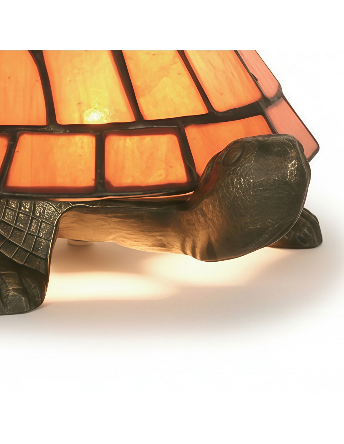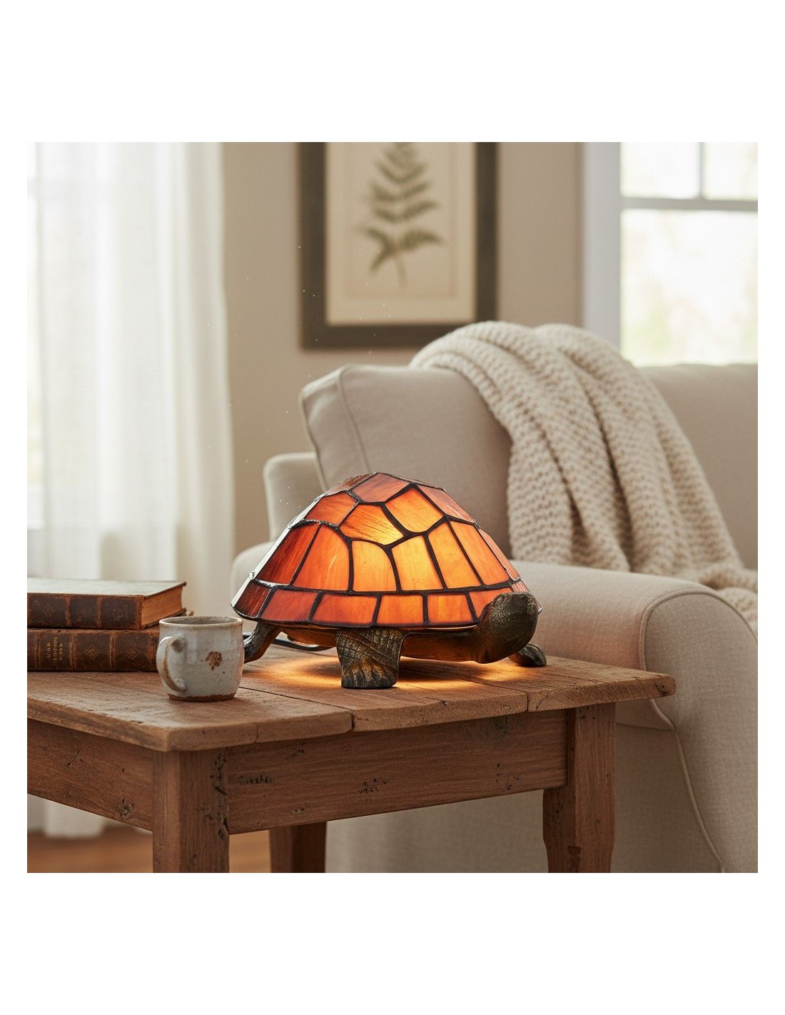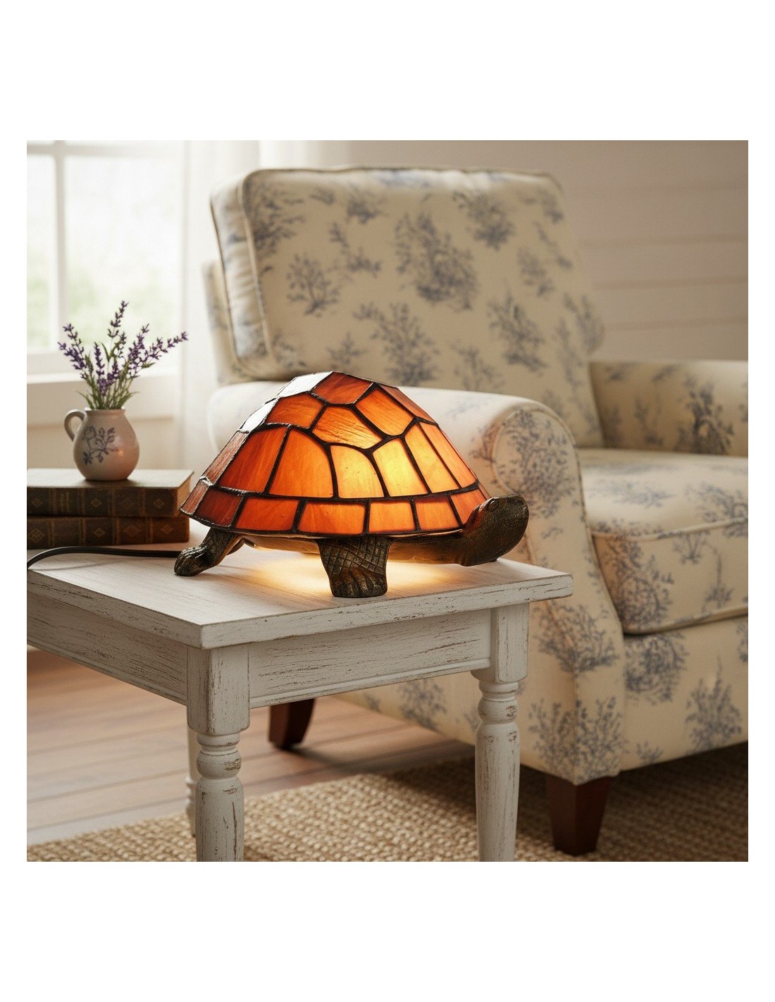 Una lampada da tavolo in stile Tiffany con paralume in vetro colorato con motivo tartaruga. Quando è accesa, diffonde una luce calda e soffusa, ideale per comodini, scrivanie o tavolini. Compatta e versatile, aggiunge un tocco di fascino vintage a soggiorni, camere da letto o uffici domestici.