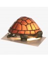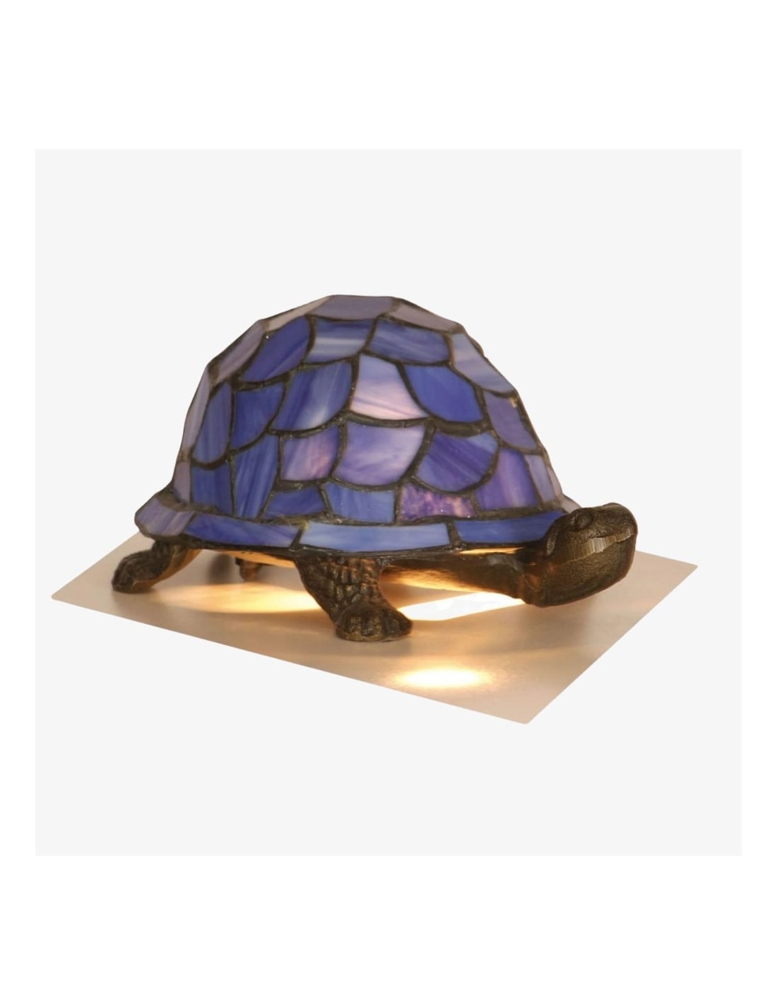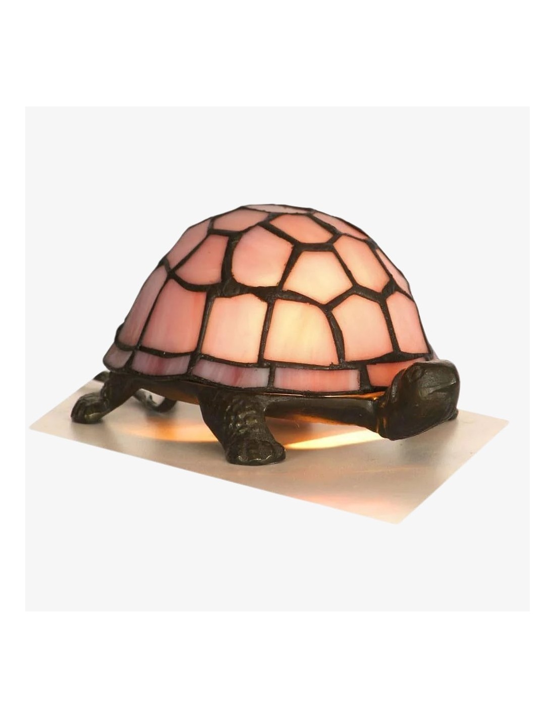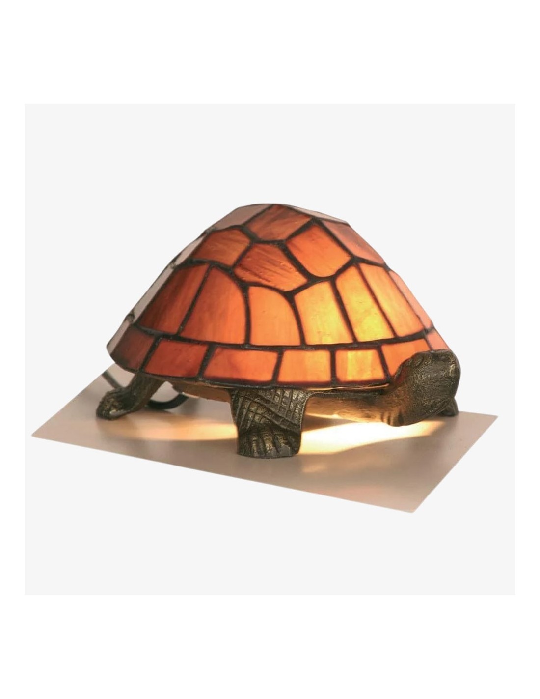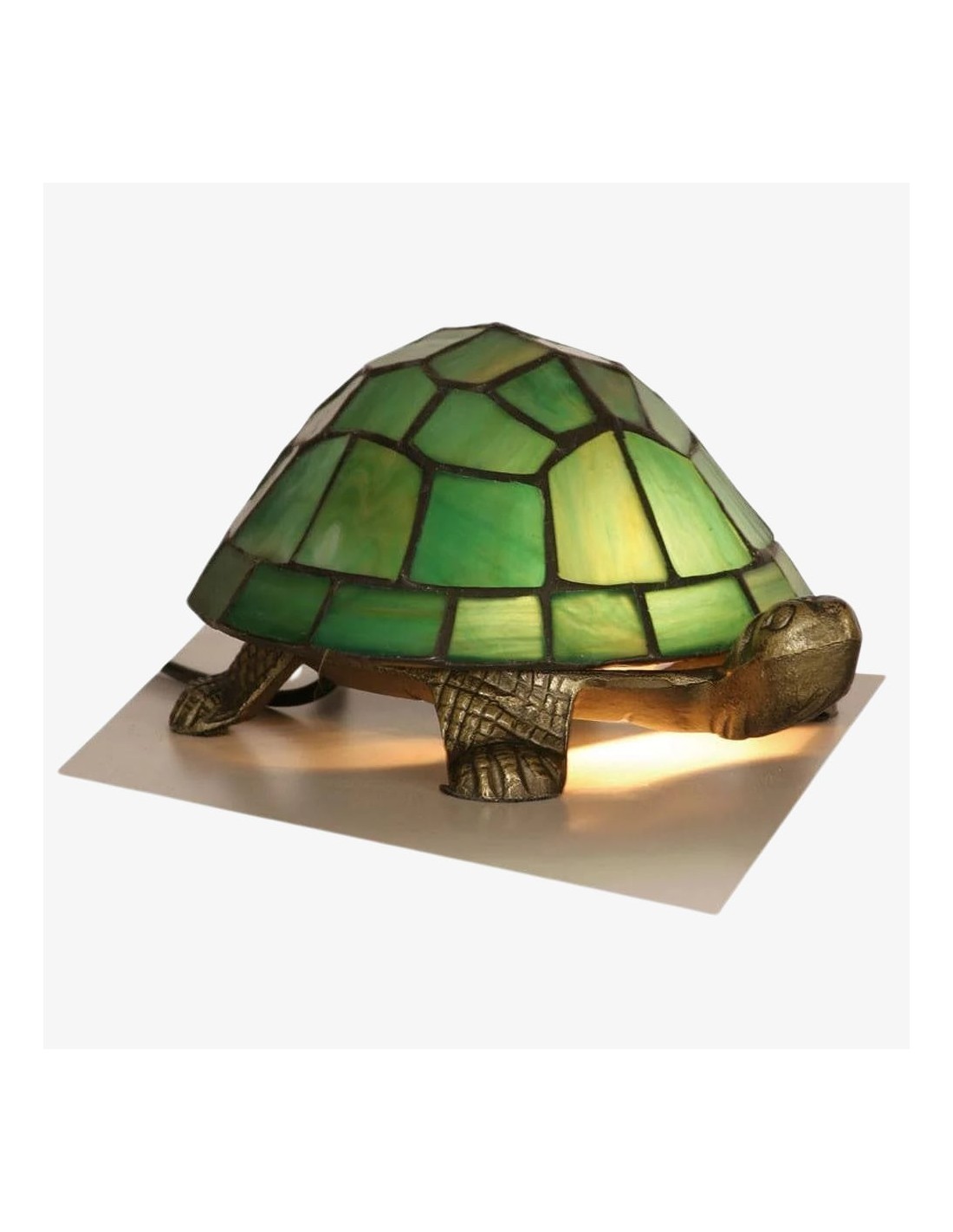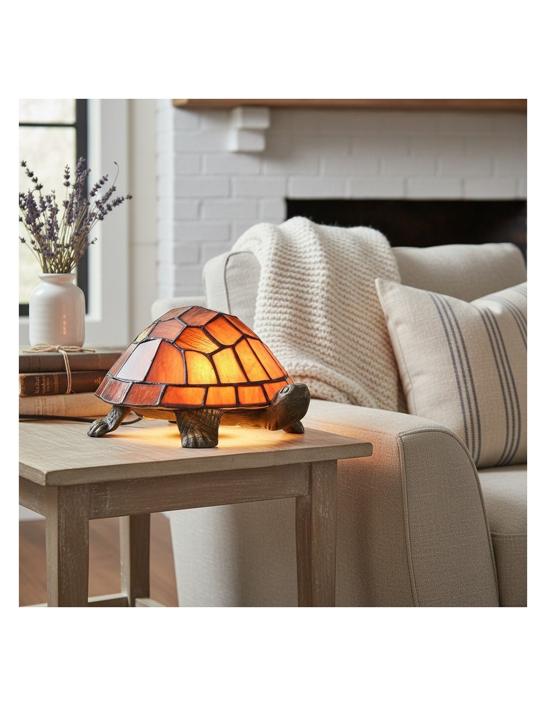 Una lampada da tavolo in stile Tiffany con paralume in vetro colorato con motivo tartaruga. Quando è accesa, diffonde una luce calda e soffusa, ideale per comodini, scrivanie o tavolini. Compatta e versatile, aggiunge un tocco di fascino vintage a soggiorni, camere da letto o uffici domestici.