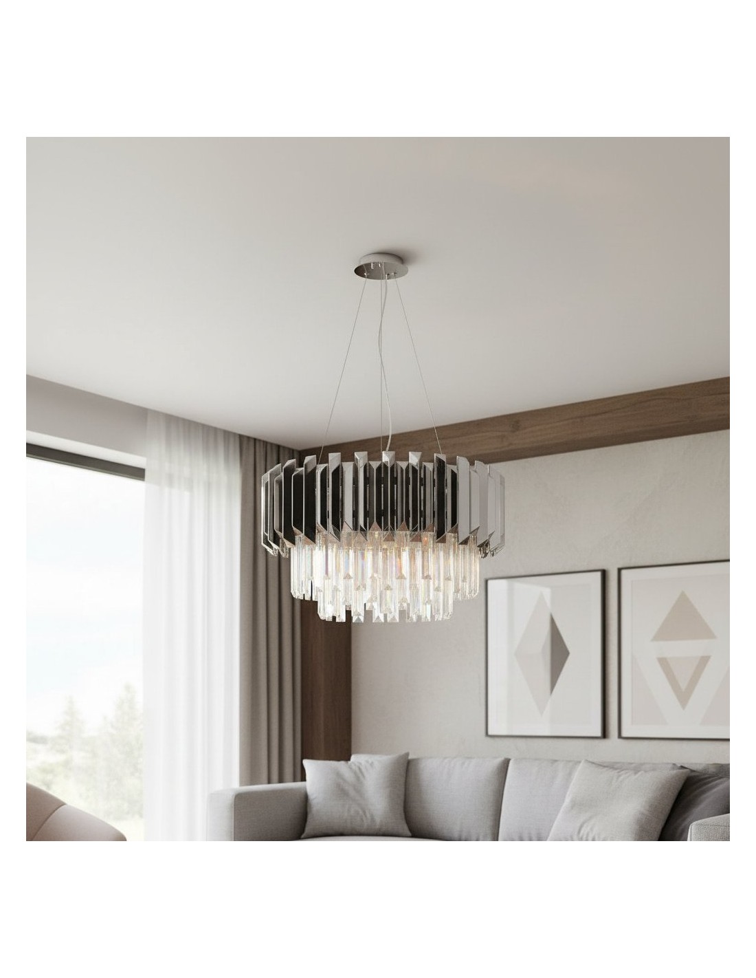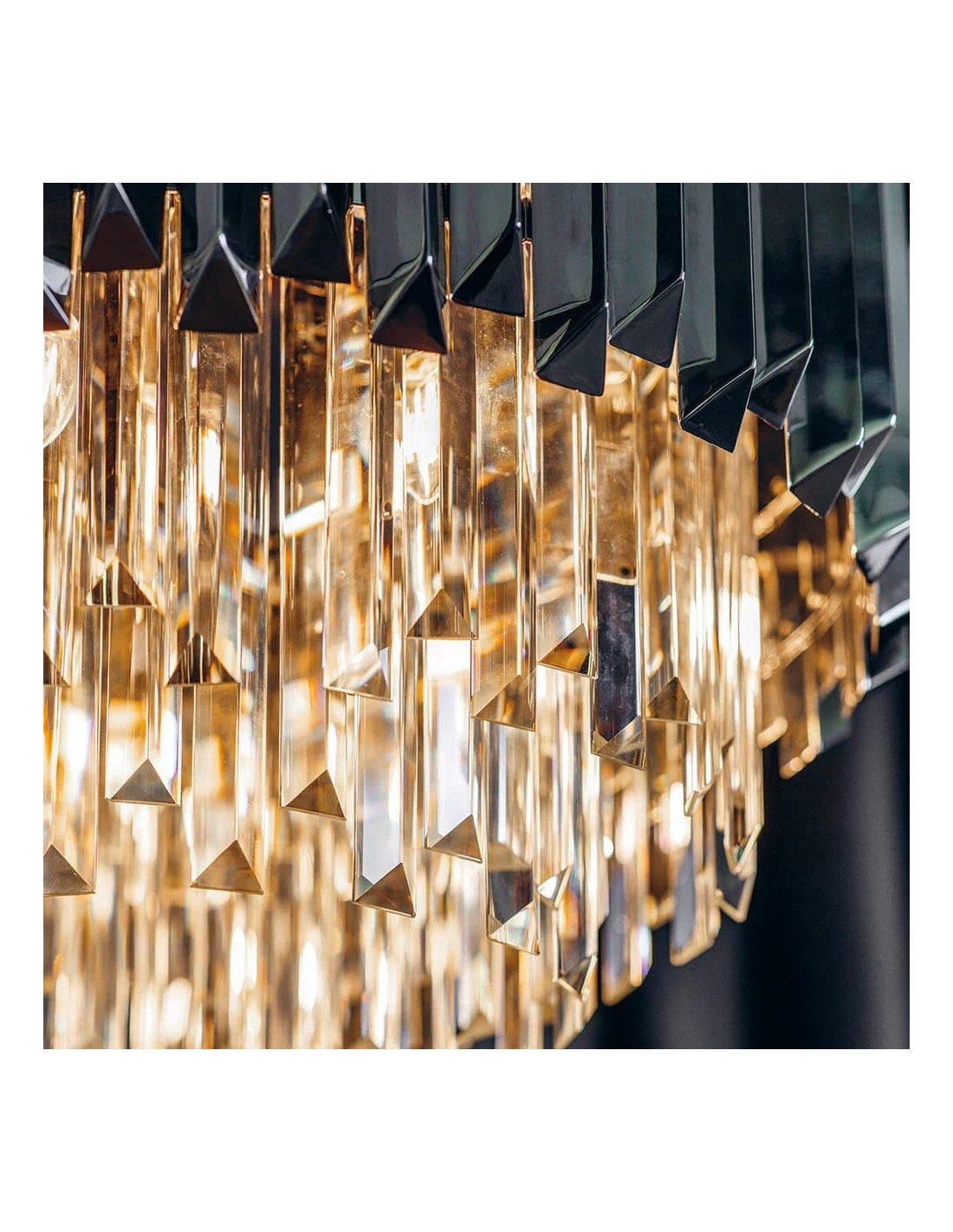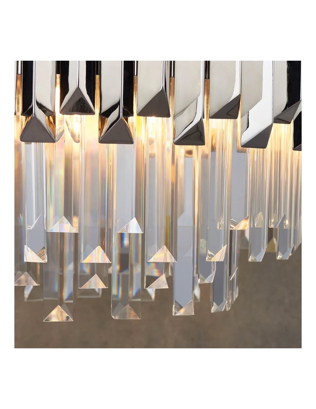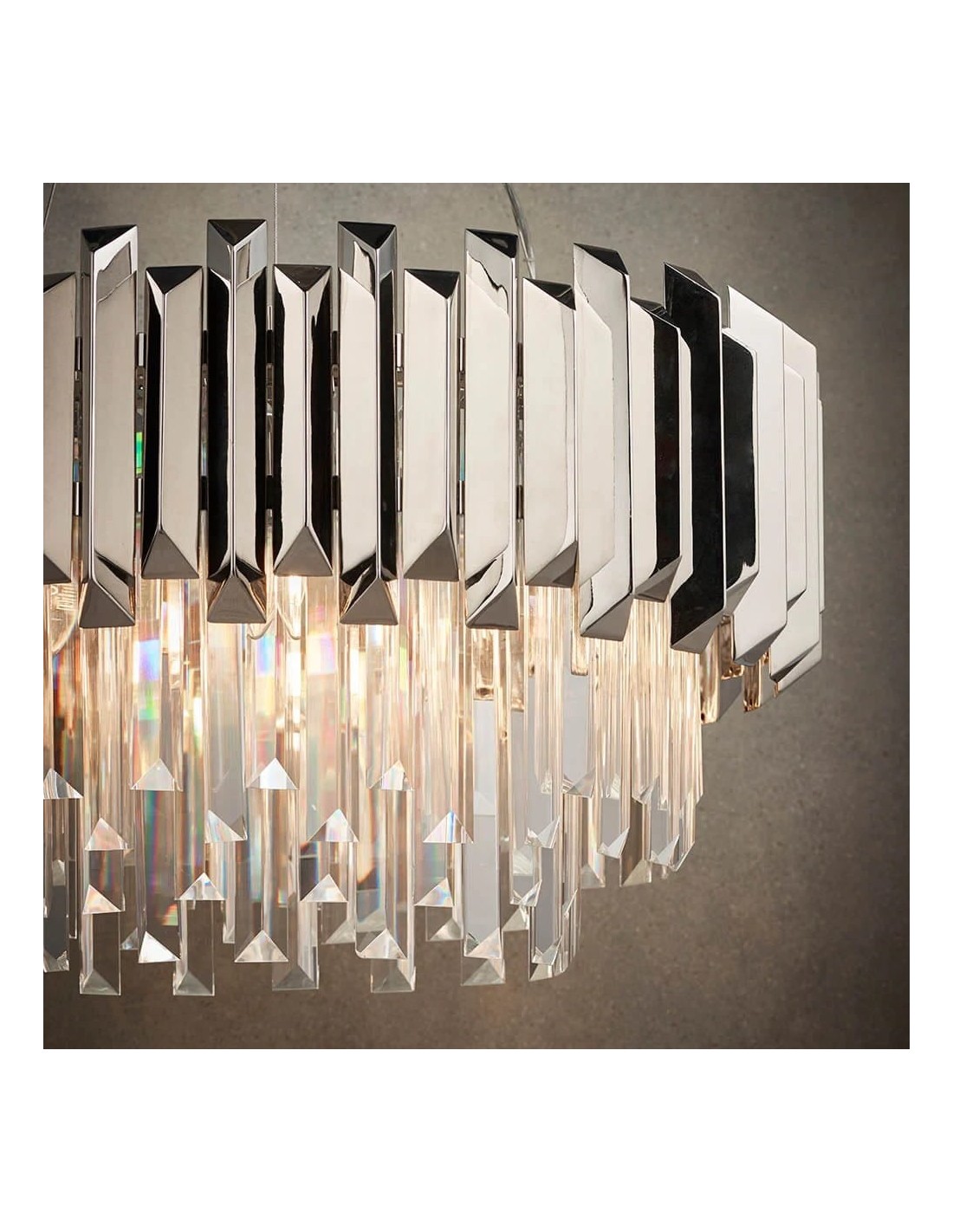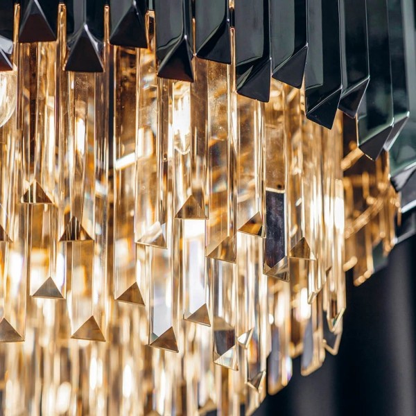 Il lampadario Virelia è caratterizzato da una struttura in cristallo a più livelli che crea un bagliore brillante e sfaccettato. La sua struttura elegante e moderna sostiene un tamburo in cristallo stratificato che cattura magnificamente la luce; con la sua silhouette pulita e la sua radiosa brillantezza, conferisce un'atmosfera lussuosa e contemporanea a qualsiasi interno.