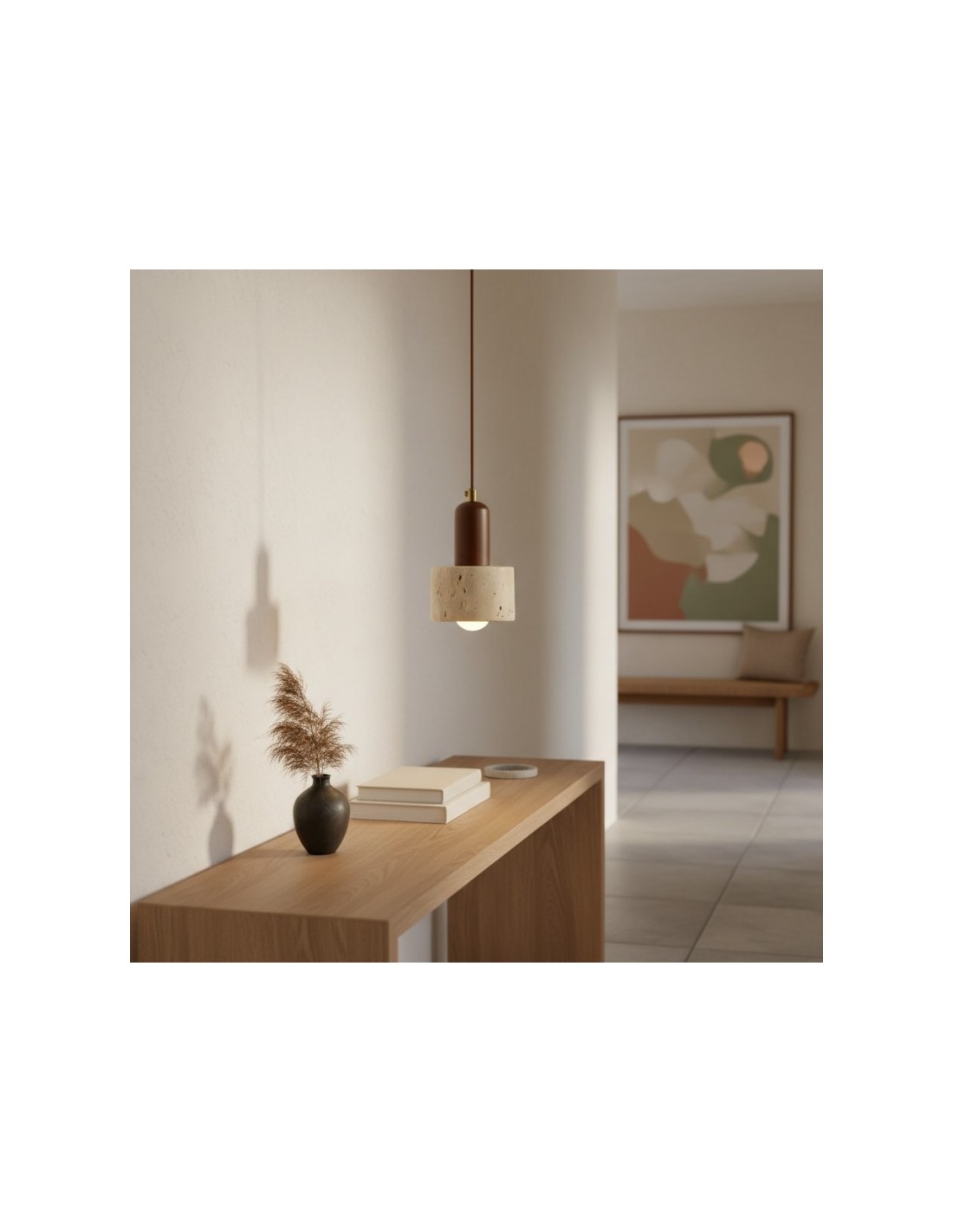 Questa lampada a sospensione di ispirazione giapponese fonde le texture del legno e del travertino con la forma cilindrica. Il suo design minimalista e scultoreo crea un'illuminazione calda e d'atmosfera, perfetta per camere da letto, soggiorni o sale da pranzo, integrandosi perfettamente sia negli interni moderni che in quelli tradizionali.