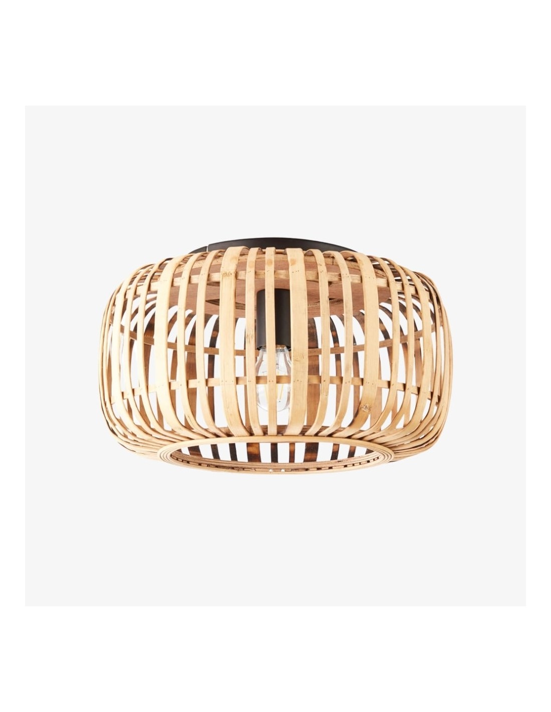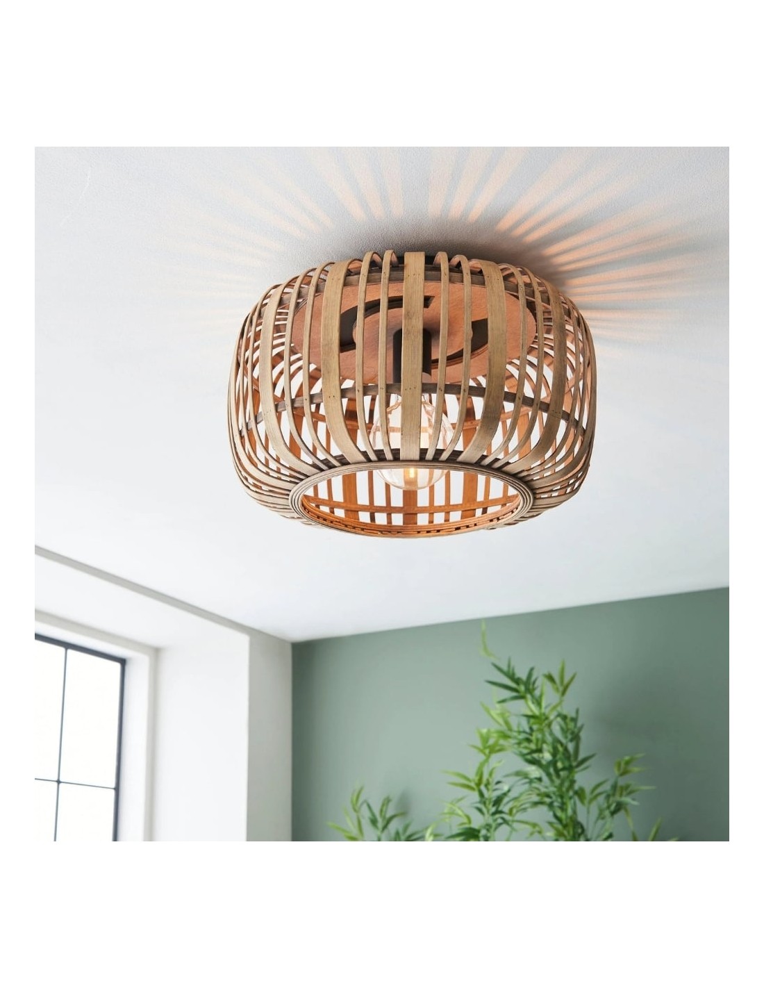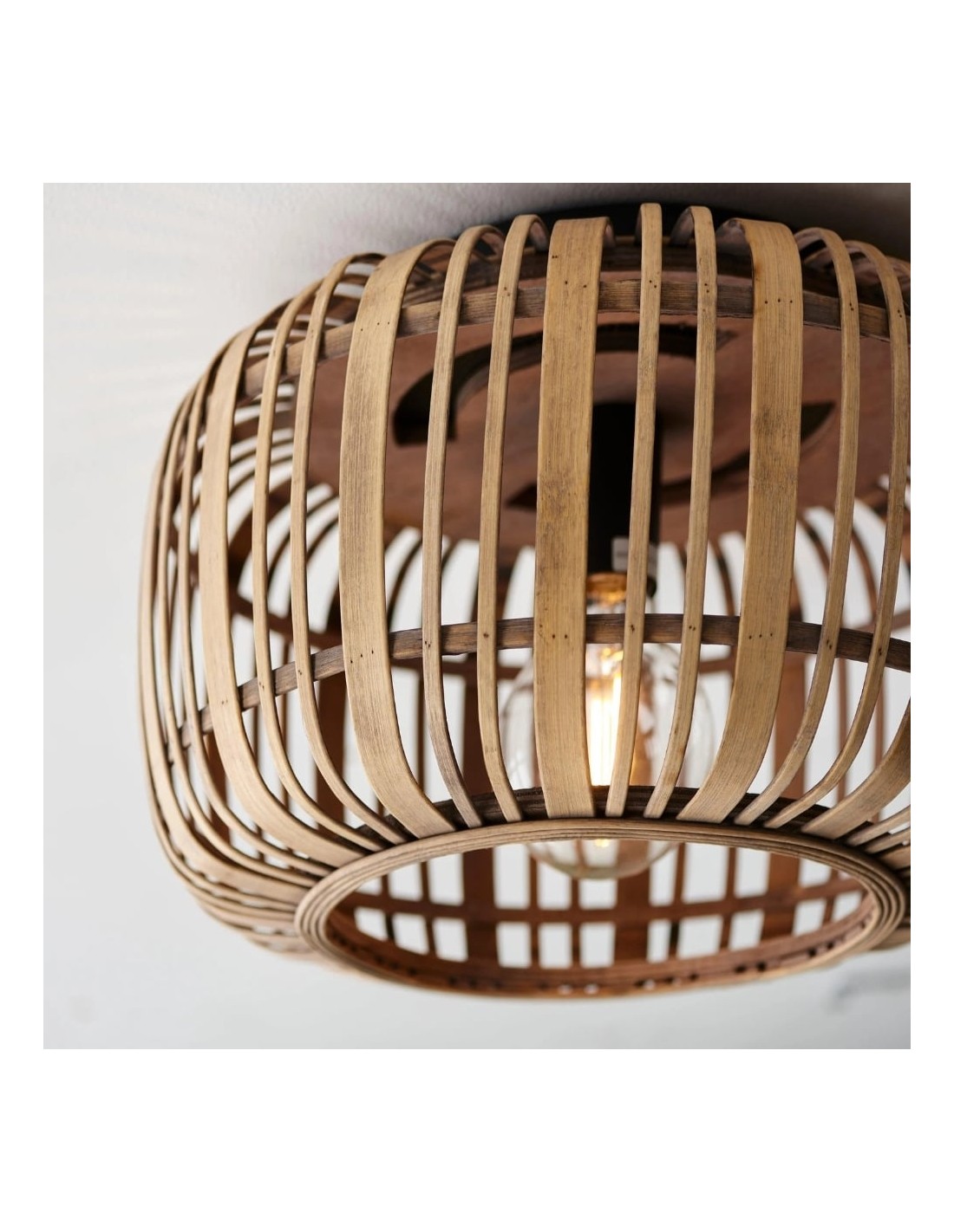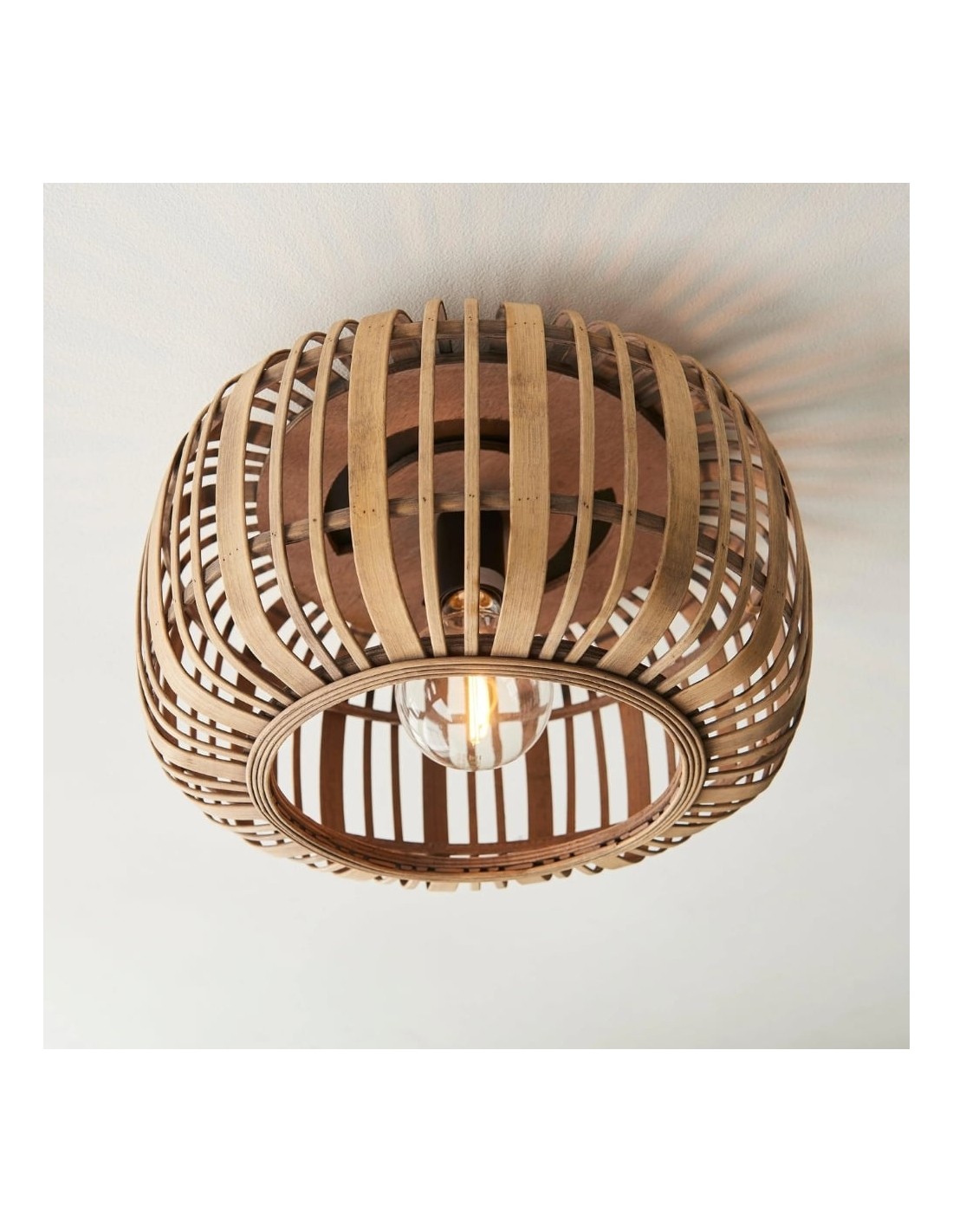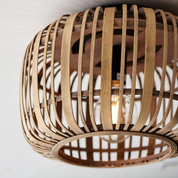 Illumina il tuo spazio con Bamboo Cage Ceiling Flush, un apparecchio di illuminazione di pregevole fattura che fonde eleganza naturale e design minimalista. La struttura in bambù a vista è abbinata a dettagli in metallo nero opaco, che le conferiscono un'estetica moderna ma al tempo stesso organica.
