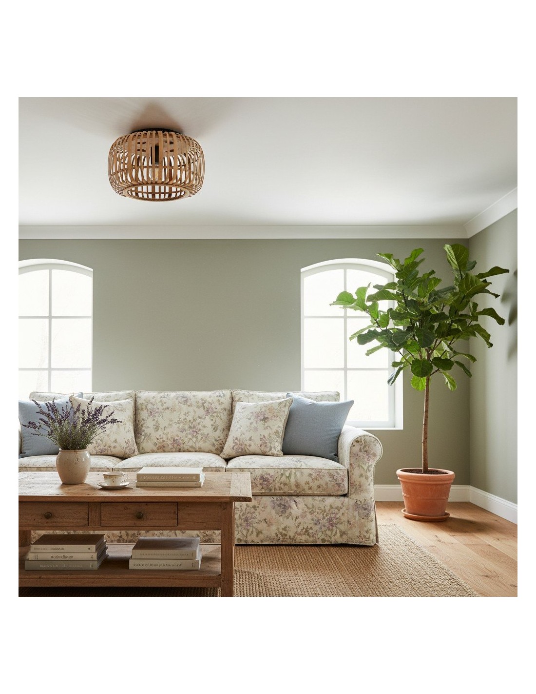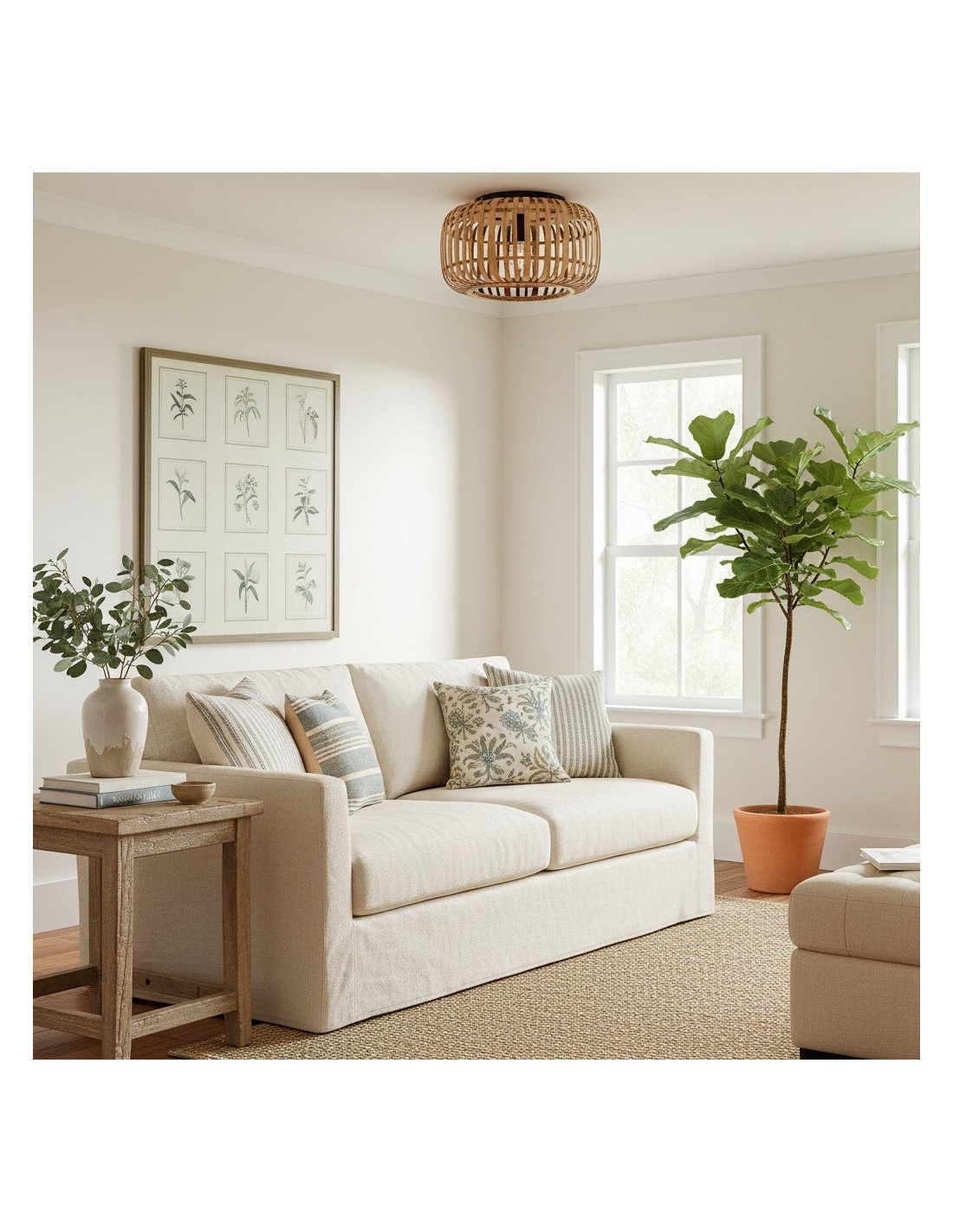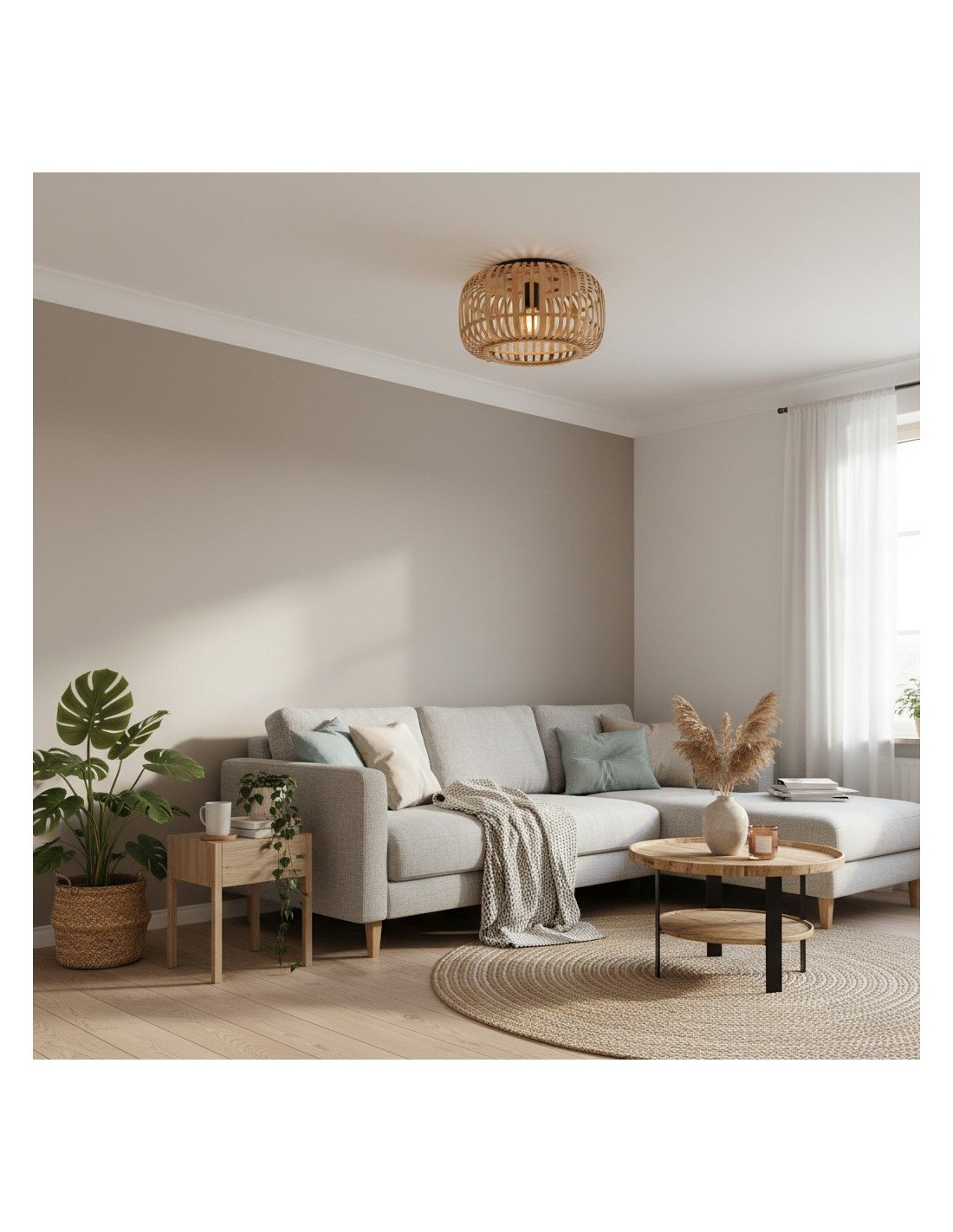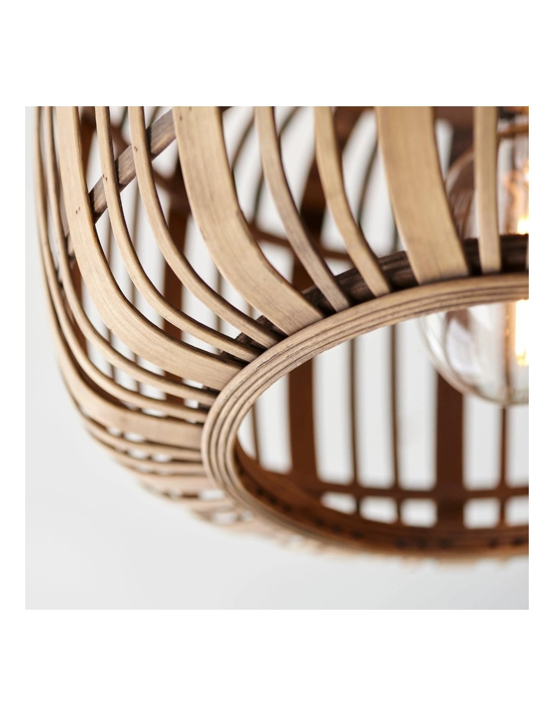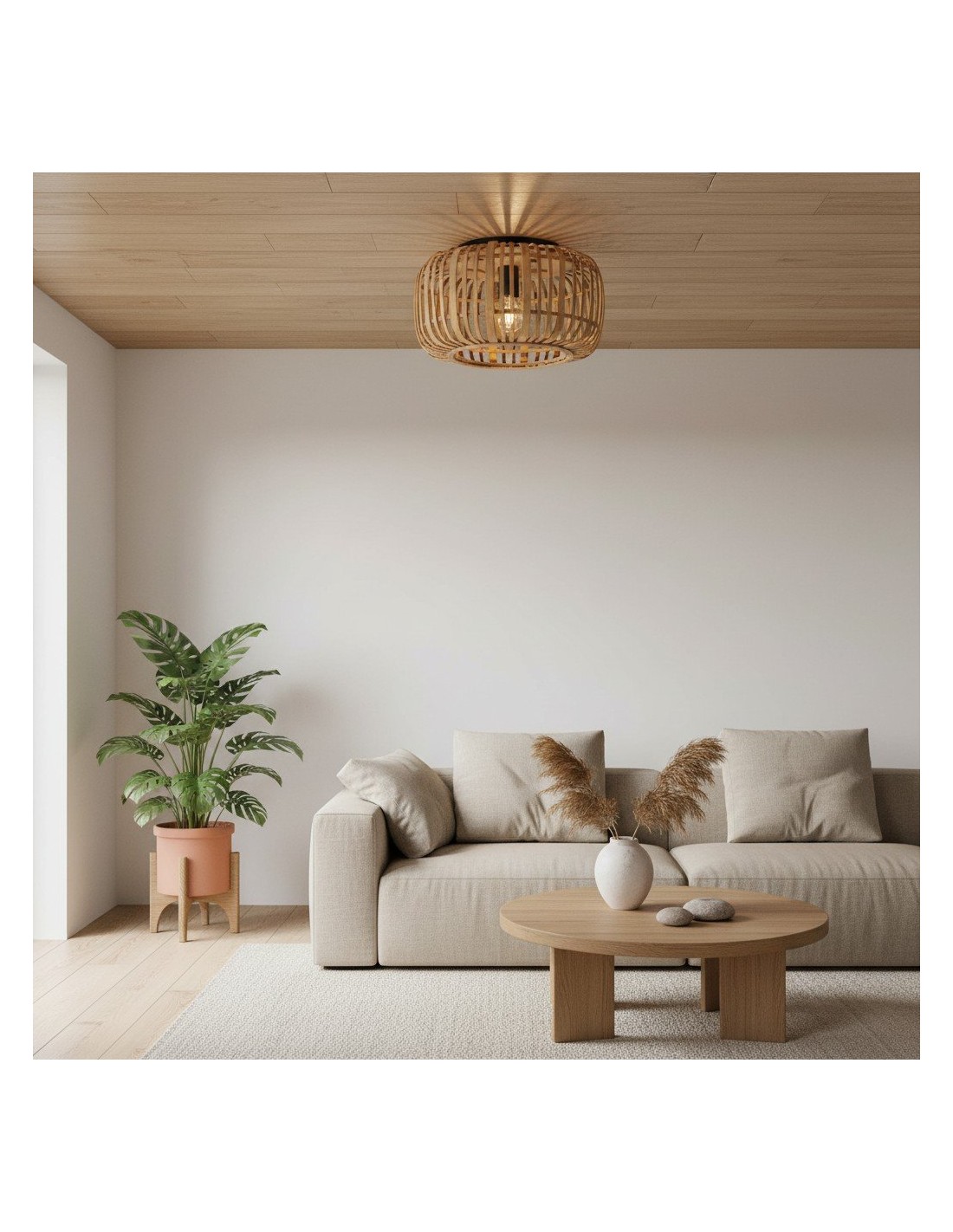 Illumina il tuo spazio con Bamboo Cage Ceiling Flush, un apparecchio di illuminazione di pregevole fattura che fonde eleganza naturale e design minimalista. La struttura in bambù a vista è abbinata a dettagli in metallo nero opaco, che le conferiscono un'estetica moderna ma al tempo stesso organica.