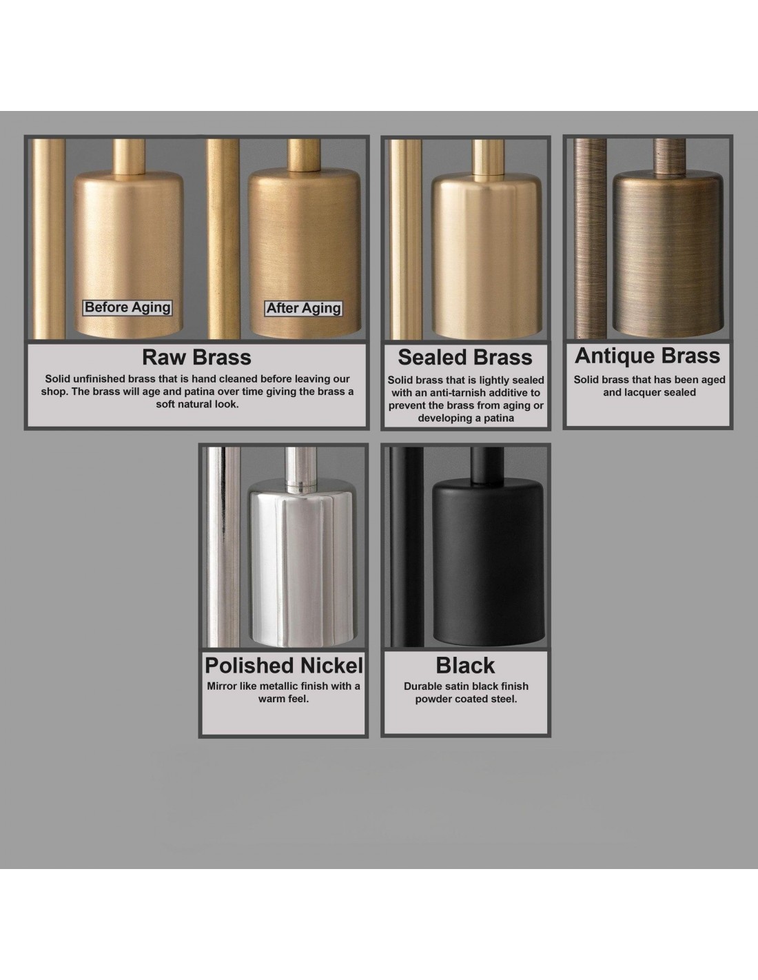- Metalen kap: antiek messing, ruw messing, verzegeld messing, zwart, gepolijst nikkel, geborsteld nikkel, zwart/ruw messing.