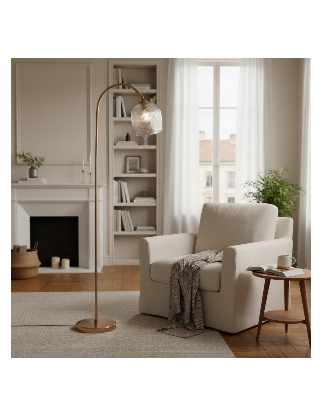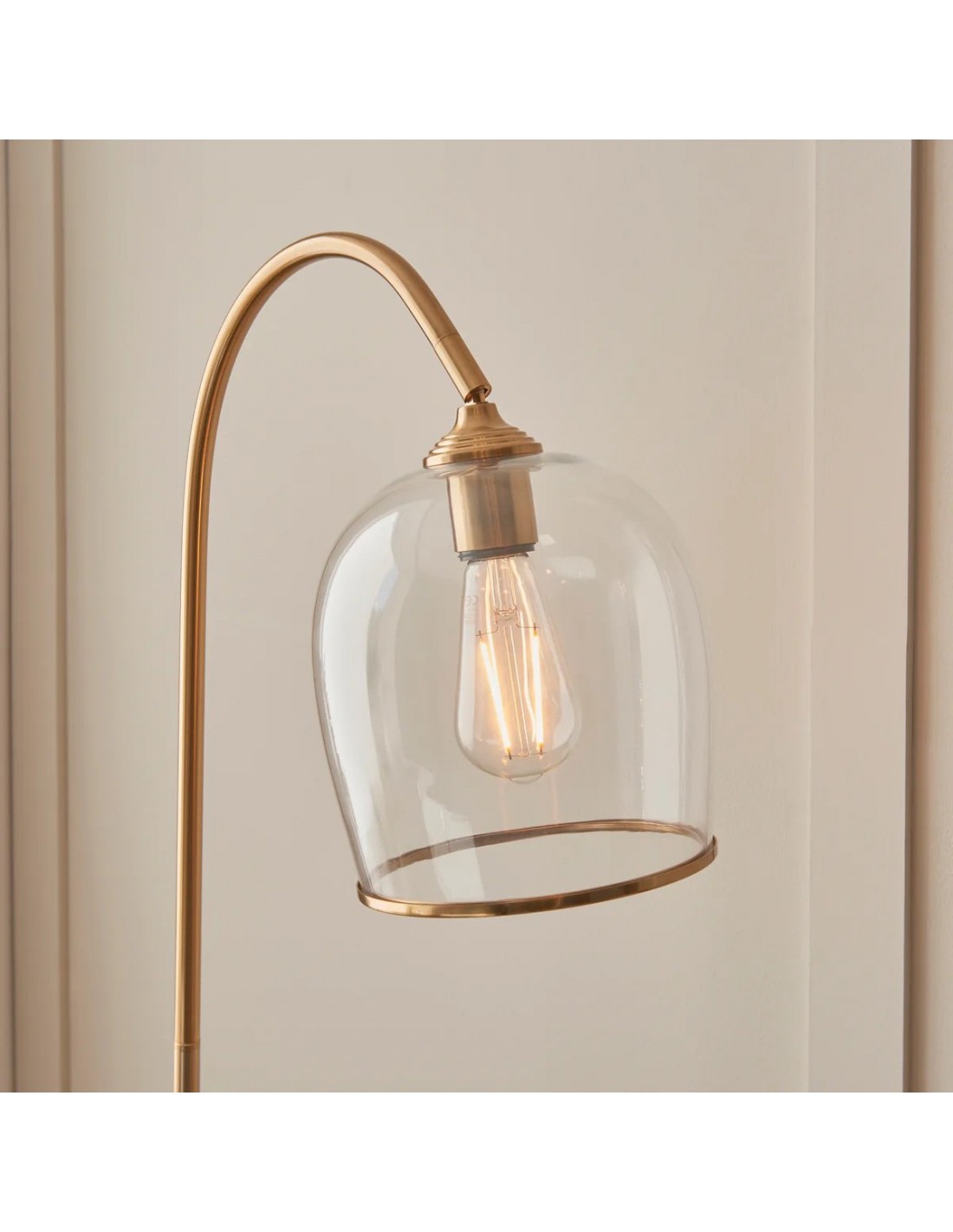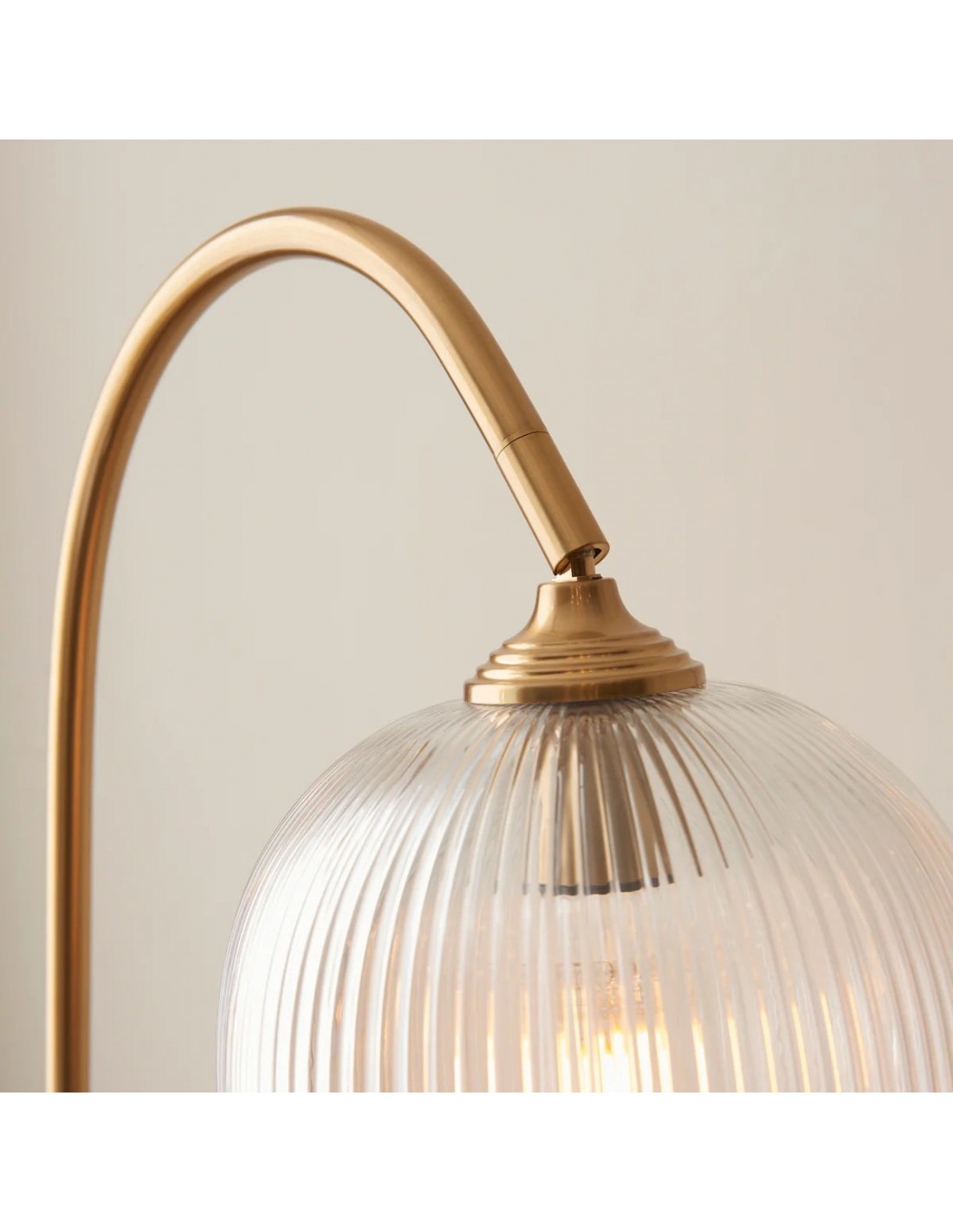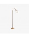 Deze staande lamp combineert een verfijnd messing frame met naar keuze geribbeld of helder bolvormig glas, wat zorgt voor een tijdloze en elegante uitstraling. De gebogen steel en verstelbare kop bieden gerichte verlichting, waardoor de lamp ideaal is voor leeshoekjes, zitkamers en slaapkamers.