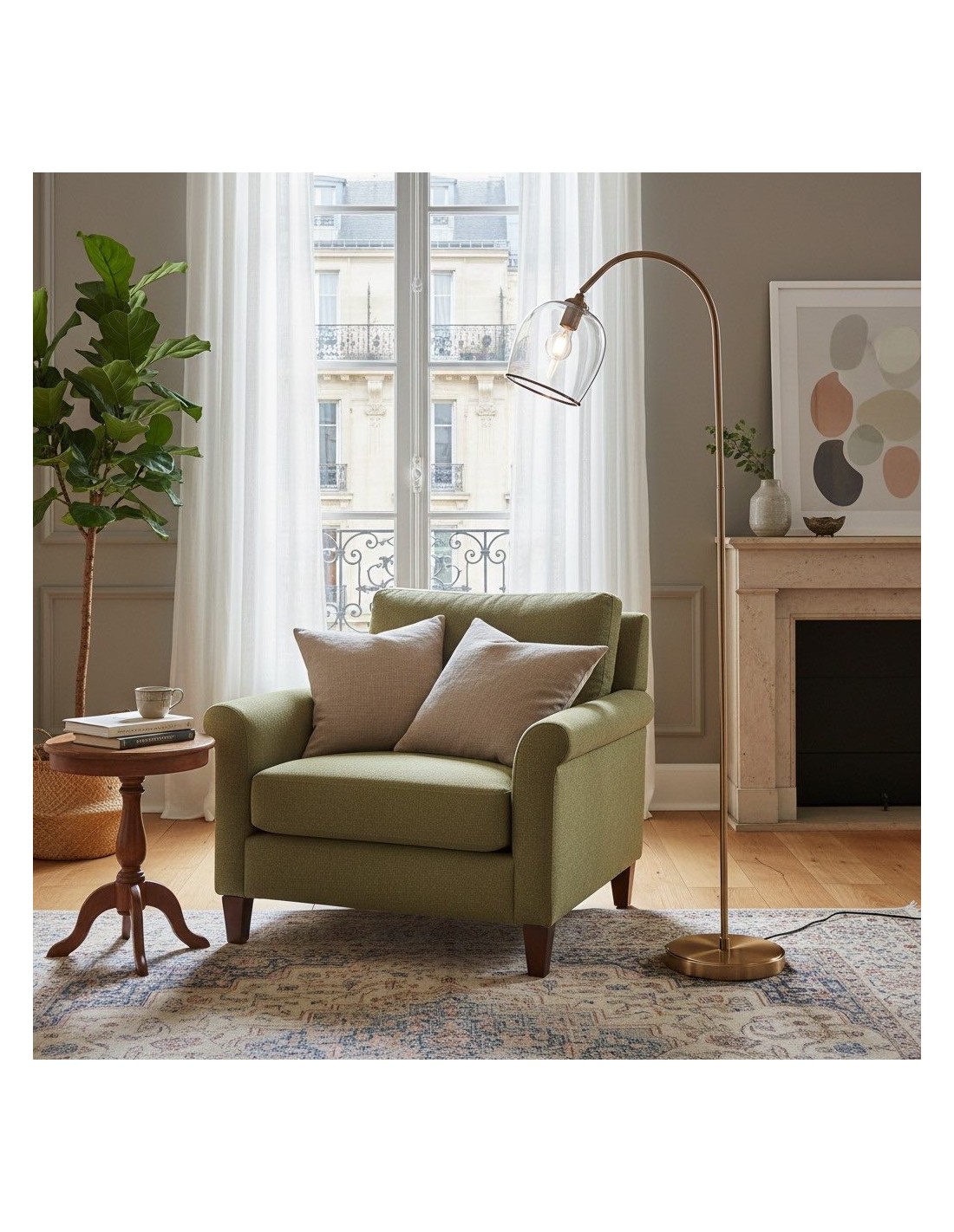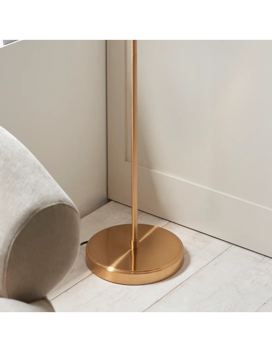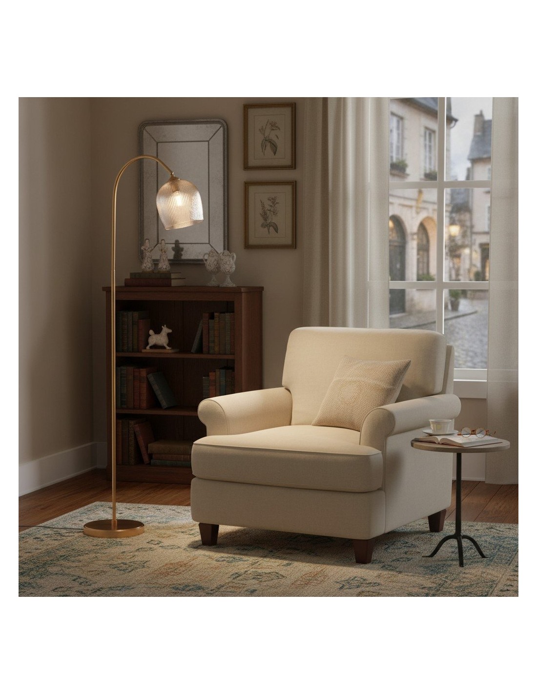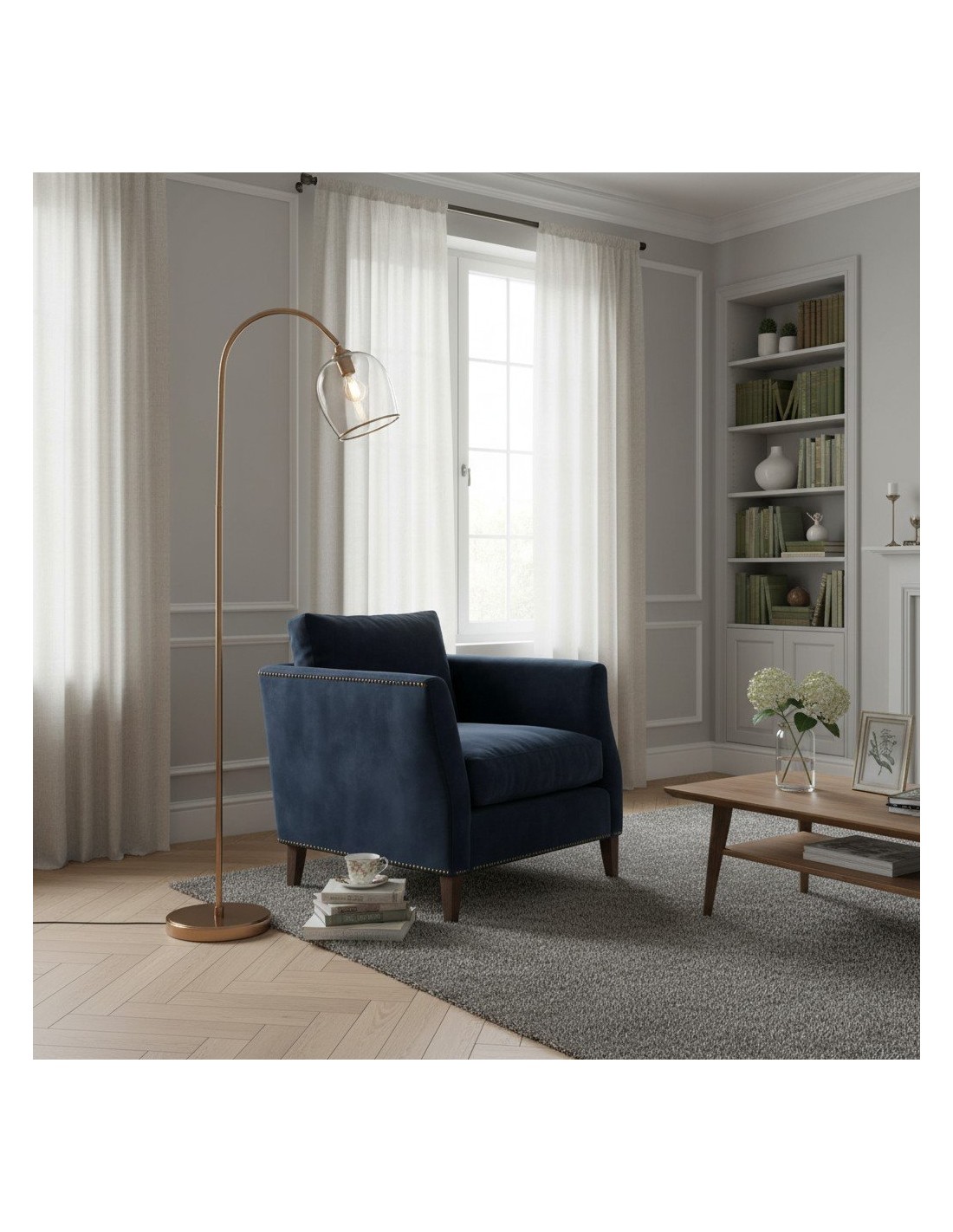 Deze staande lamp combineert een verfijnd messing frame met naar keuze geribbeld of helder bolvormig glas, wat zorgt voor een tijdloze en elegante uitstraling. De gebogen steel en verstelbare kop bieden gerichte verlichting, waardoor de lamp ideaal is voor leeshoekjes, zitkamers en slaapkamers.