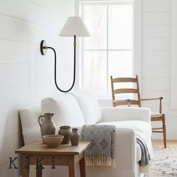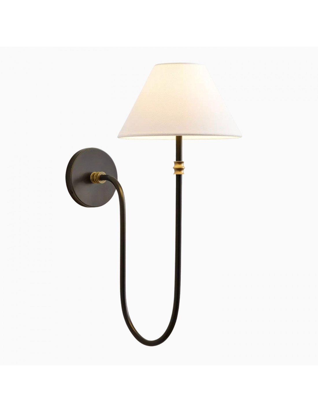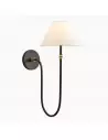 Breng elegantie en warmte in je interieur met deze prachtig ontworpen wandlamp. Met een fijn gebogen ijzeren arm en een zachte linnen kap verspreidt hij een zachte, sfeervolle gloed die elke kamer verfraait. De combinatie van klassieke details en moderne eenvoud maakt deze wandlamp een veelzijdige toevoeging aan gangen, slaapkamers, woonkamers of zelfs overdekte buitenruimtes.