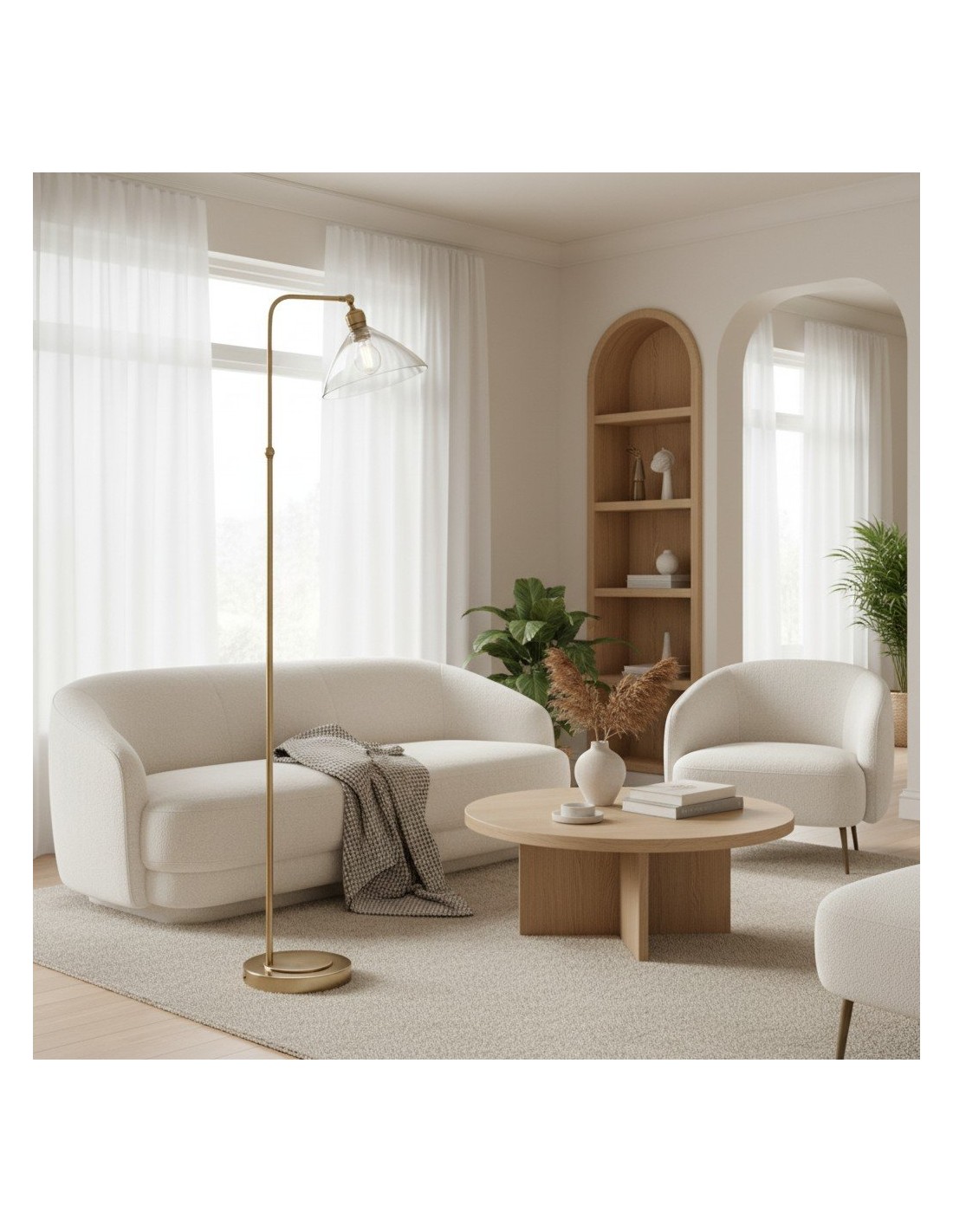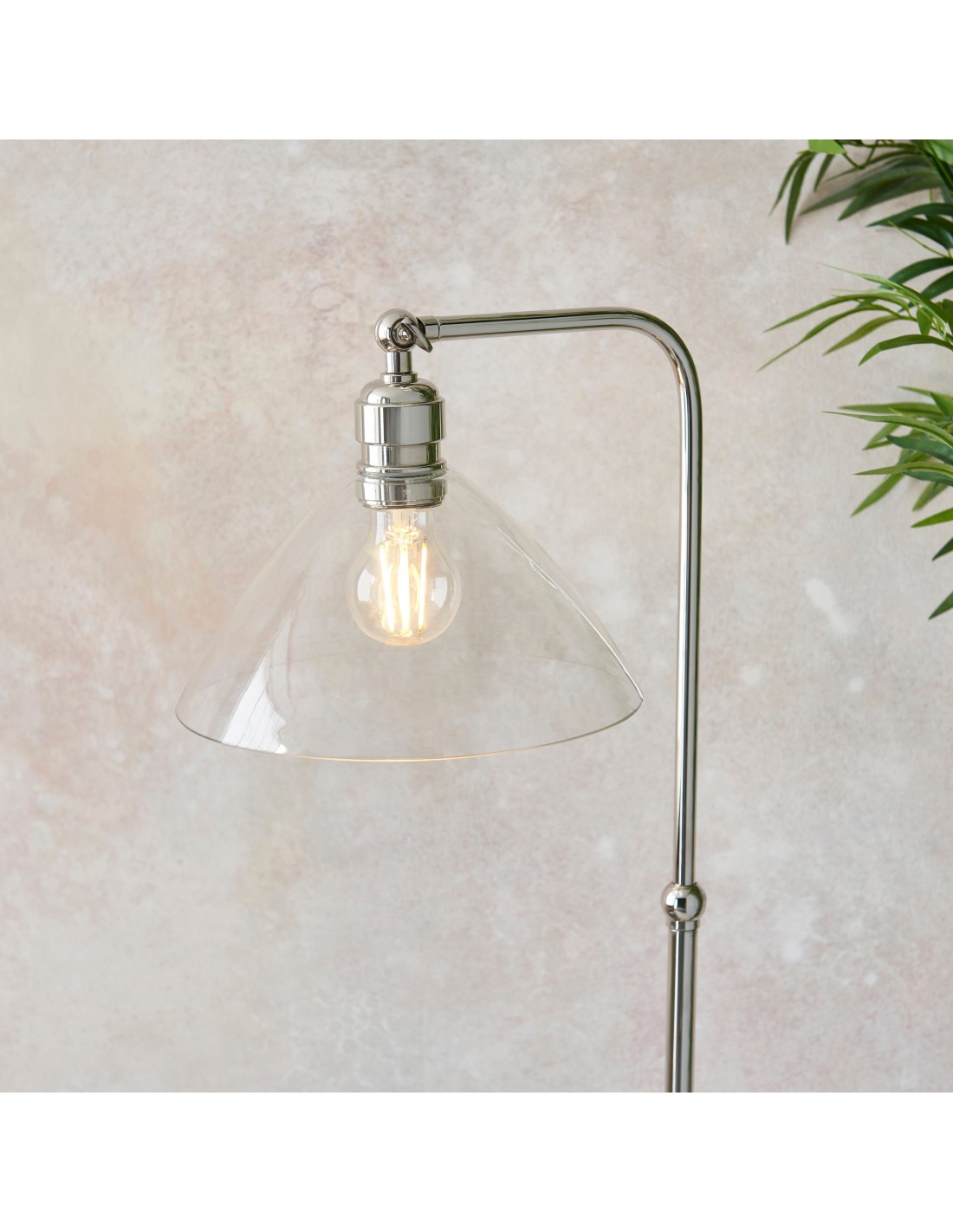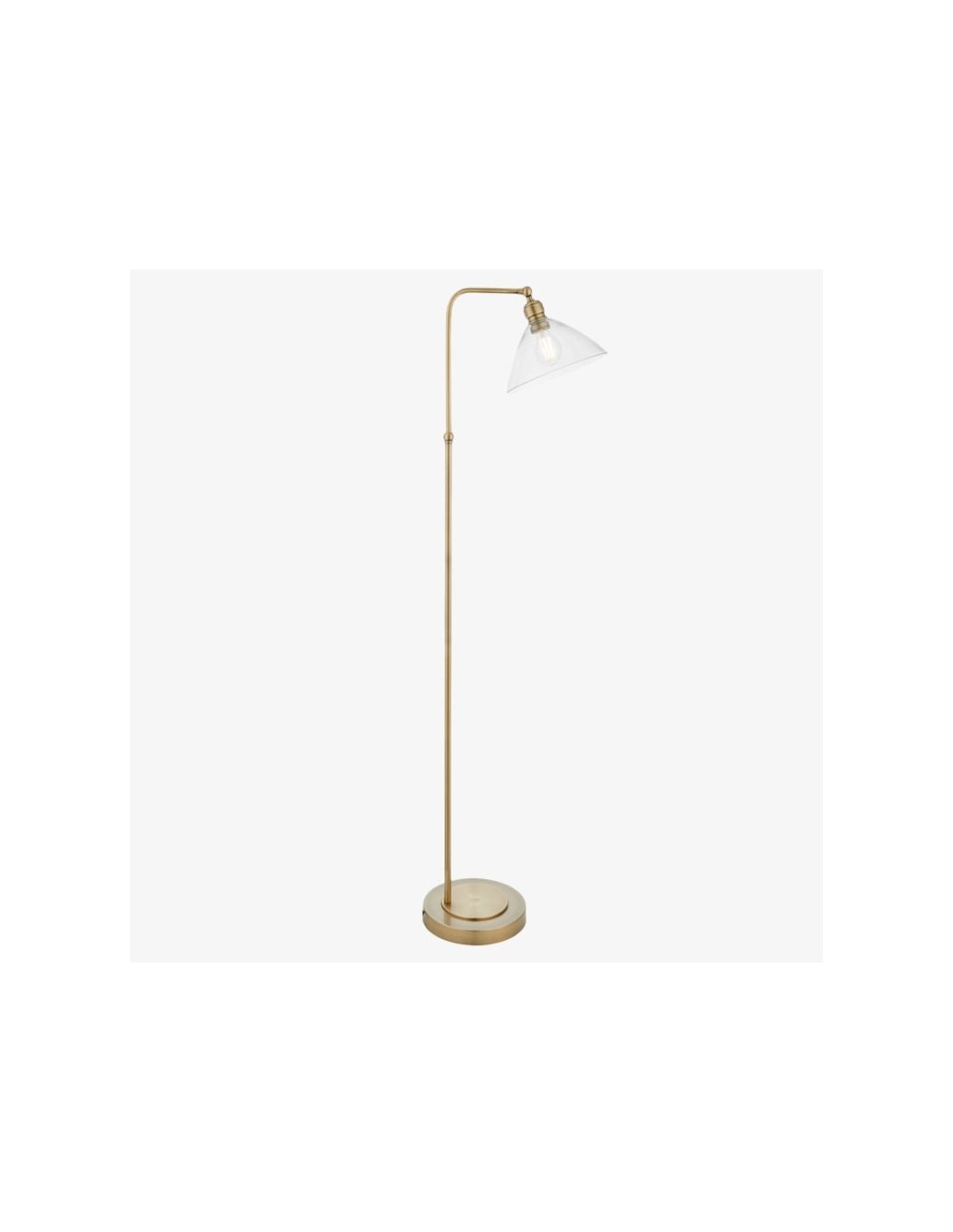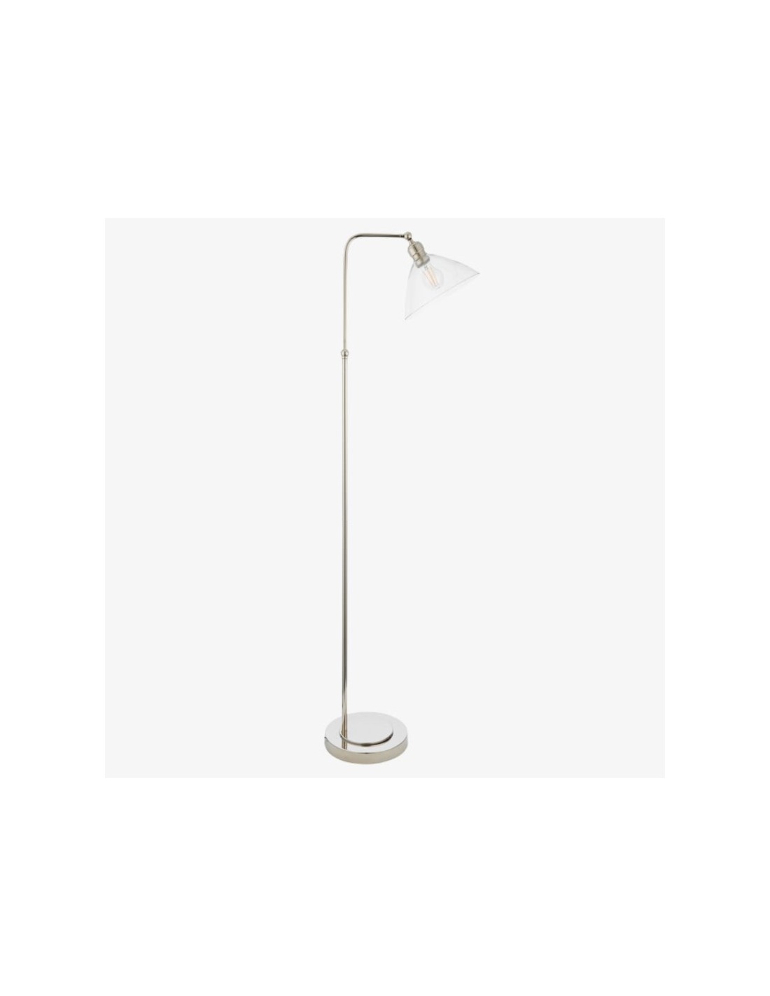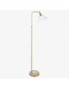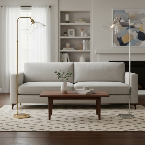Deze verfijnde vloerlamp combineert een elegante Art Deco-esthetiek met een functioneel ontwerp. De zacht gebogen, heldere glazen kap verspreidt het licht op een sierlijke manier, terwijl de metalen voet een vleugje tijdloze elegantie toevoegt.