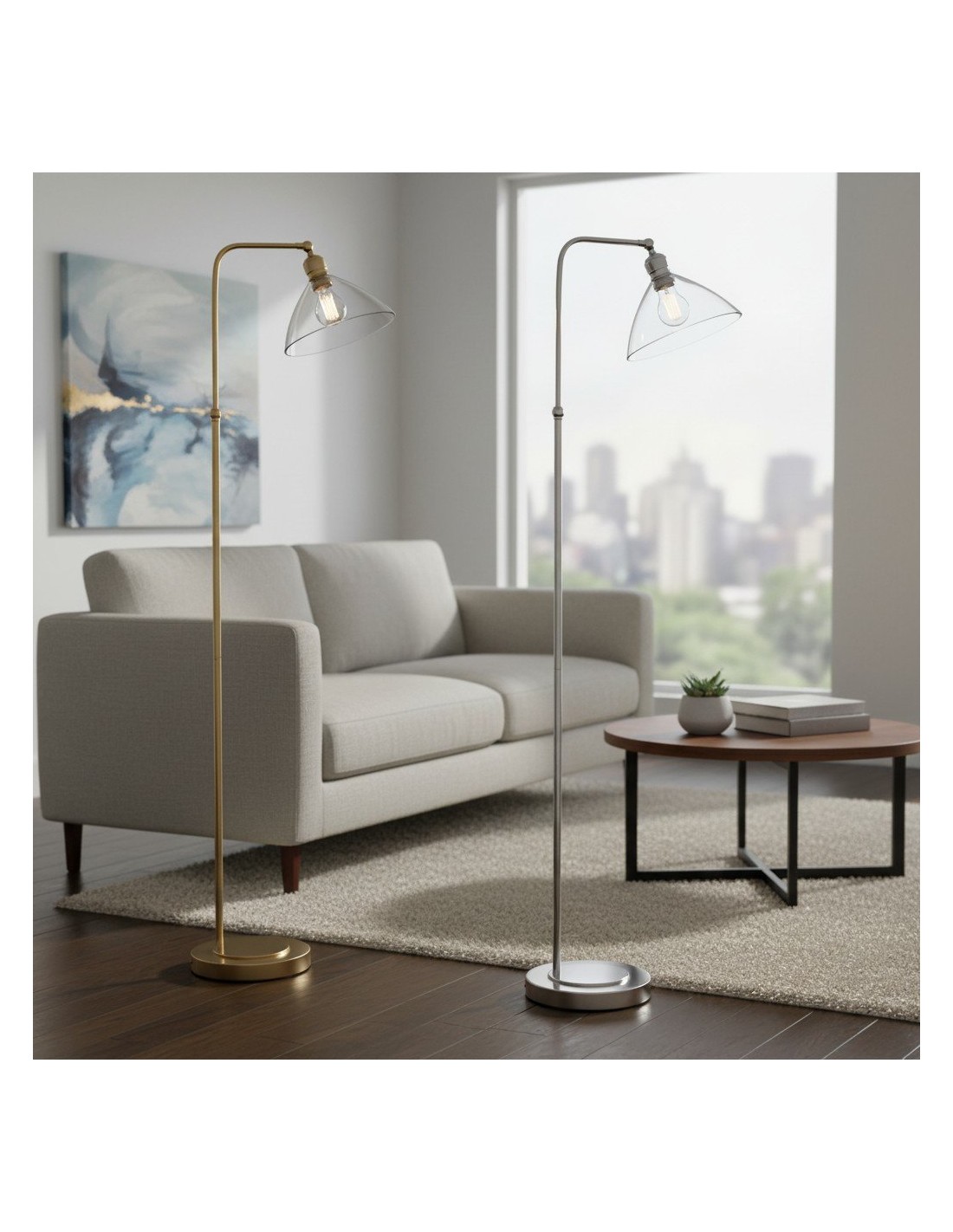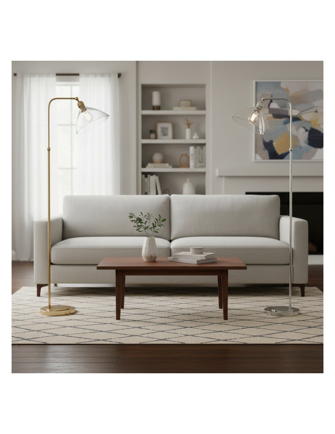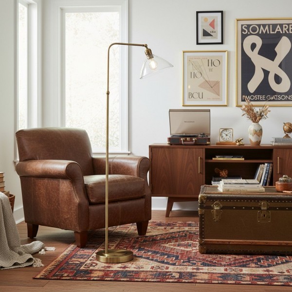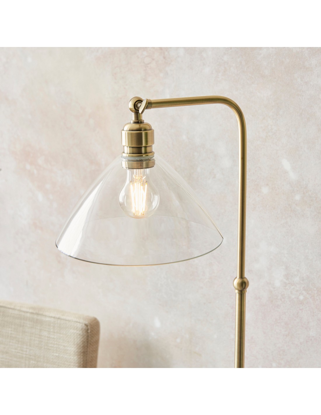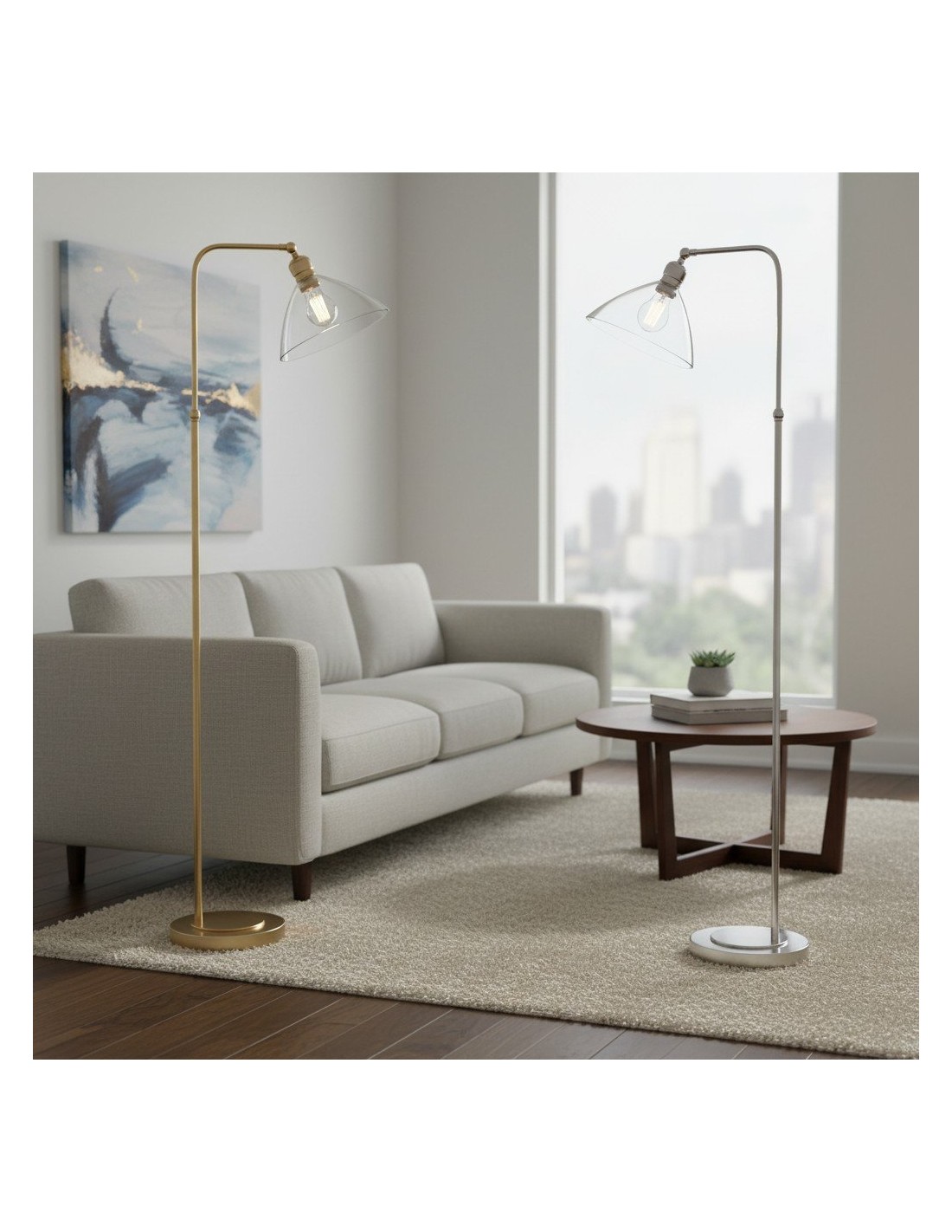 Deze verfijnde vloerlamp combineert een elegante Art Deco-esthetiek met een functioneel ontwerp. De zacht gebogen, heldere glazen kap verspreidt het licht op een sierlijke manier, terwijl de metalen voet een vleugje tijdloze elegantie toevoegt.