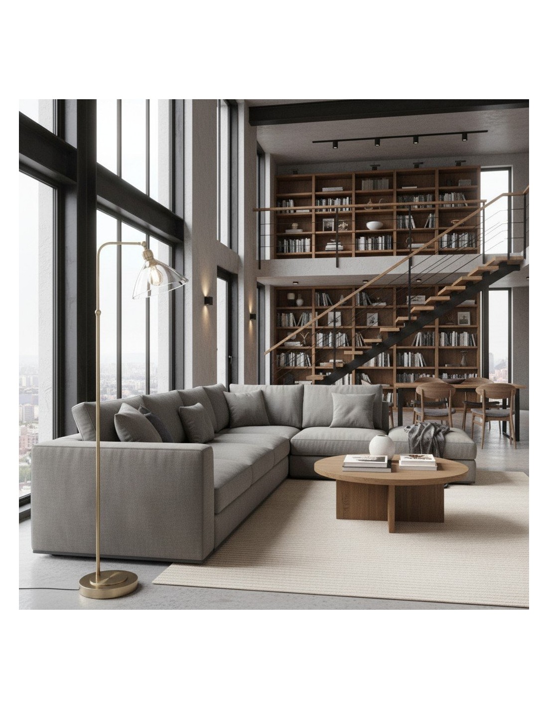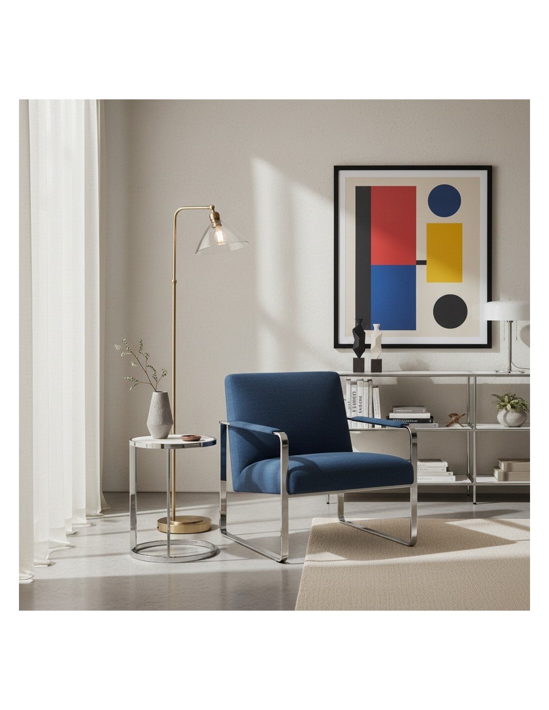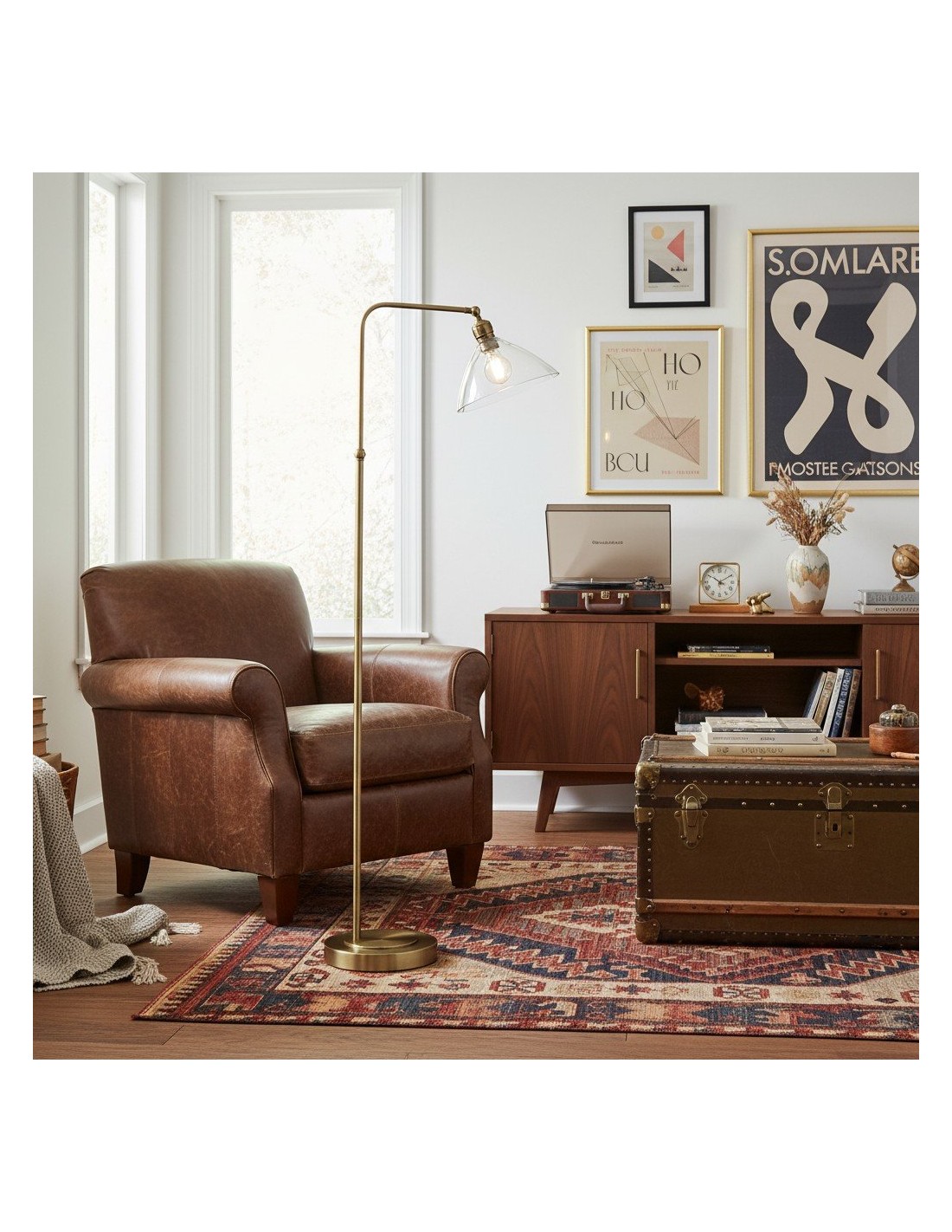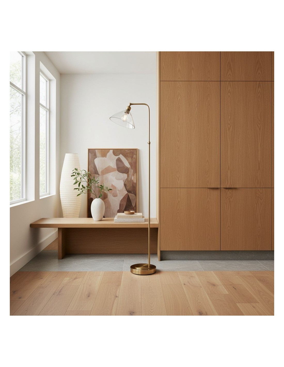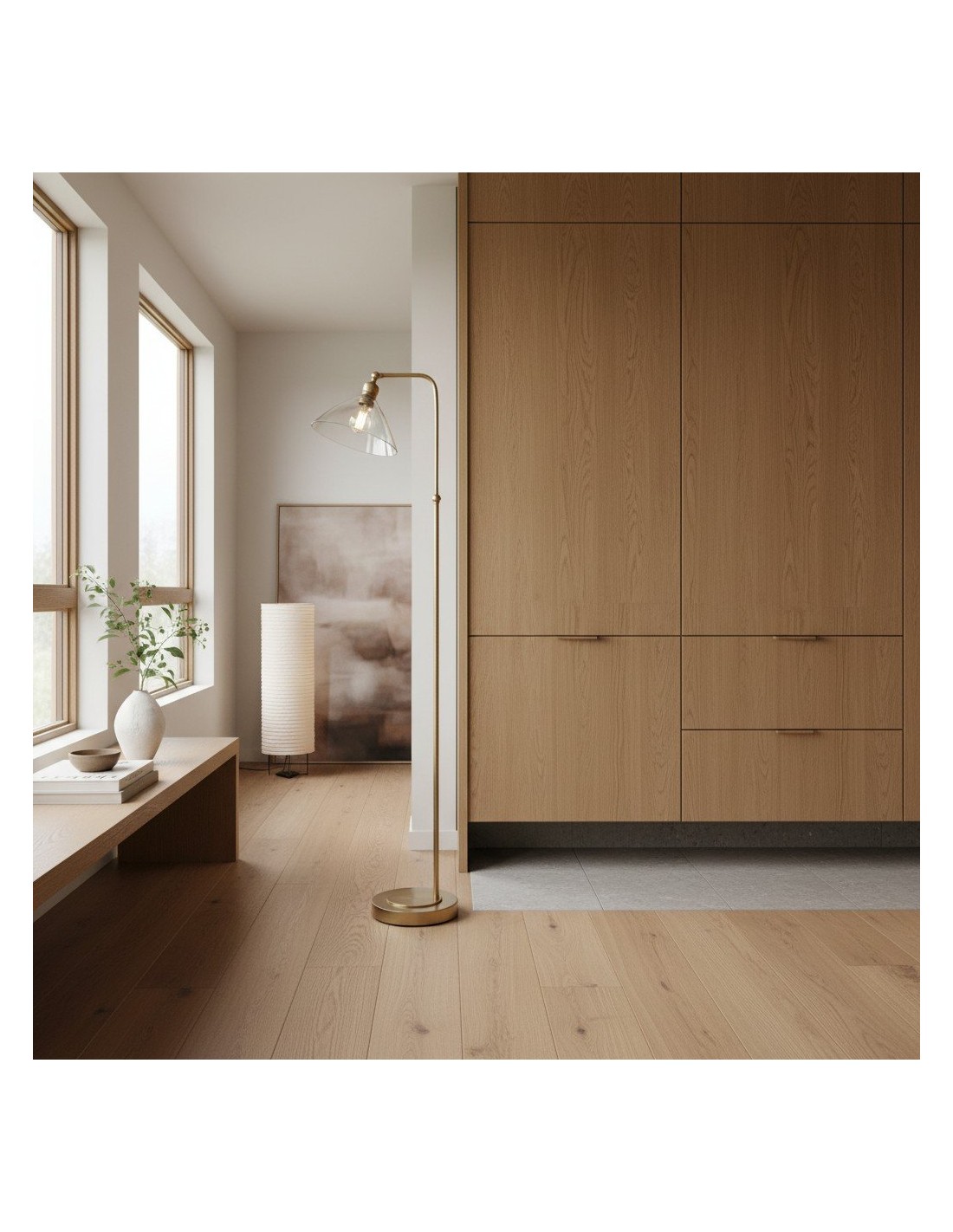 Deze verfijnde vloerlamp combineert een elegante Art Deco-esthetiek met een functioneel ontwerp. De zacht gebogen, heldere glazen kap verspreidt het licht op een sierlijke manier, terwijl de metalen voet een vleugje tijdloze elegantie toevoegt.