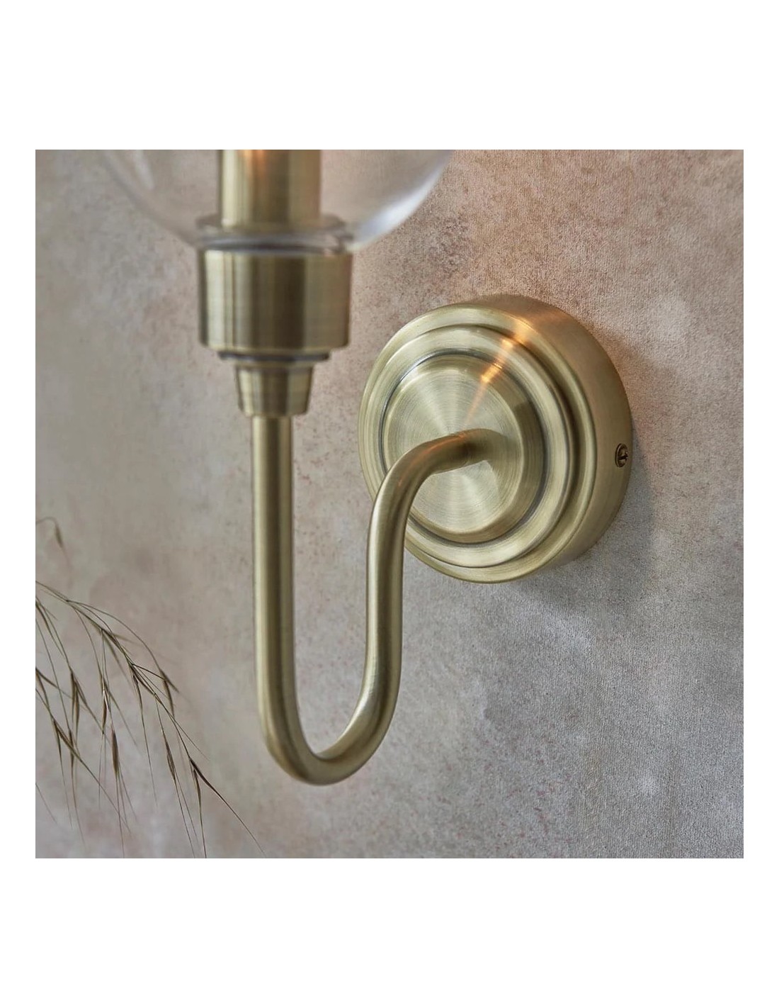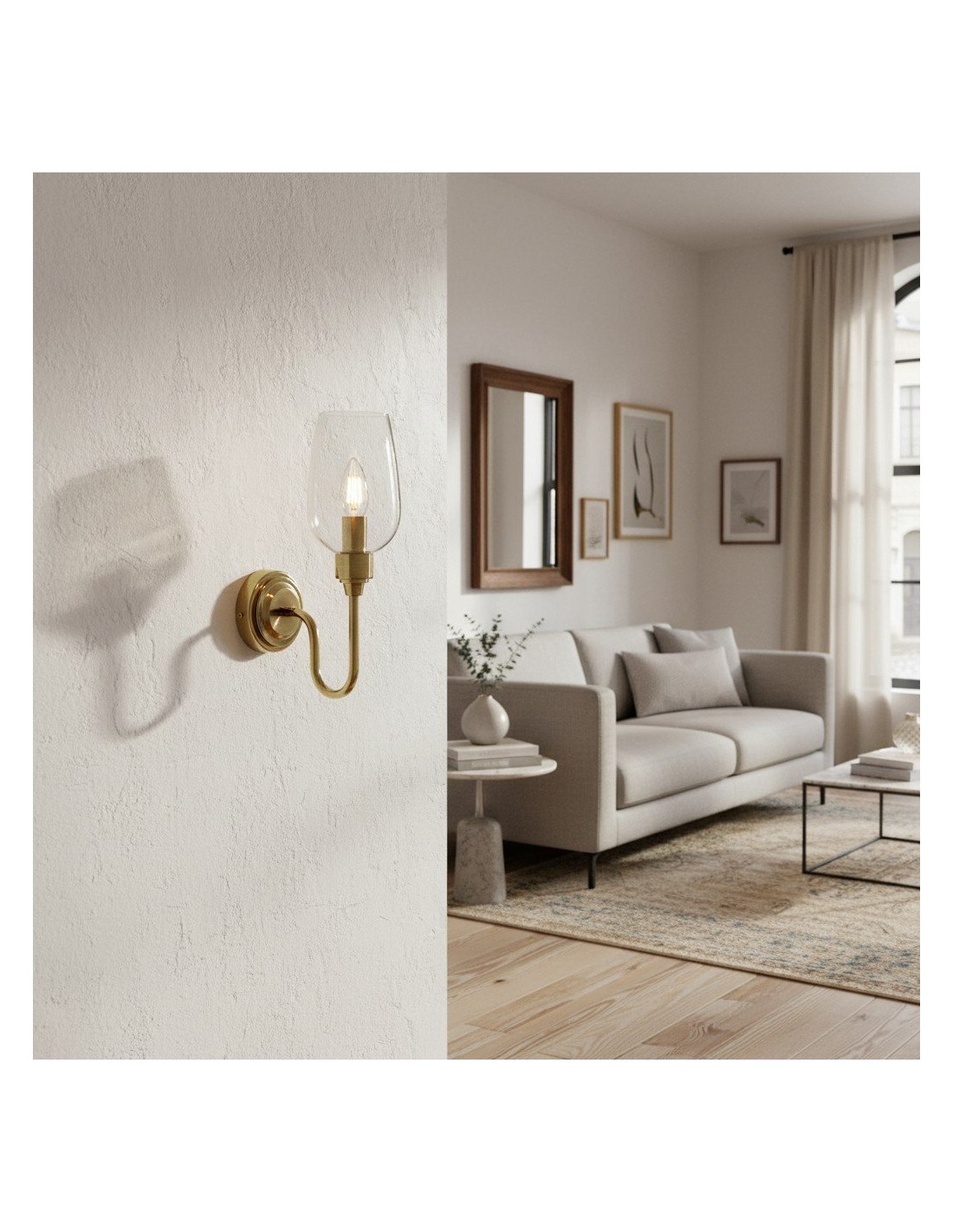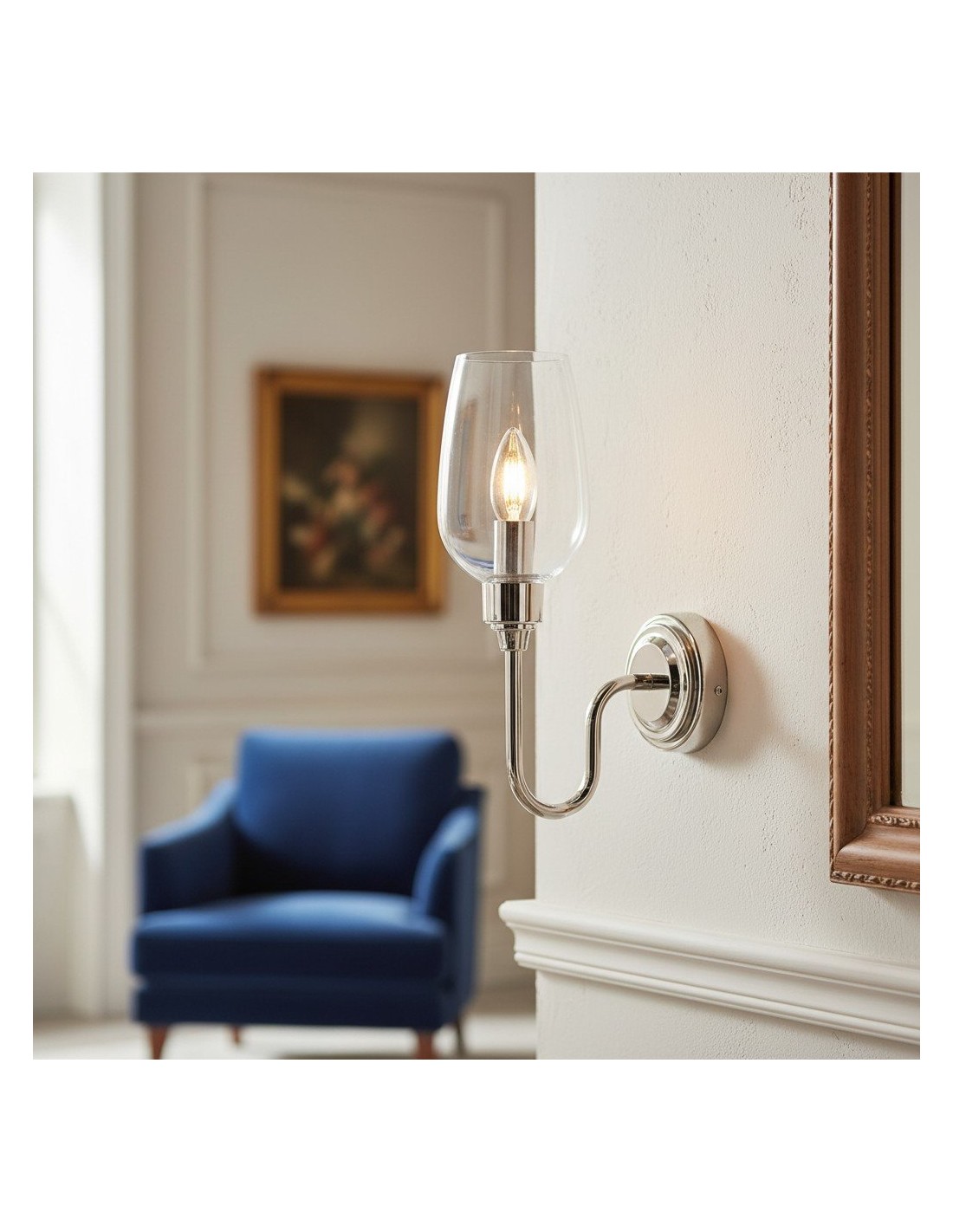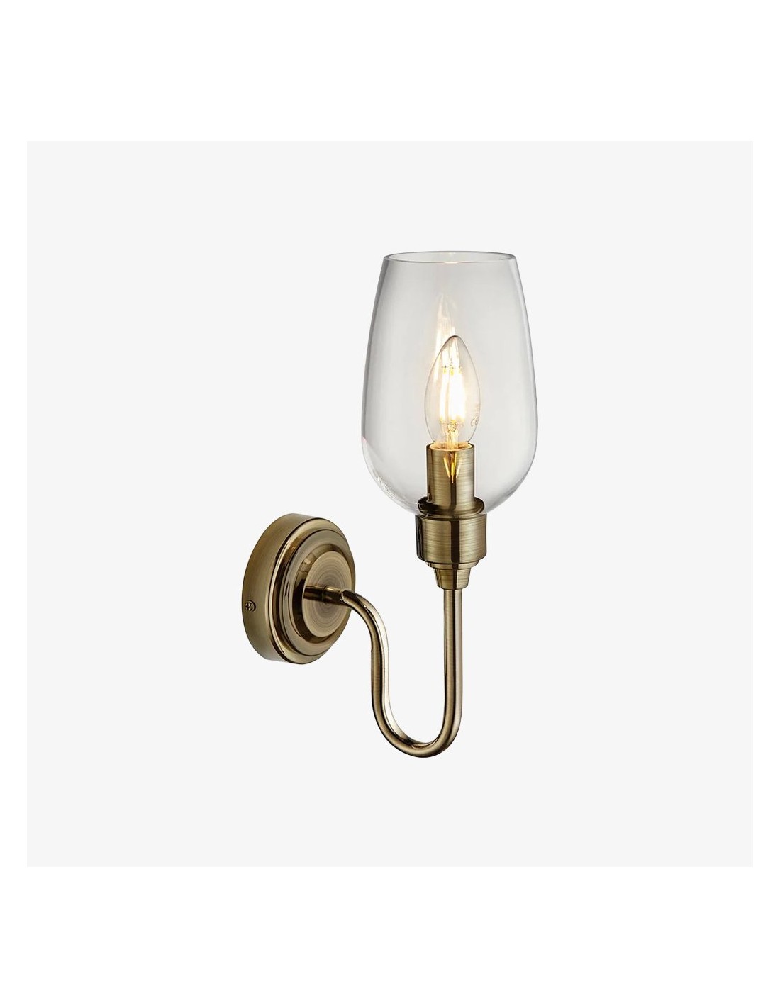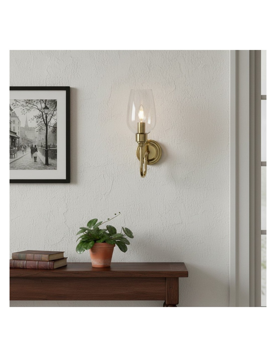 Deze art-deco wandlamp heeft een fraai vormgegeven metalen frame in combinatie met een heldere, geblazen glazen kap die het verfijnde silhouet accentueert. De vintage-geïnspireerde vorm zorgt voor een warme, decoratieve gloed, waardoor de lamp ideaal is voor hallen, woonkamers, slaapkamers en andere ruimtes die een accent vormen.