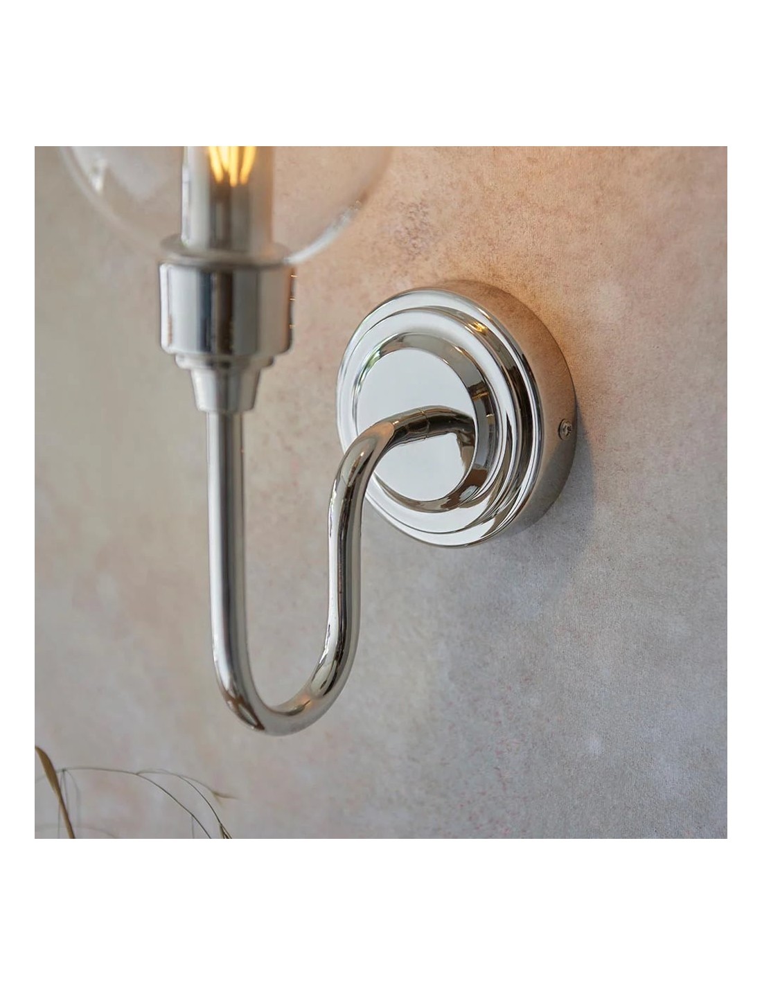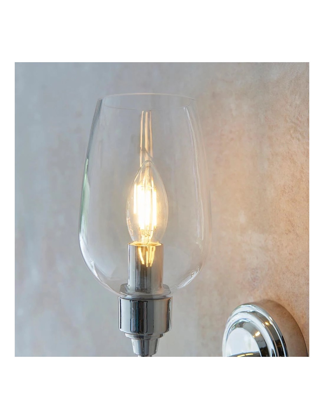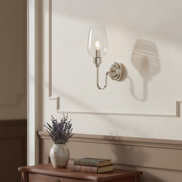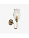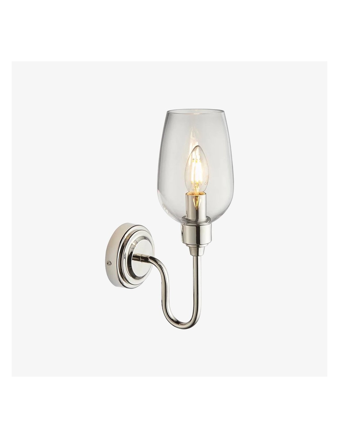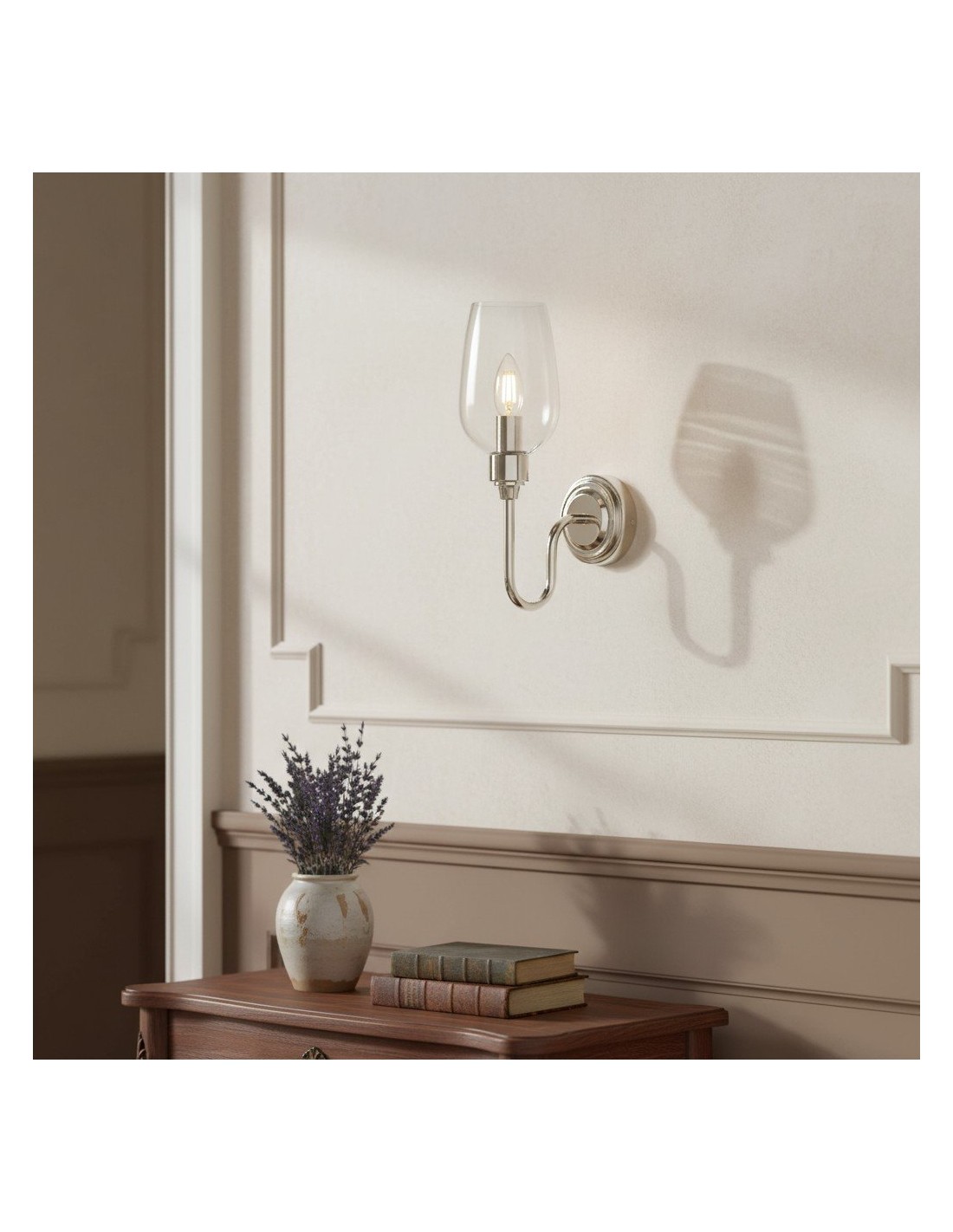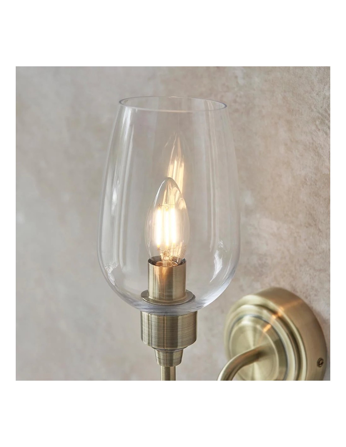 Deze art-deco wandlamp heeft een fraai vormgegeven metalen frame in combinatie met een heldere, geblazen glazen kap die het verfijnde silhouet accentueert. De vintage-geïnspireerde vorm zorgt voor een warme, decoratieve gloed, waardoor de lamp ideaal is voor hallen, woonkamers, slaapkamers en andere ruimtes die een accent vormen.