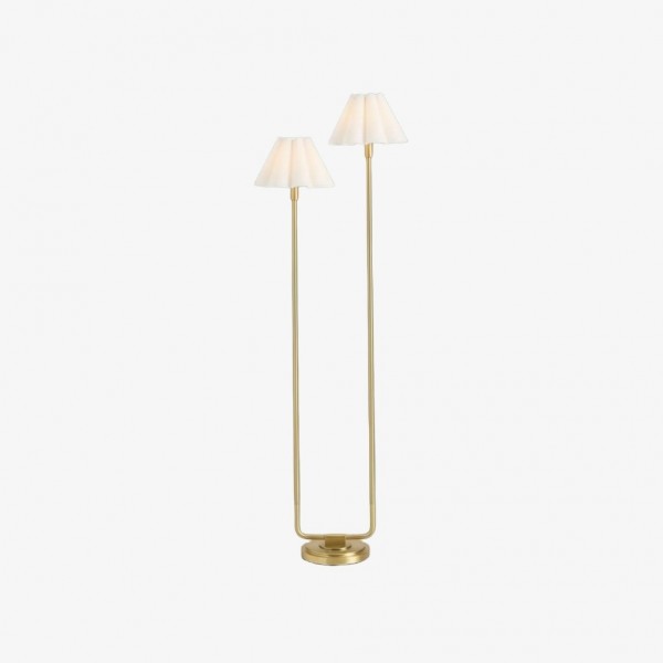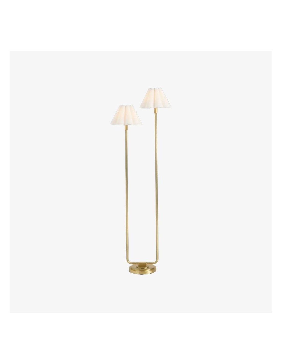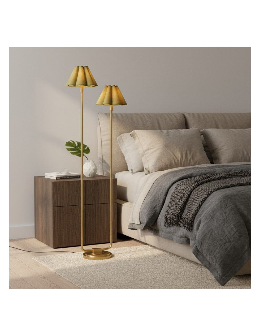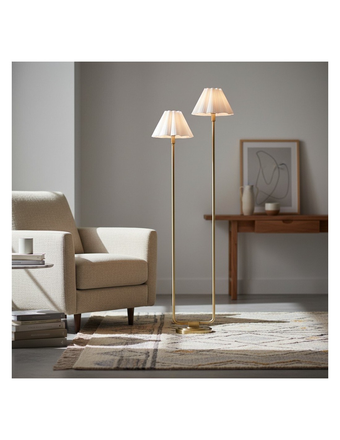 Geef uw ruimte een upgrade met deze staande lamp, waar modern minimalisme en Art Deco-charme samenkomen. Het meest opvallende kenmerk is de geplooide stoffen kap. De slanke metalen voet en de stevige ronde basis zorgen voor een strakke, elegante uitstraling die in elk interieur past. Perfect voor de woonkamer, slaapkamer of kantoor.