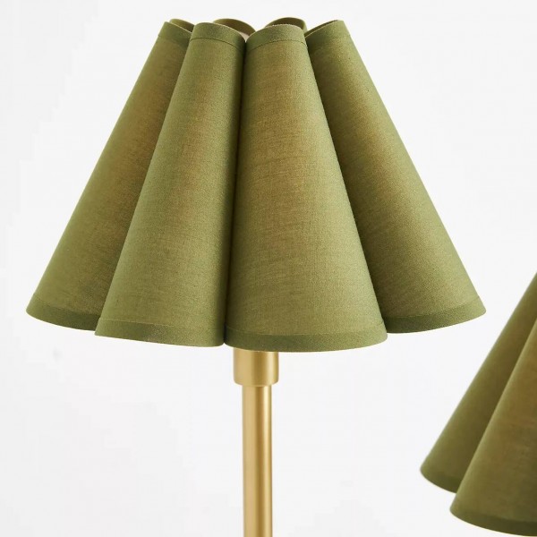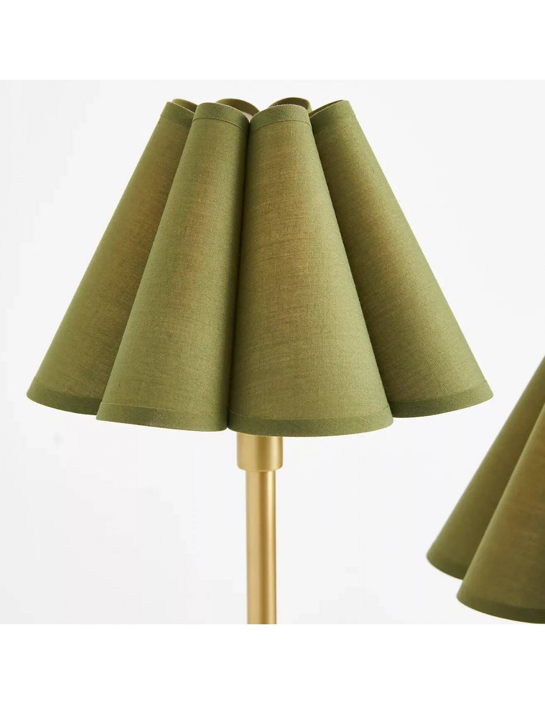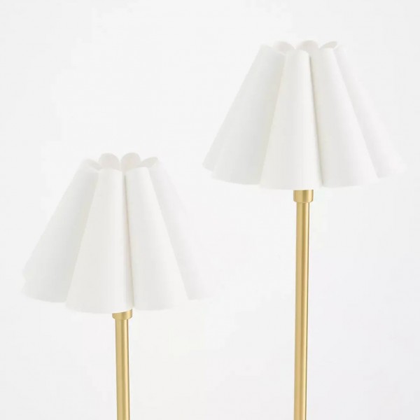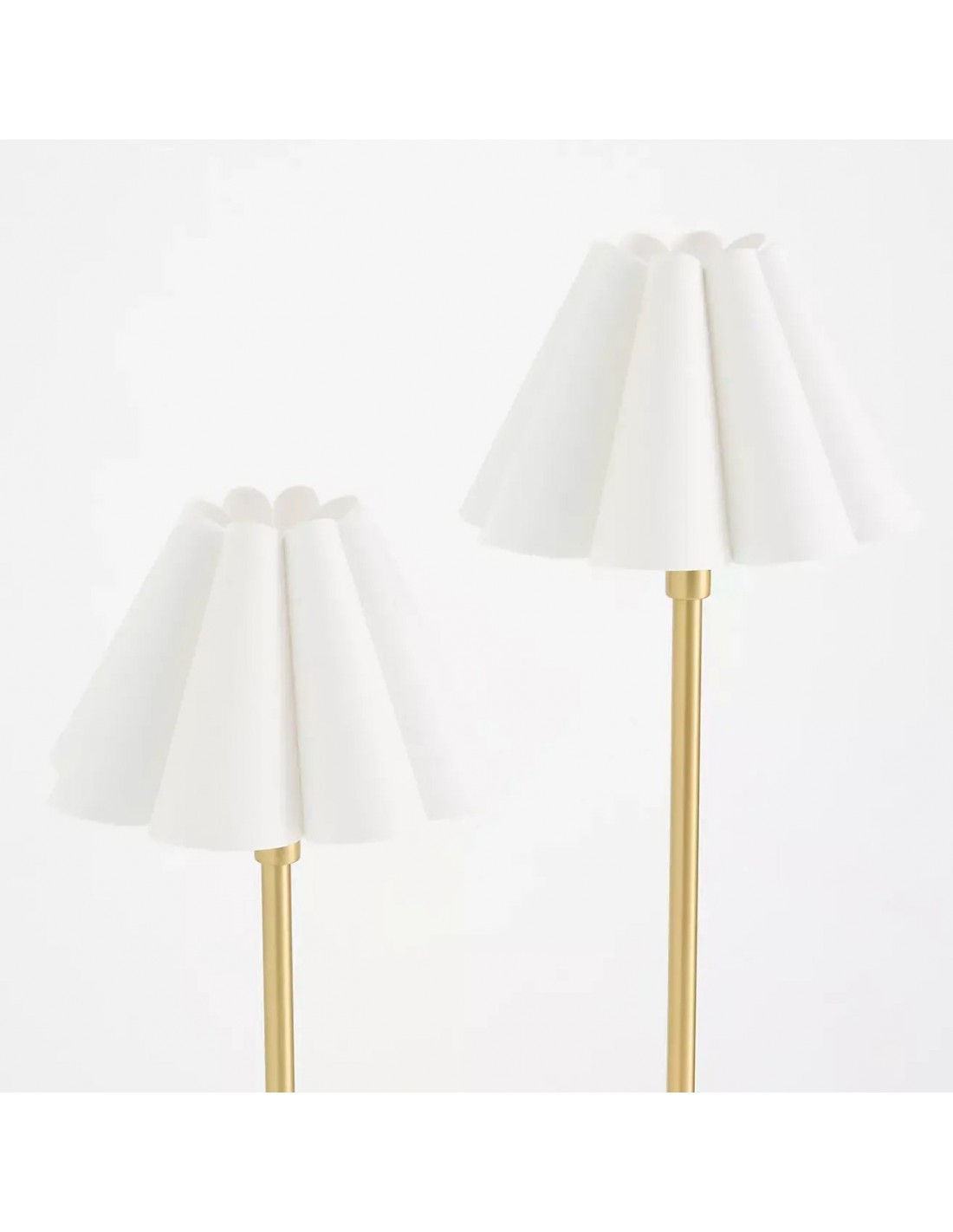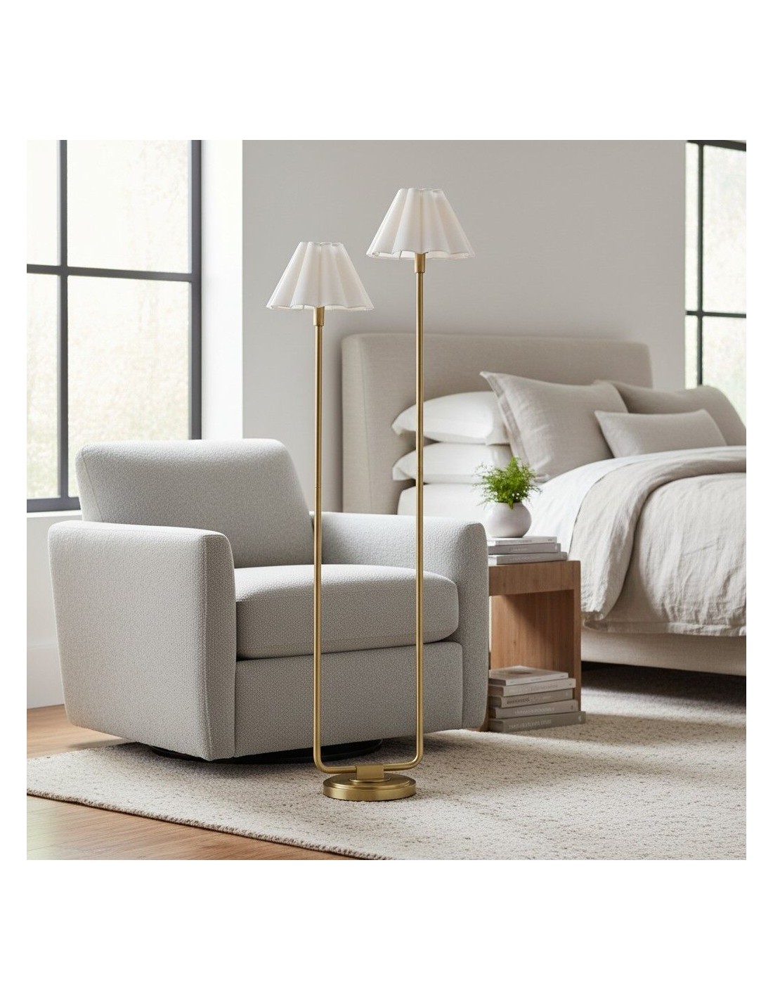 Geef uw ruimte een upgrade met deze staande lamp, waar modern minimalisme en Art Deco-charme samenkomen. Het meest opvallende kenmerk is de geplooide stoffen kap. De slanke metalen voet en de stevige ronde basis zorgen voor een strakke, elegante uitstraling die in elk interieur past. Perfect voor de woonkamer, slaapkamer of kantoor.