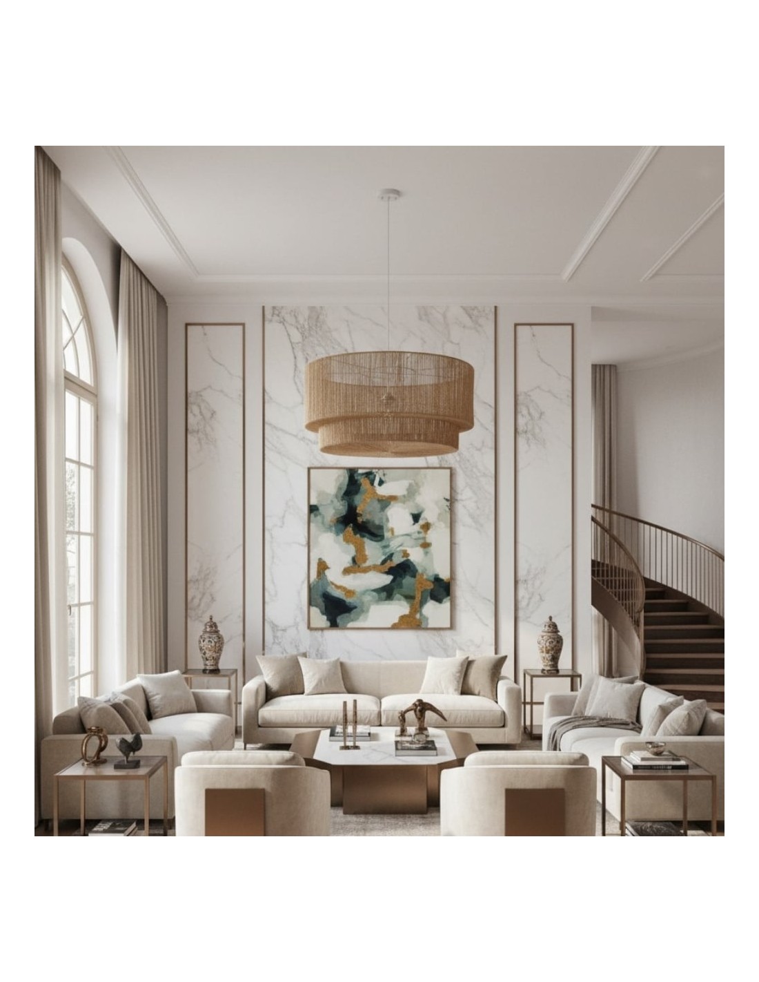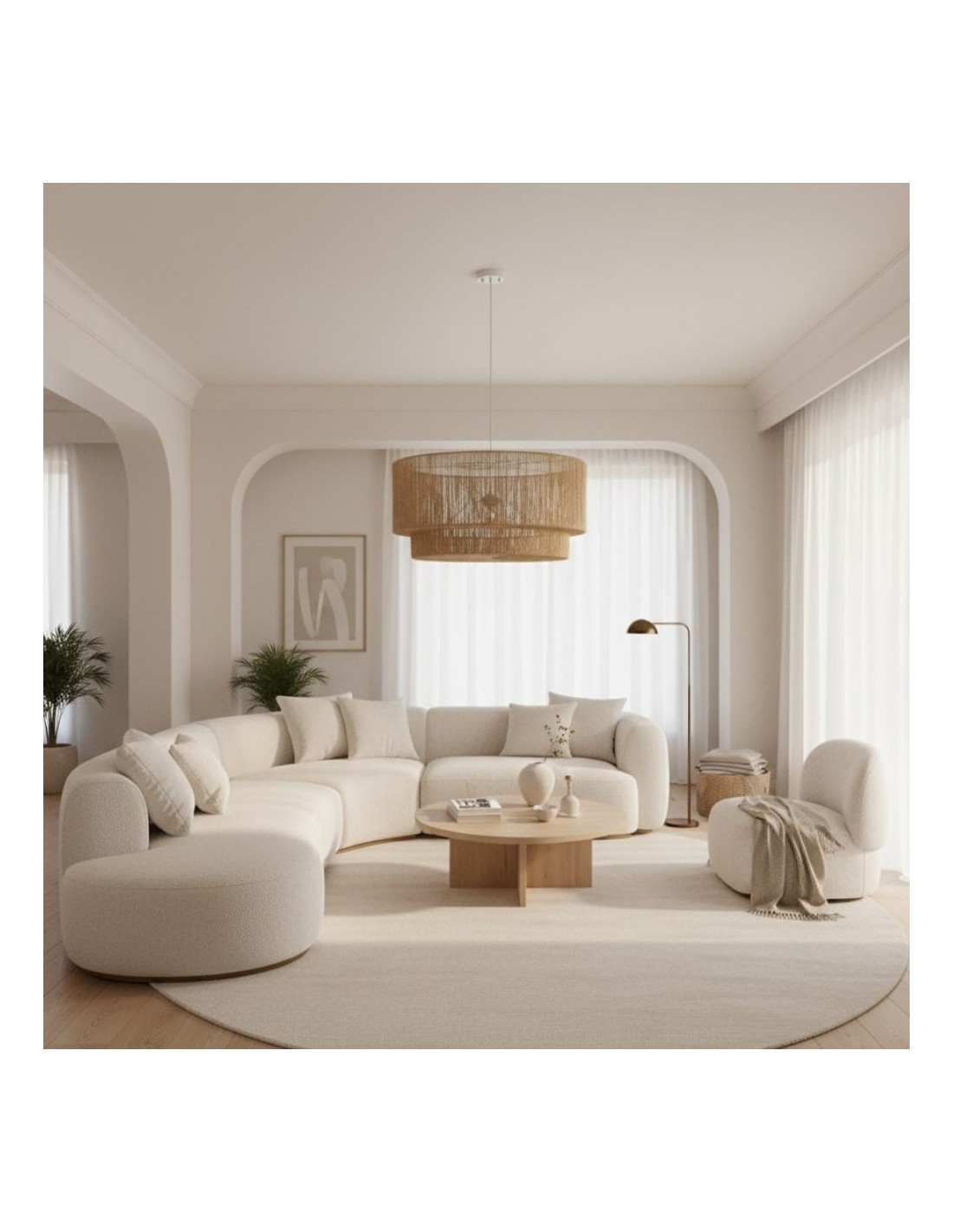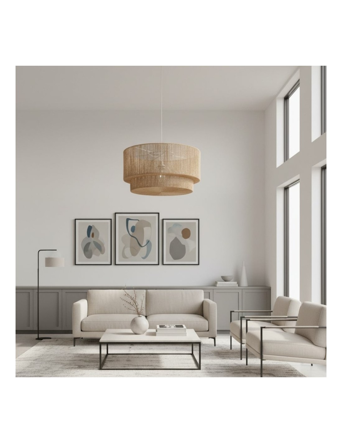 De Florevian hanglamp is een prachtig vormgegeven plafondlamp in trommelvorm, omwikkeld met geweven jute. De lamp combineert een natuurlijke textuur met een strakke, moderne vormgeving. Het ontwerp met twee lagen zorgt voor een zacht gelaagd effect en diffuus licht, dat perfect past in interieurs met een bohemian, kust- of organische stijl.