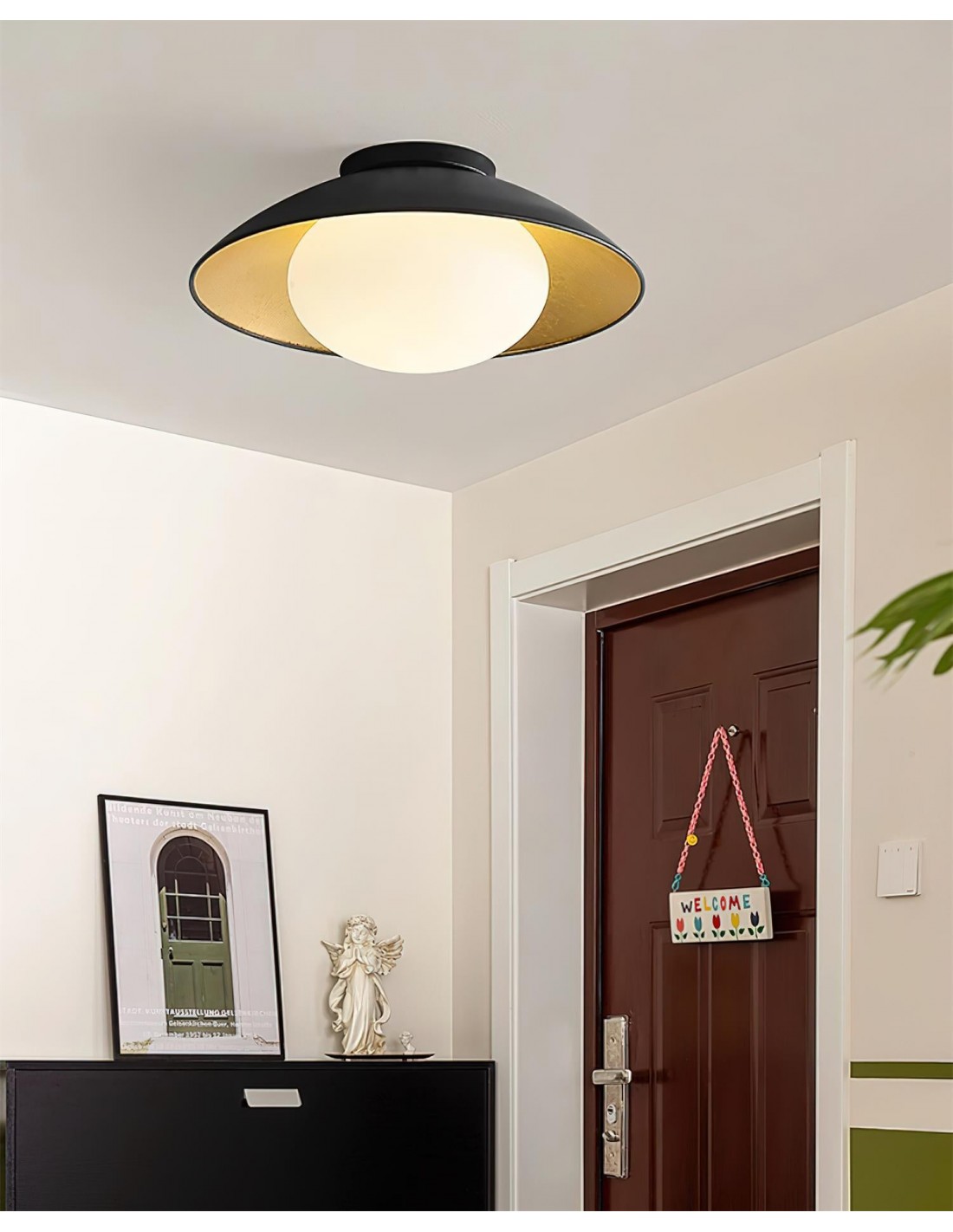 Deze plafondlamp combineert minimalistisch design perfect met moderne esthetiek. De zwarte lampenkap met gouden binnendetails injecteert een warme gloed in de hele ruimte. De ronde lichtbol die in het midden hangt, straalt een zacht licht uit, wat een serene en gezellige sfeer creëert. Of het nu in de woonkamer, slaapkamer of studeerkamer wordt geplaatst, het zal een middelpunt worden dat de algehele smaak van de ruimte verbetert.