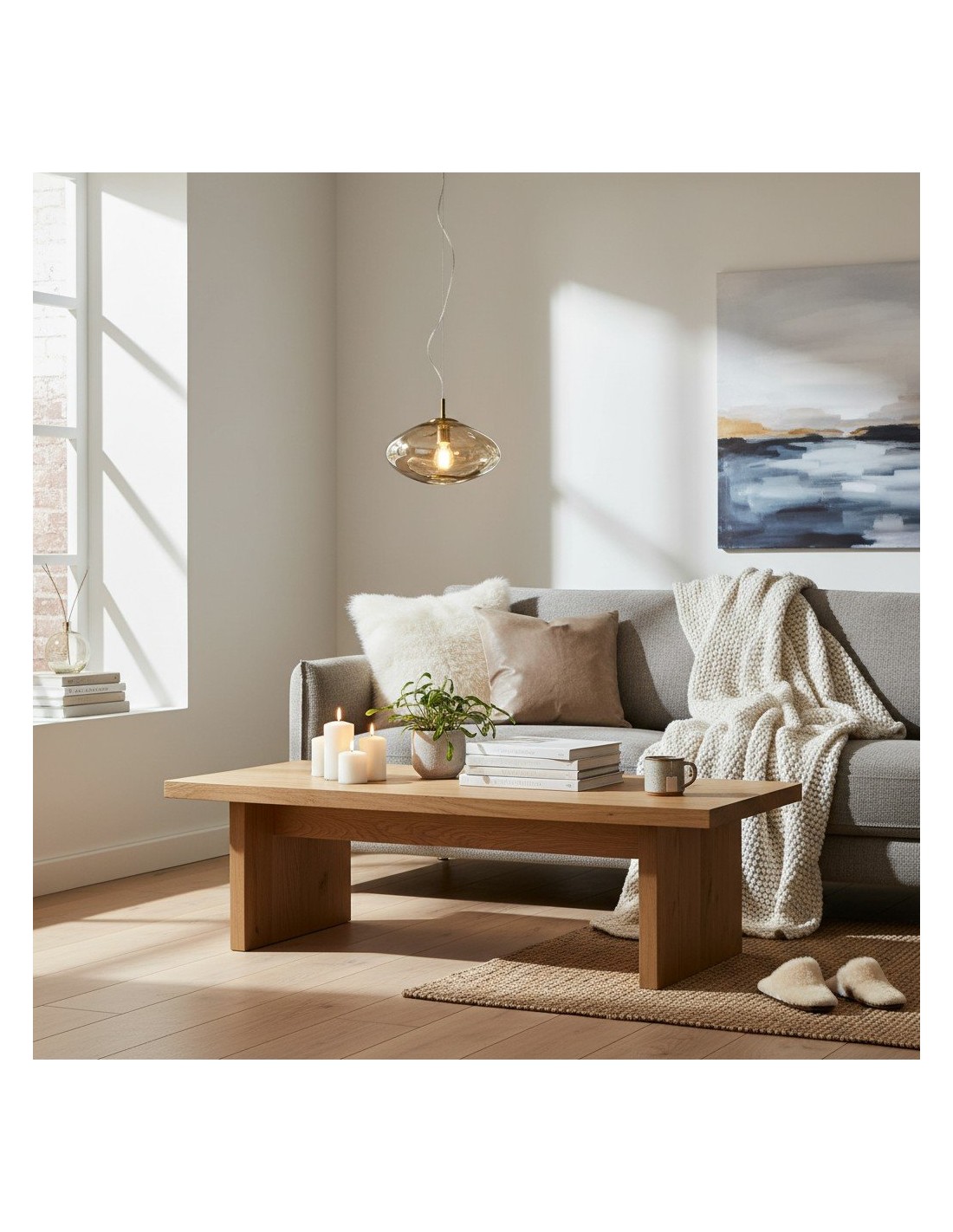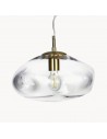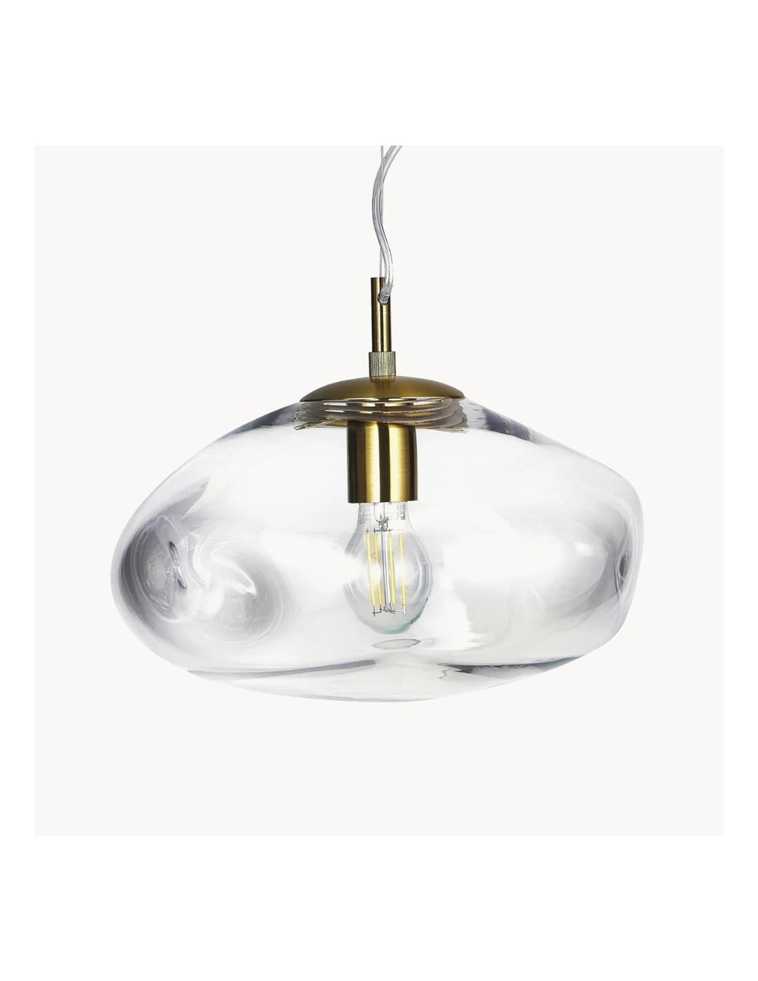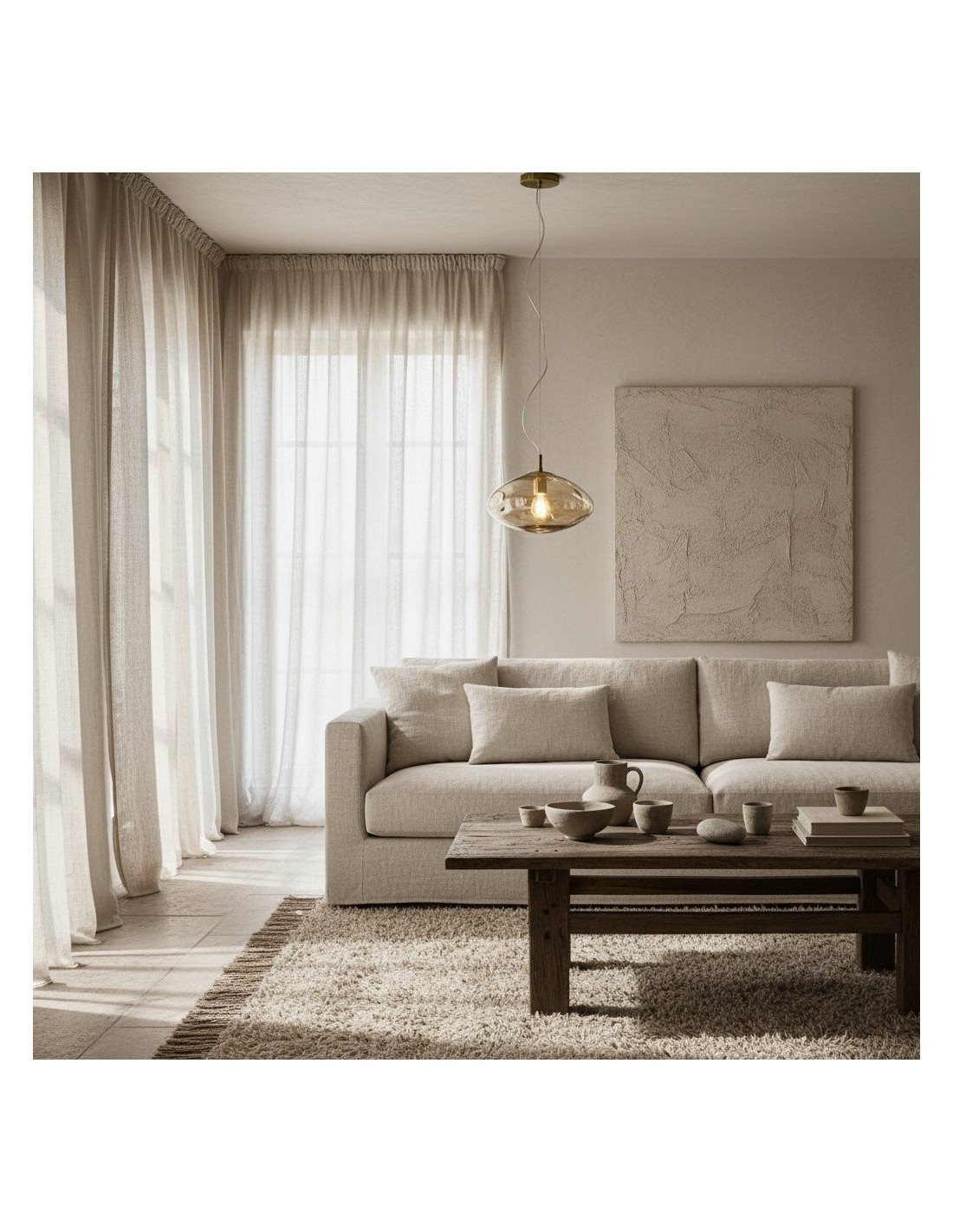 Een verfijnde glazen hanglamp met een zacht gebogen kap, een slank snoer en een discreet metalen plafondpaneel. Het heldere of getinte glas verspreidt een warme, gelaagde gloed, terwijl het sculpturale silhouet een moderne, elegante touch toevoegt. Ideaal voor eettafels, keukeneilanden, entrees of slaapkamers.