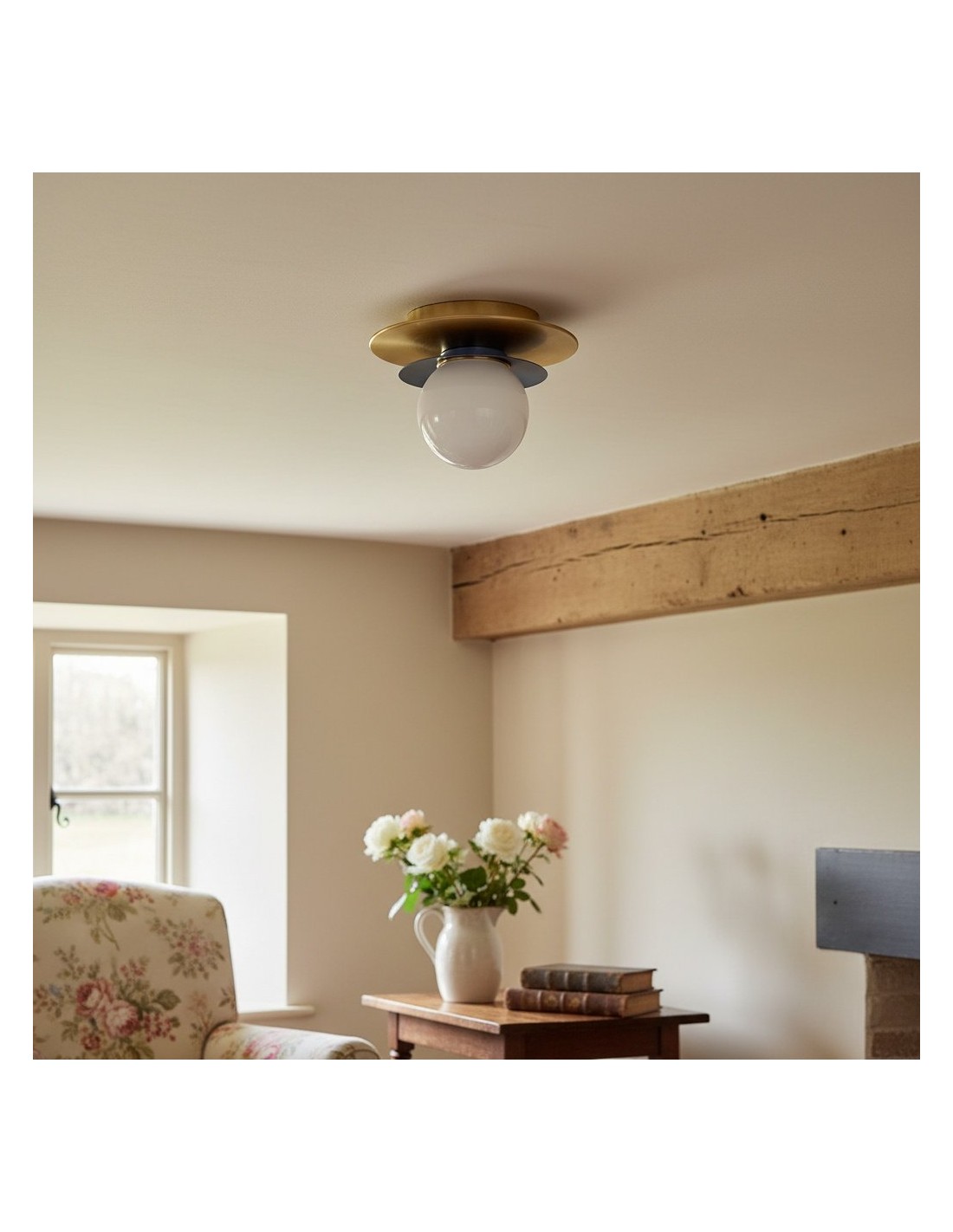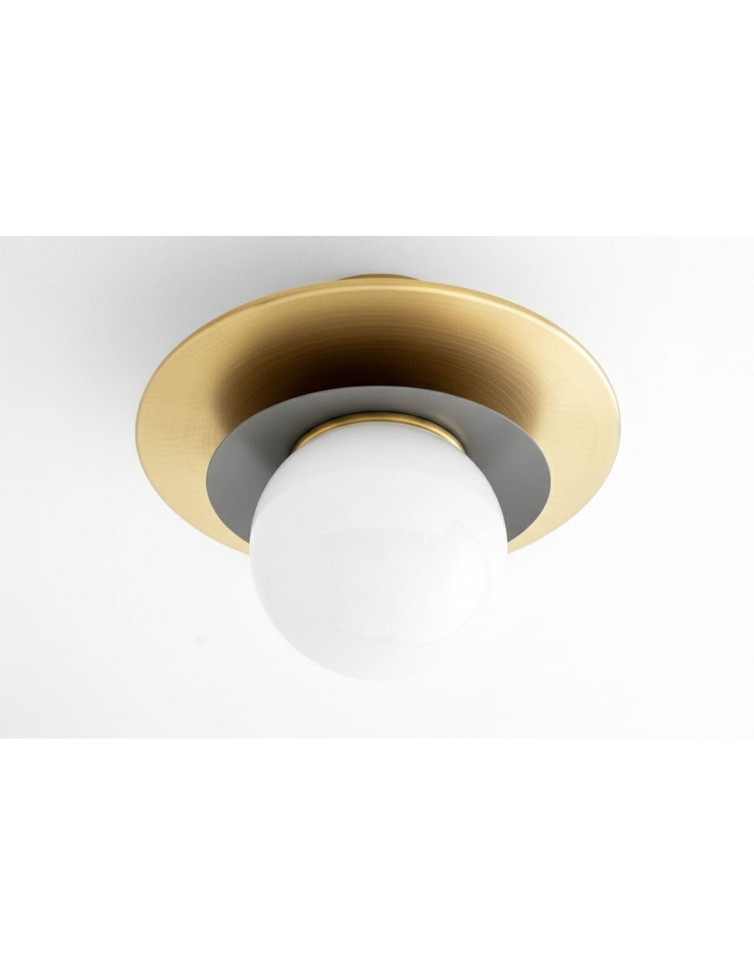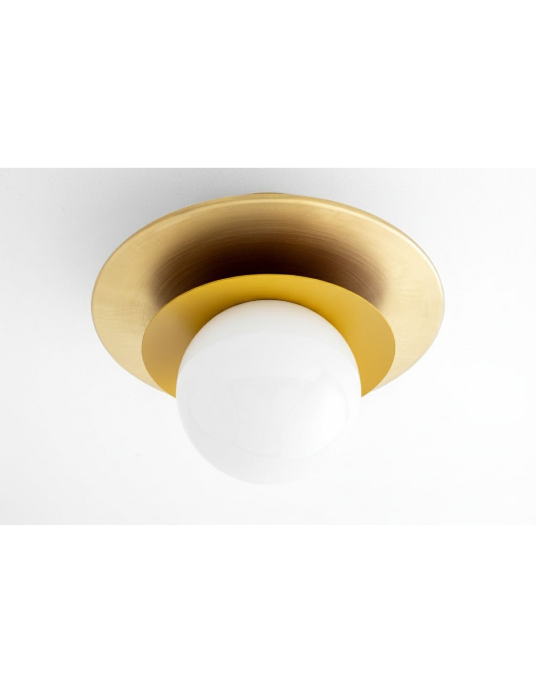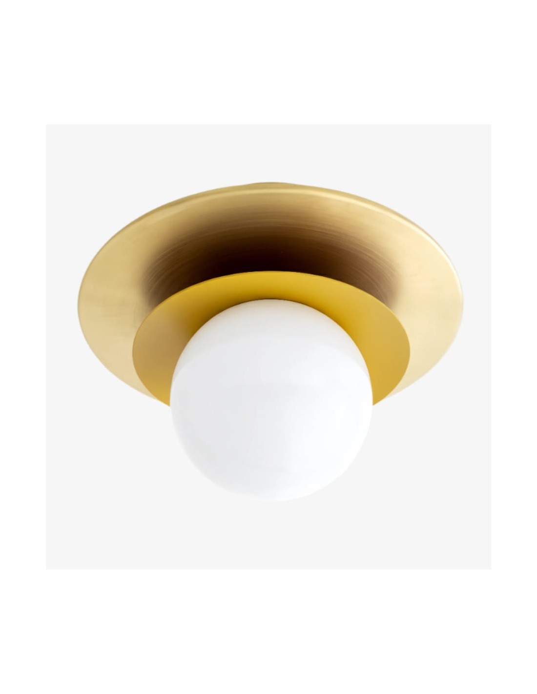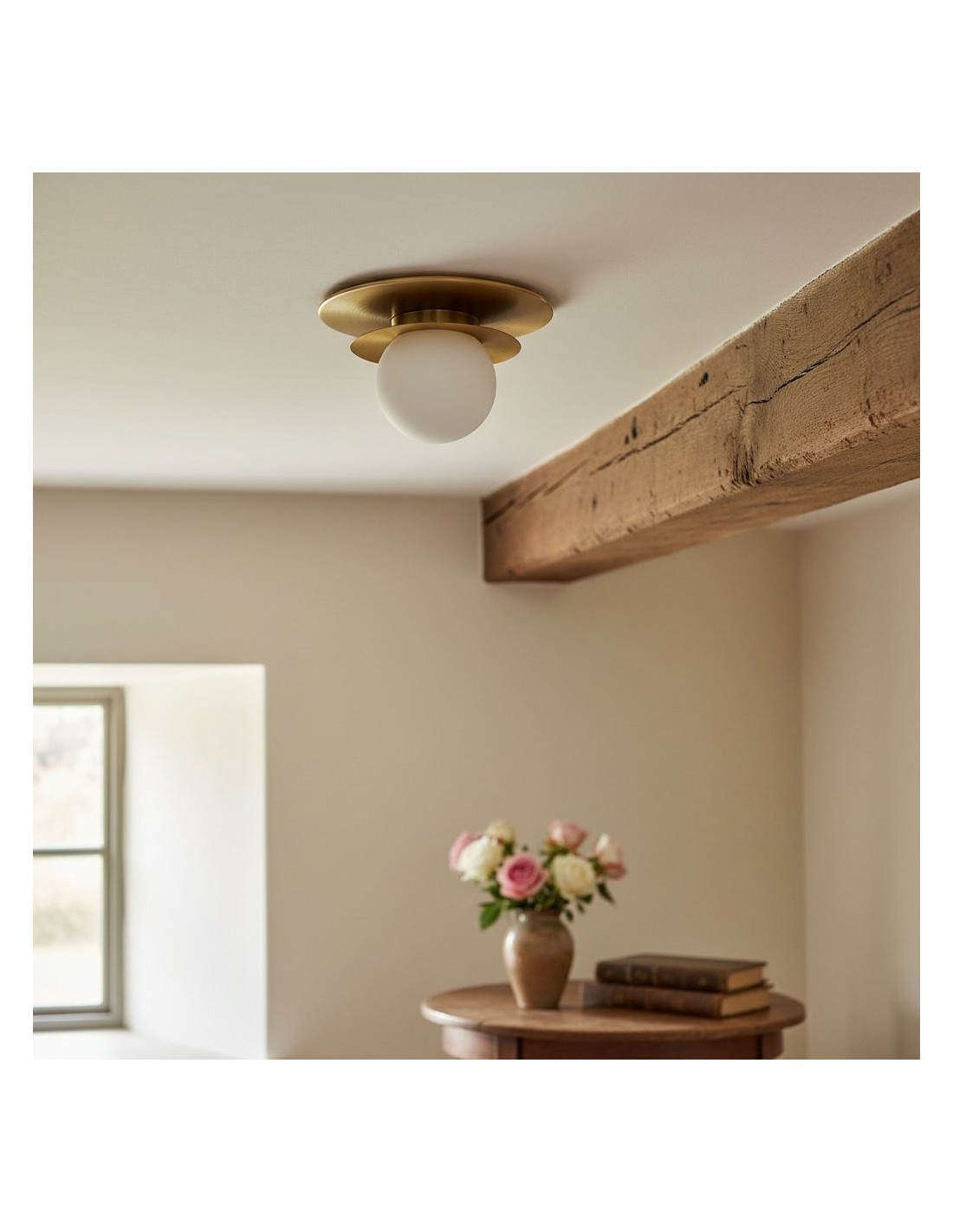 Verfraai uw ruimte met deze moderne plafondlamp van messing. Met zijn strakke design met een messing afwerking en subtiele accentring voegt hij een vleugje elegantie toe aan elke kamer. Perfect om de sfeer in uw huis te verbeteren met een mix van eigentijdse stijl en tijdloze charme.