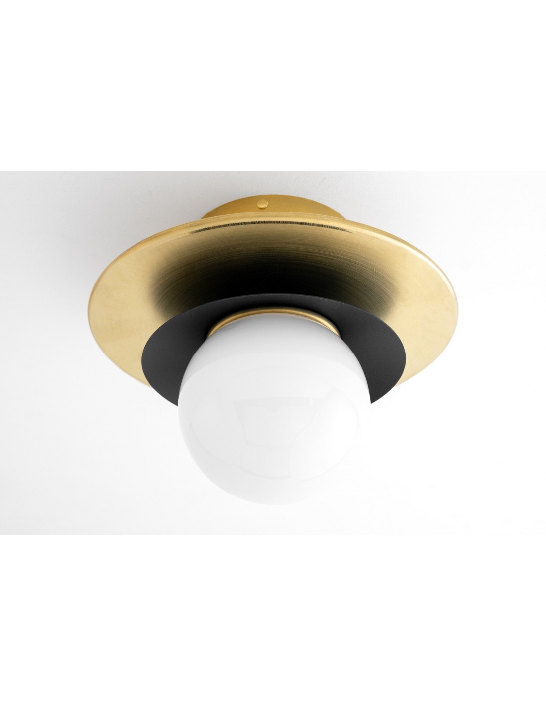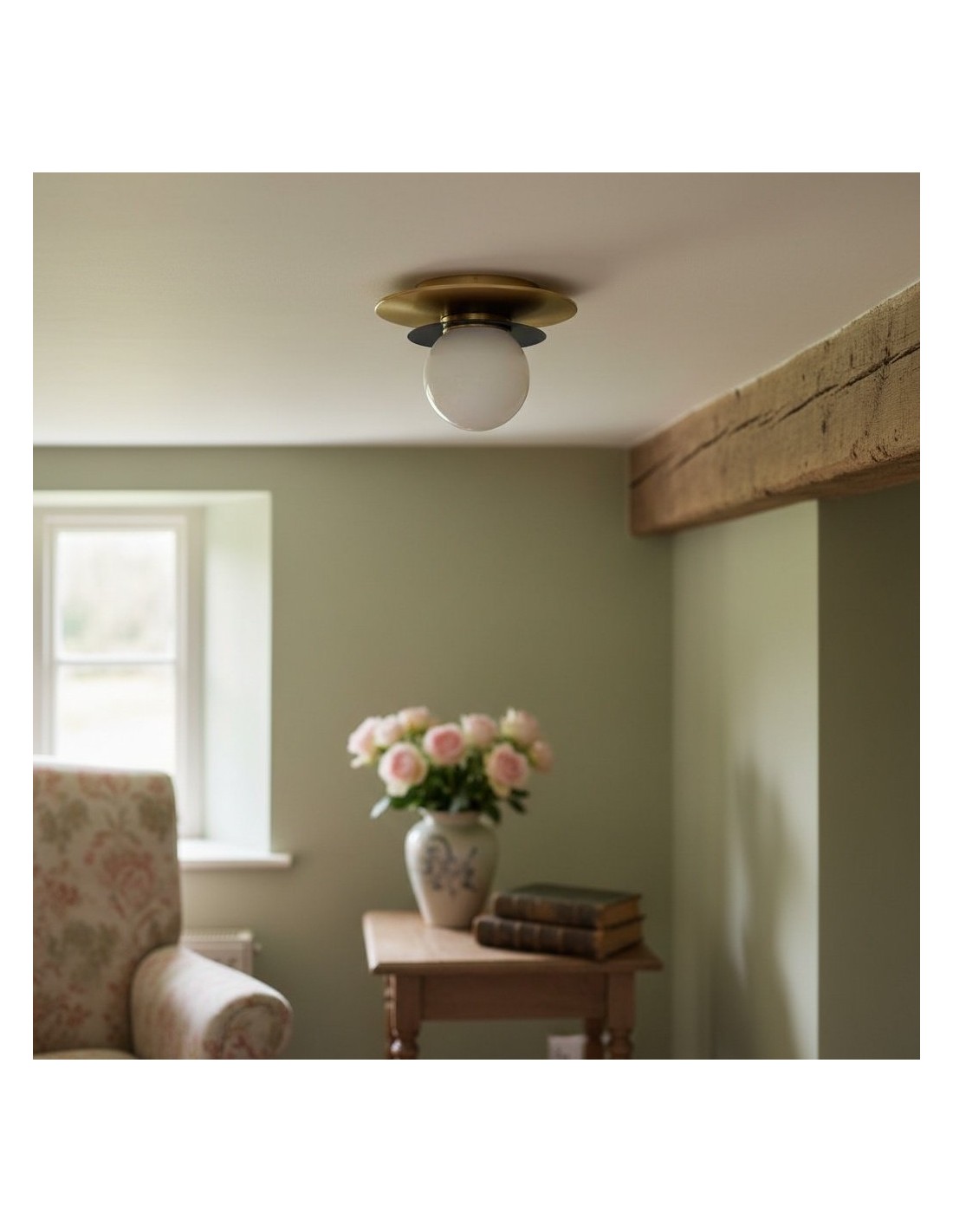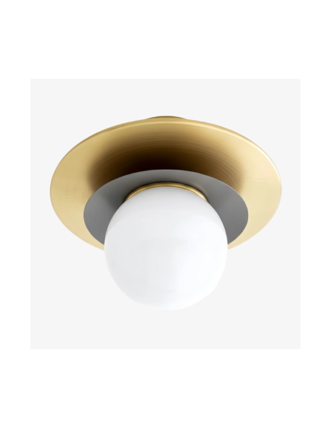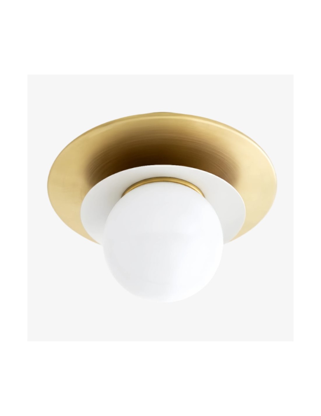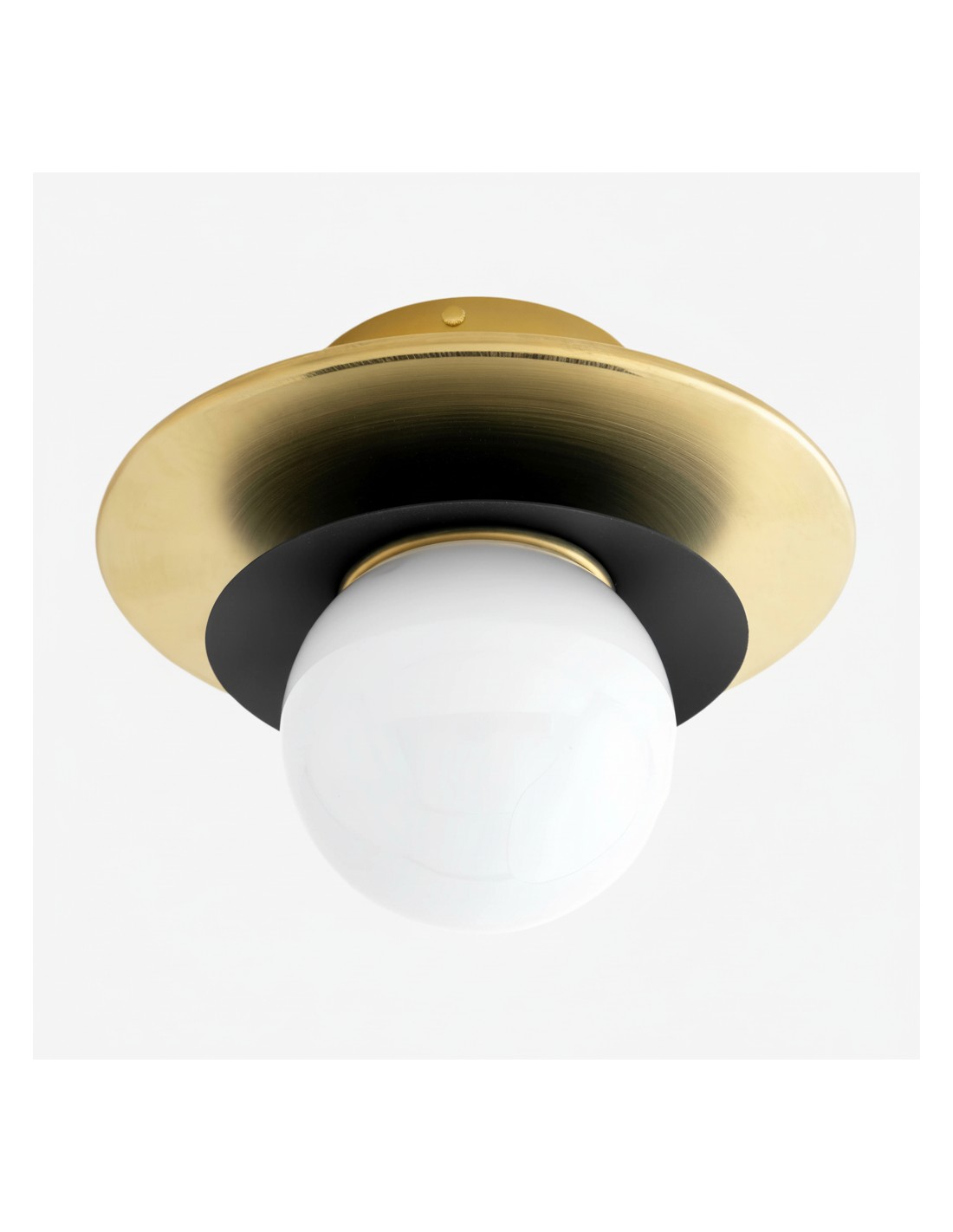 Verfraai uw ruimte met deze moderne plafondlamp van messing. Met zijn strakke design met een messing afwerking en subtiele accentring voegt hij een vleugje elegantie toe aan elke kamer. Perfect om de sfeer in uw huis te verbeteren met een mix van eigentijdse stijl en tijdloze charme.