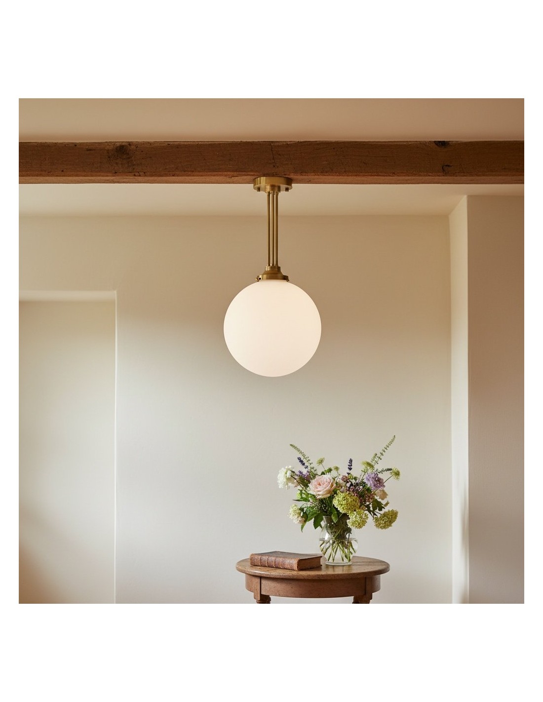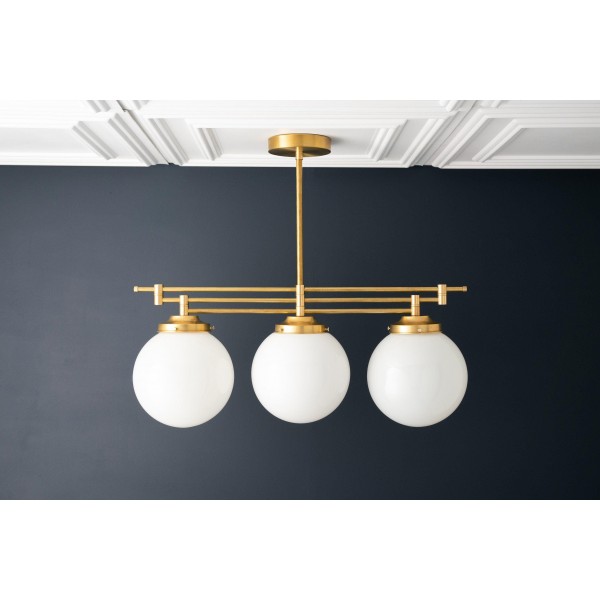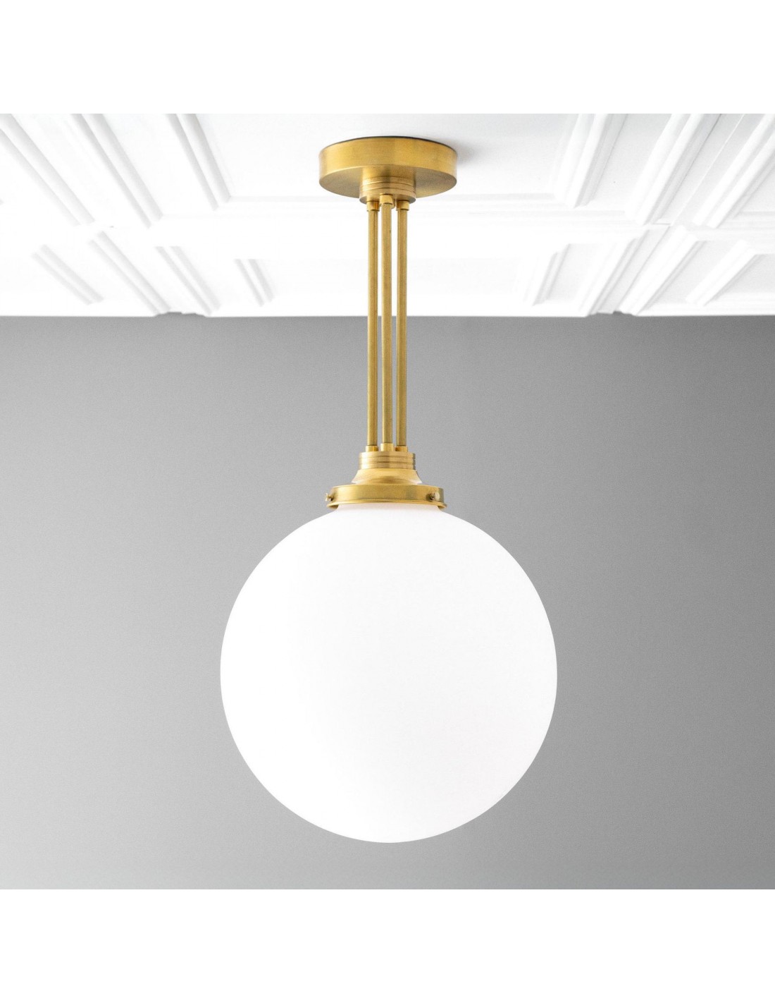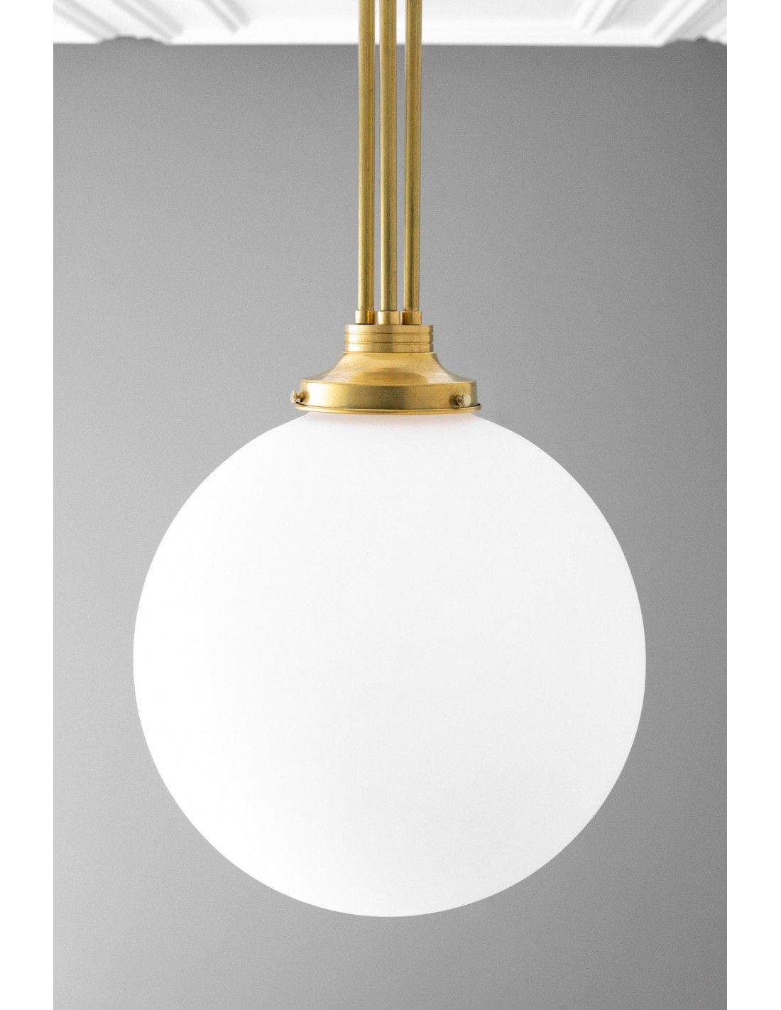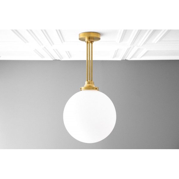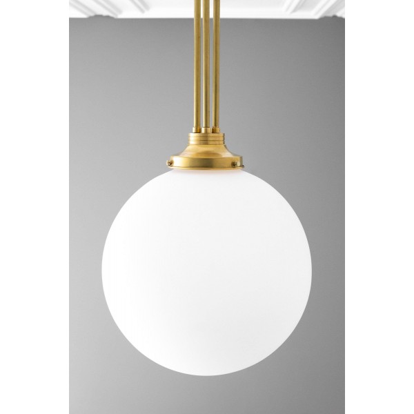 Een verfijnde hanglamp met een grote bol van mat glas en decoratieve messing staven, geïnspireerd op art-decostijl. De bol van 30 cm verspreidt het licht zacht en voegt warmte en elegantie toe. Ideaal voor keukens, gangen en woonkamers, combineert dit opvallende stuk vintage details met een moderne uitstraling.