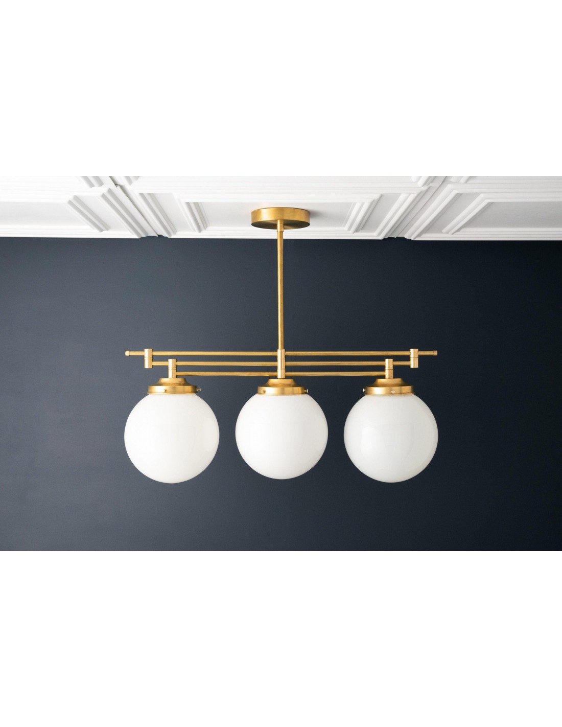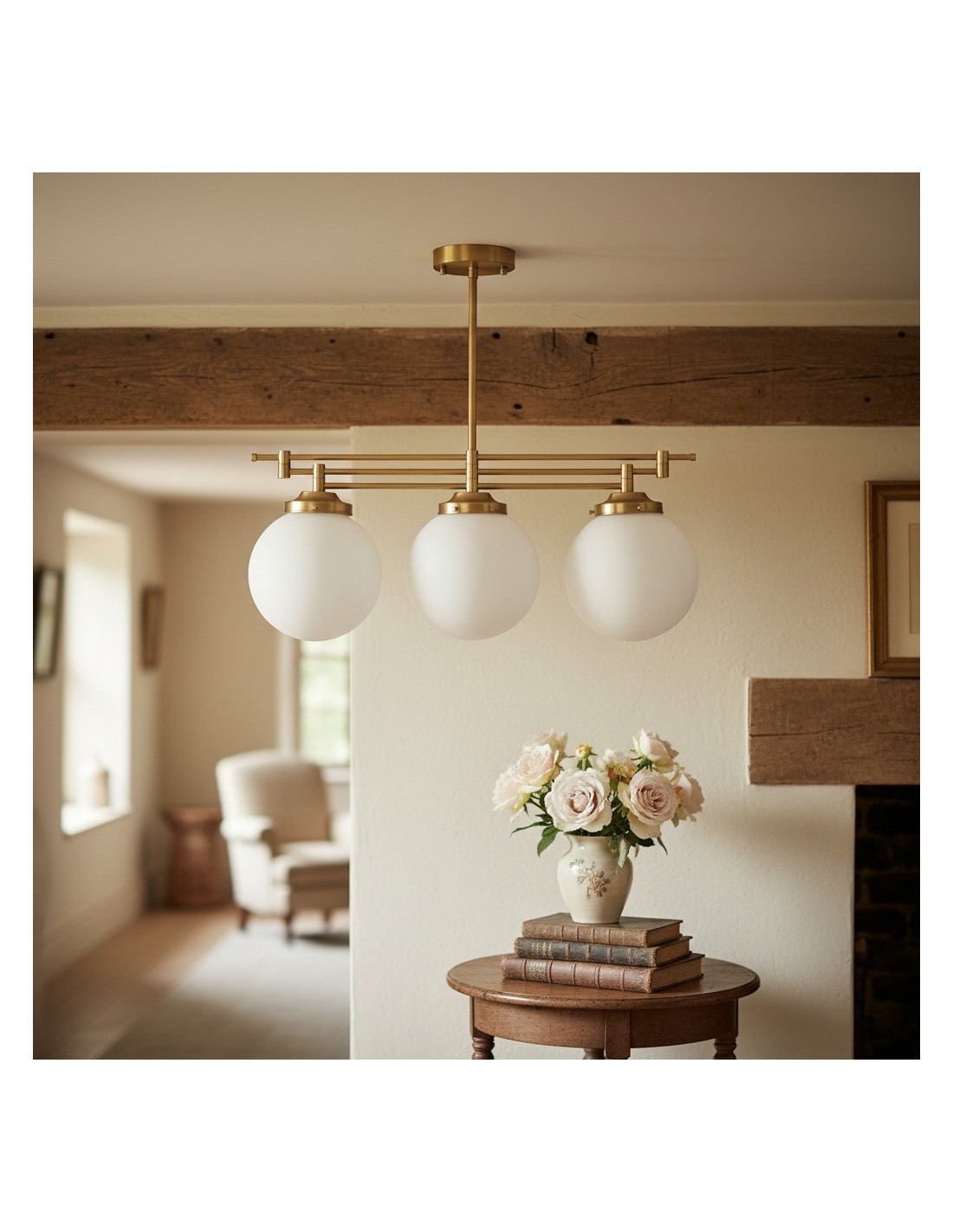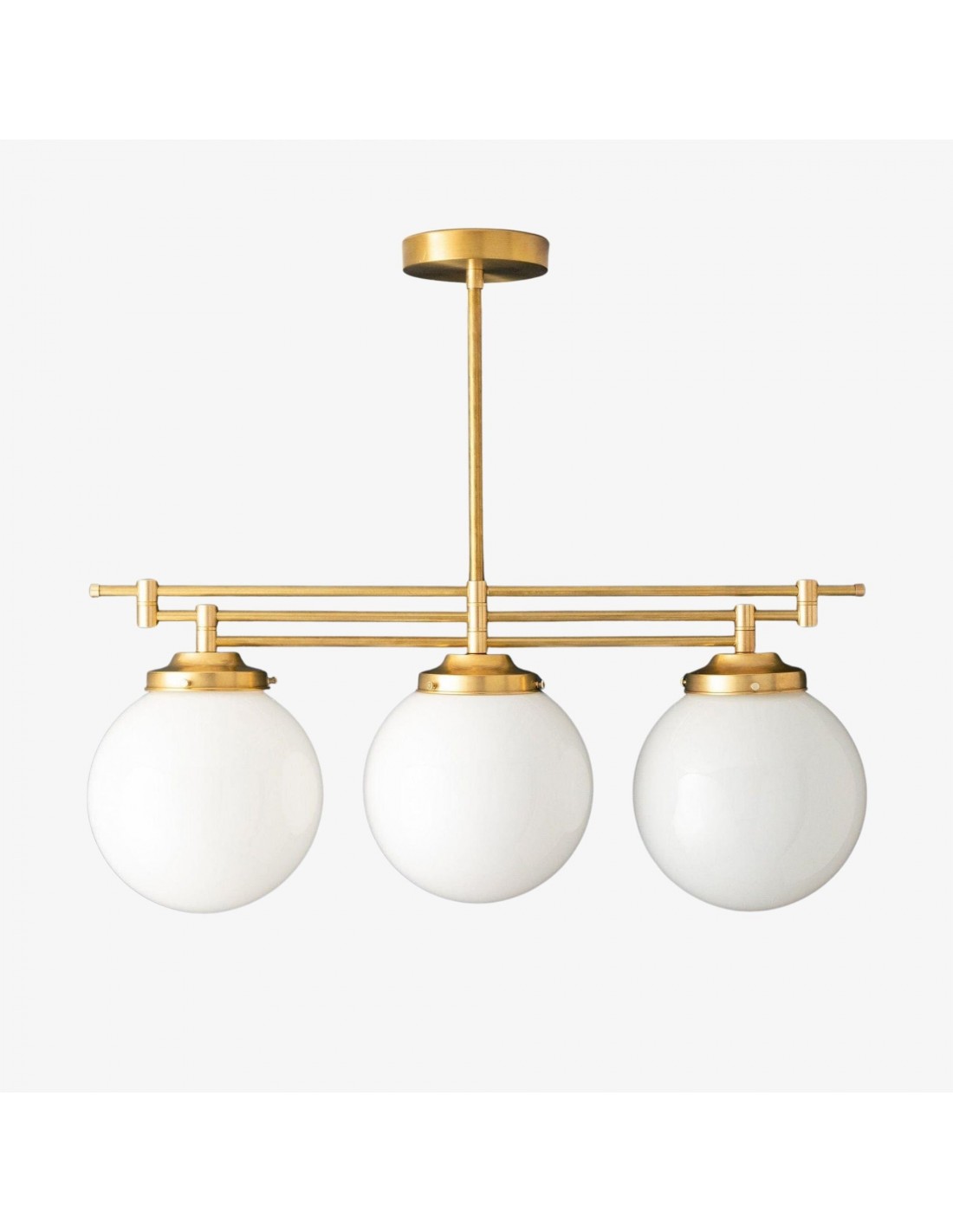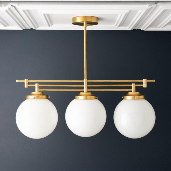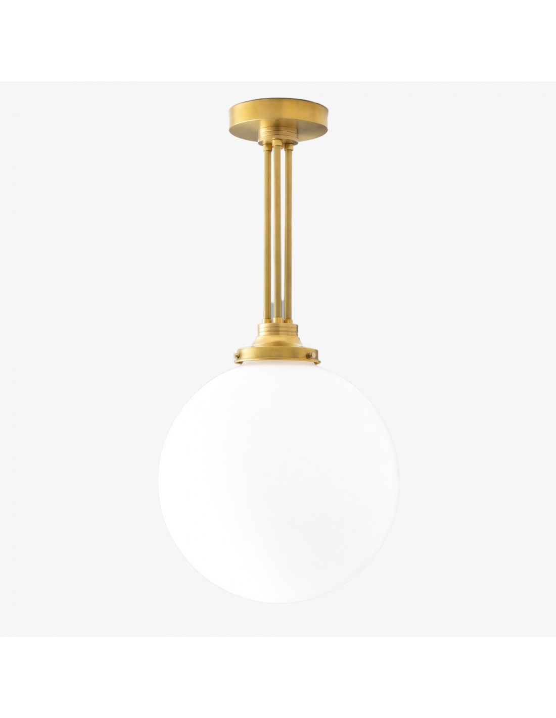 Een verfijnde hanglamp met een grote bol van mat glas en decoratieve messing staven, geïnspireerd op art-decostijl. De bol van 30 cm verspreidt het licht zacht en voegt warmte en elegantie toe. Ideaal voor keukens, gangen en woonkamers, combineert dit opvallende stuk vintage details met een moderne uitstraling.