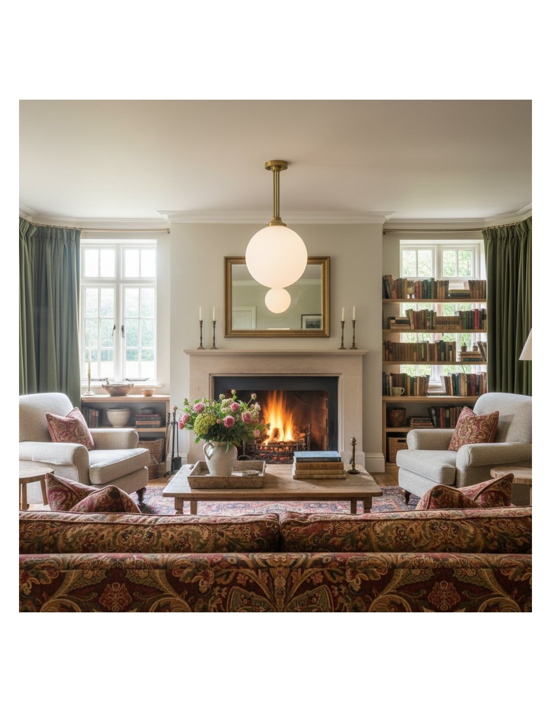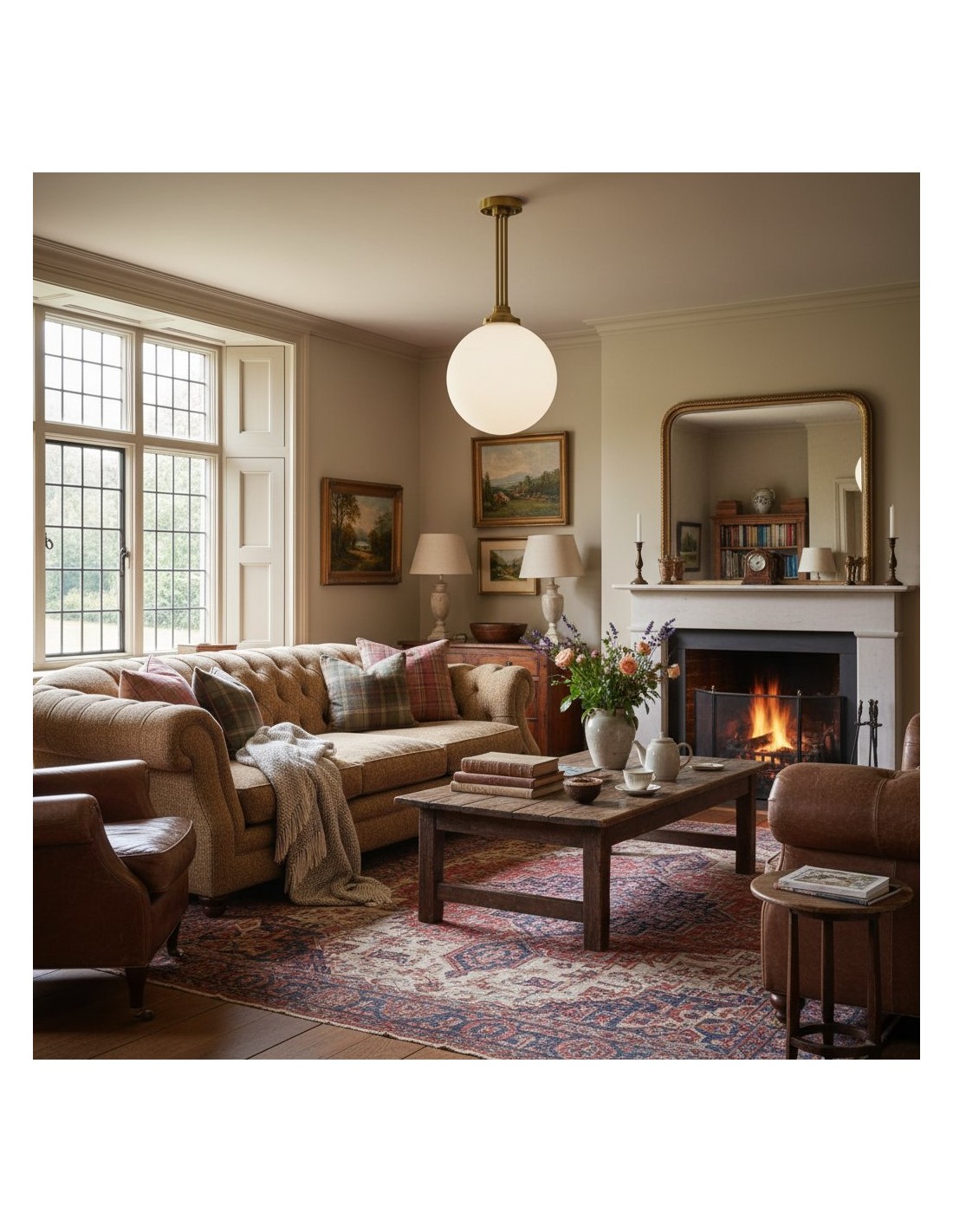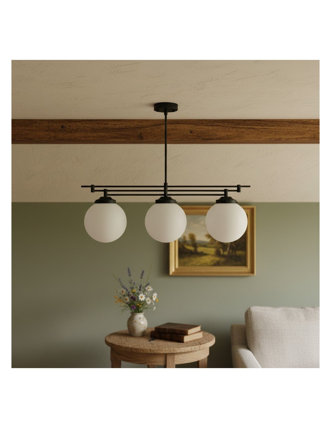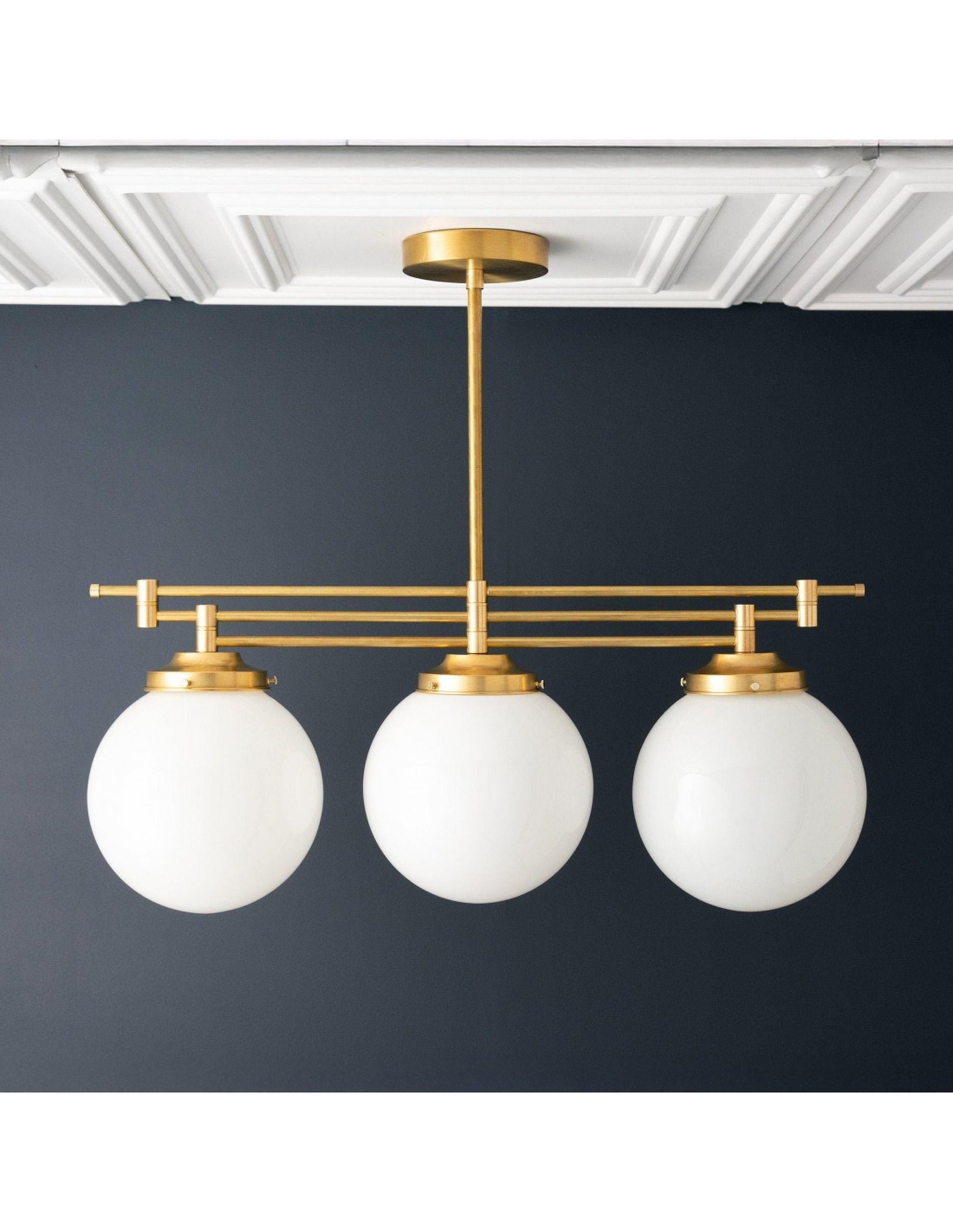 Een verfijnde hanglamp met een grote bol van mat glas en decoratieve messing staven, geïnspireerd op art-decostijl. De bol van 30 cm verspreidt het licht zacht en voegt warmte en elegantie toe. Ideaal voor keukens, gangen en woonkamers, combineert dit opvallende stuk vintage details met een moderne uitstraling.