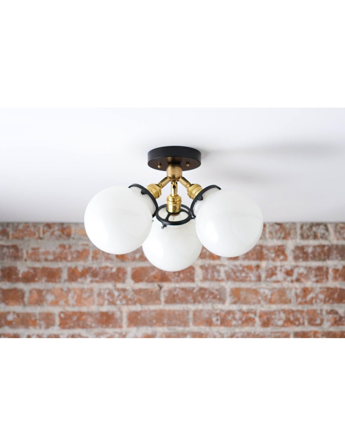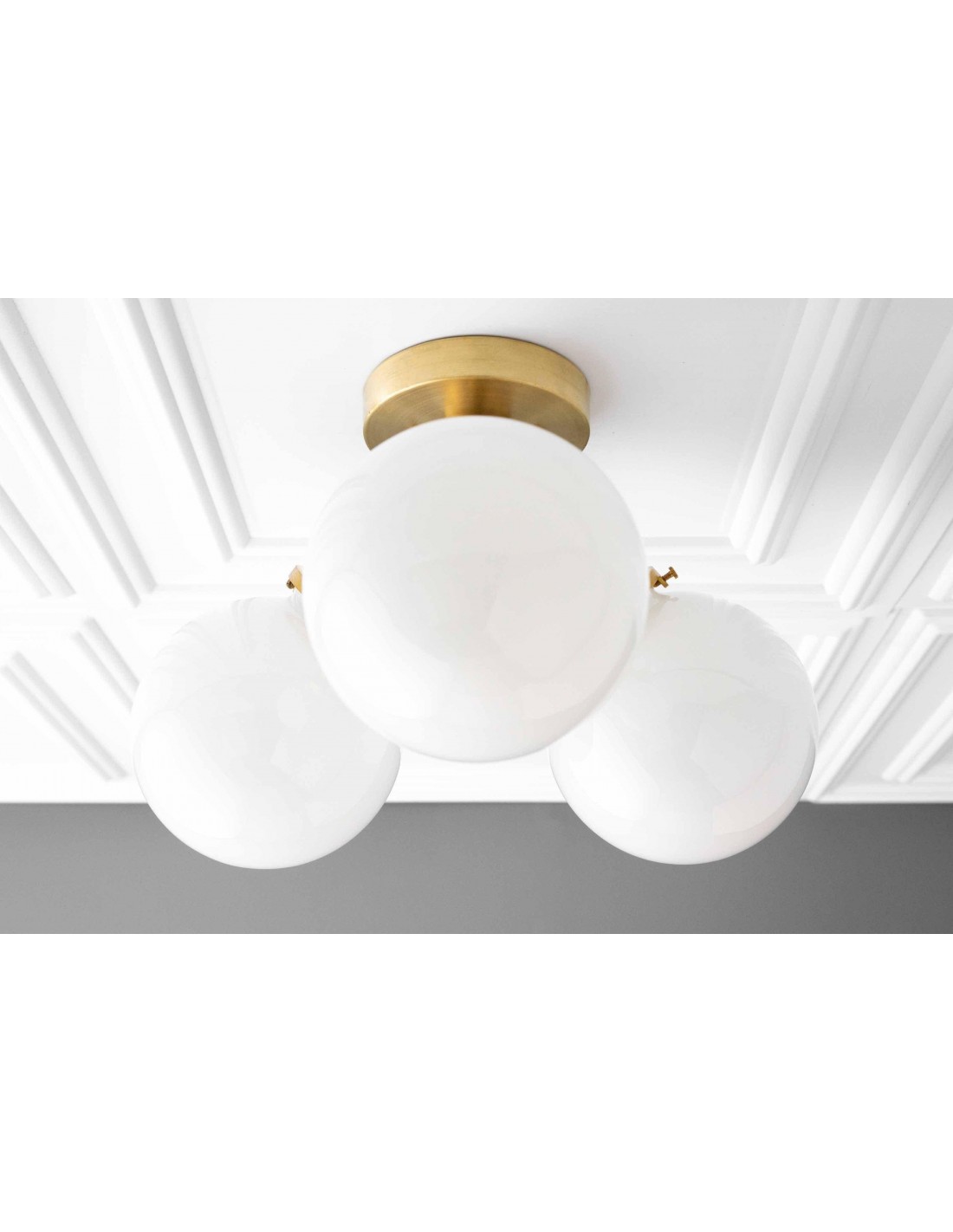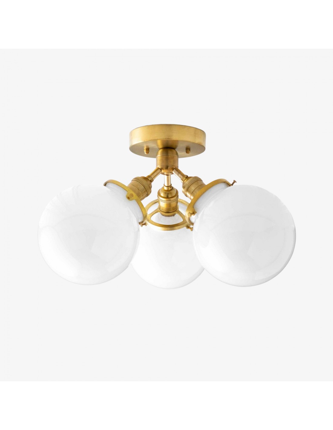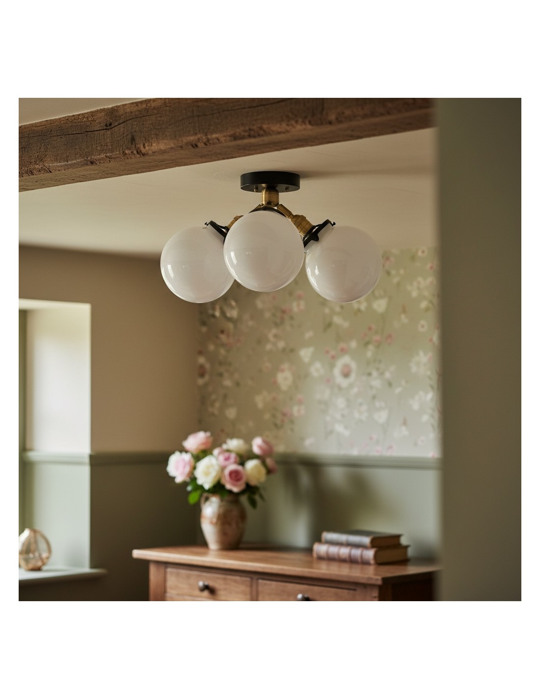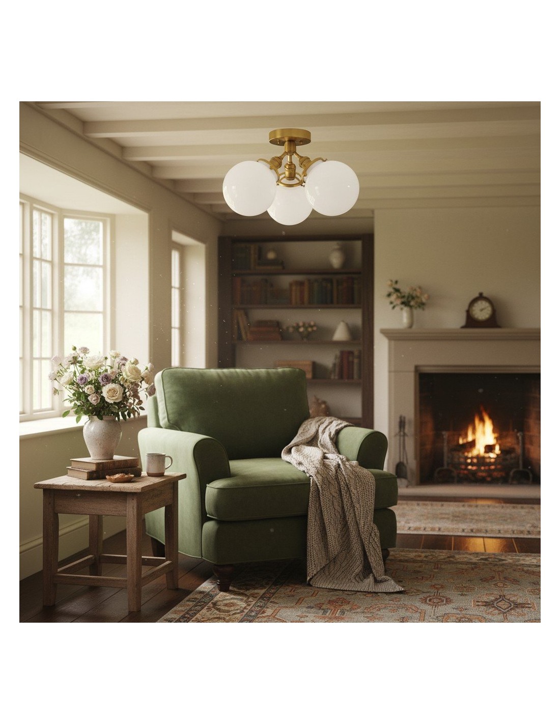 De Glorica glazen bollamp brengt een mid-century moderne charme in uw ruimte. Gemaakt van massief messing met een zachte, natuurlijke patina en gecombineerd met een lichtgevende bolvormige lampenkap, biedt deze semi-flush plafondlamp een warme gloed en een tijdloos design. Perfect voor eetkamers, woonkamers en entrees.
