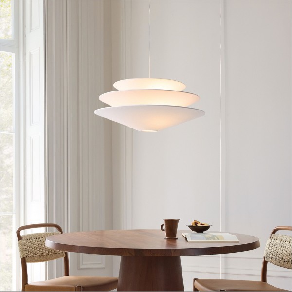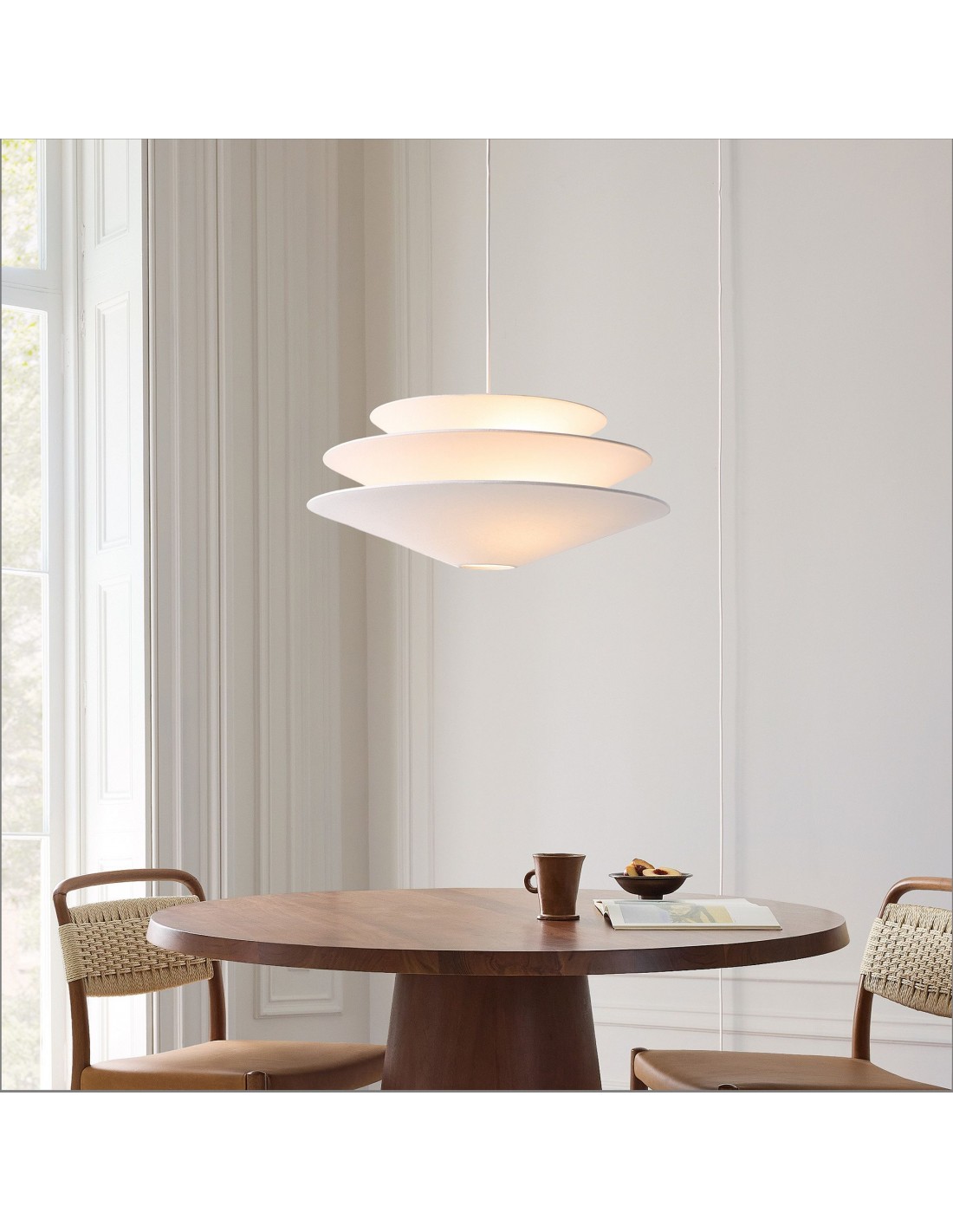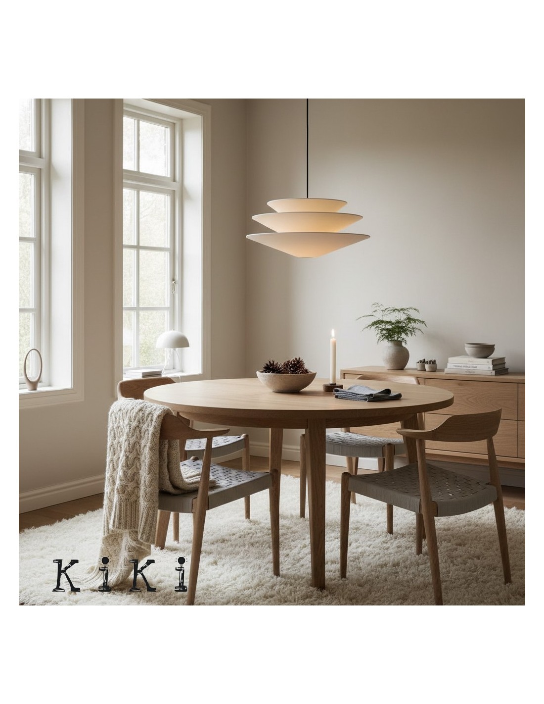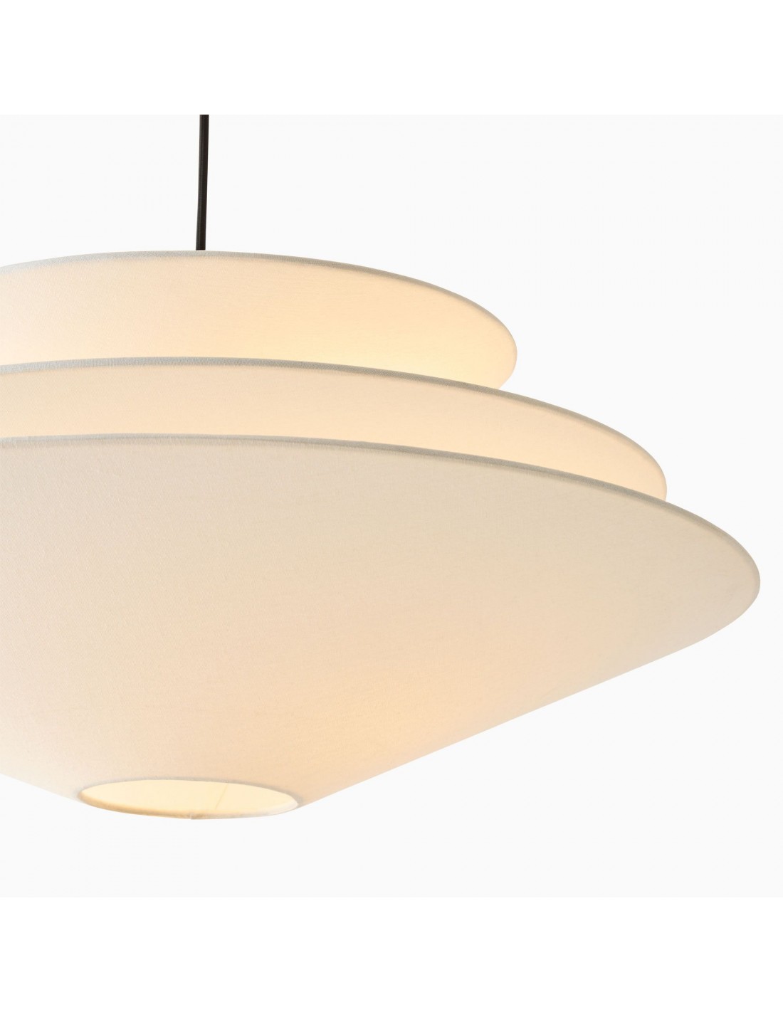 De Solivara Tiered hanglamp combineert verfijnde linnenlook kappen met een verfijnde gelaagdheid, waardoor een sculpturale, licht gestructureerde hanglamp ontstaat die zowel visuele elegantie als een sfeervolle zachtheid uitstraalt. Het gelaagde stoffen ontwerp verspreidt het licht subtiel en vult ruimtes met een warme, uitnodigende gloed zonder schittering.