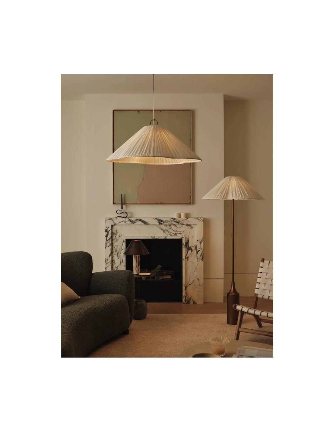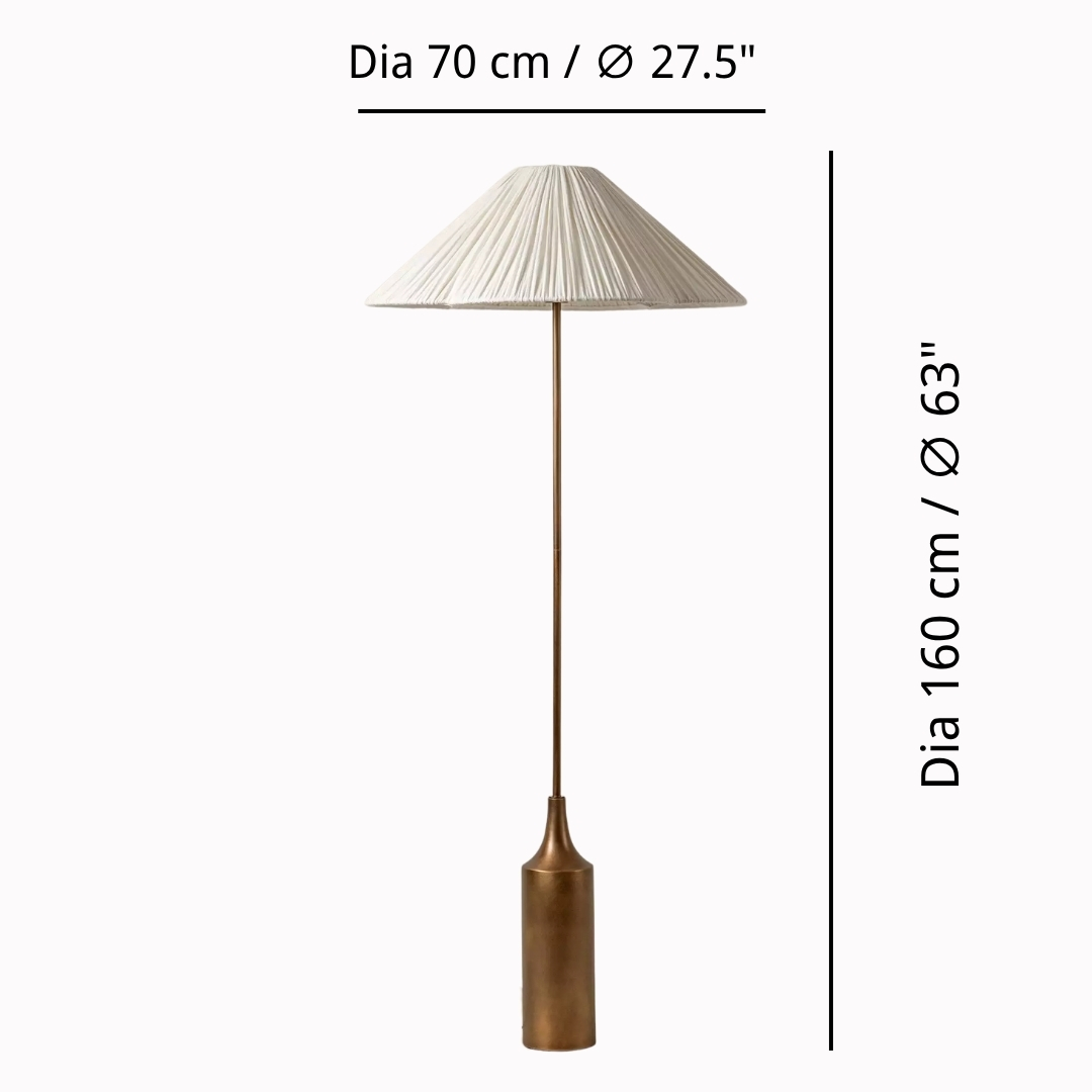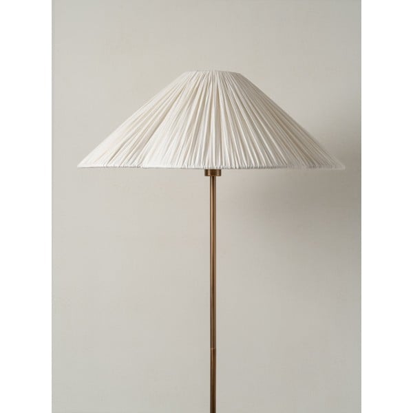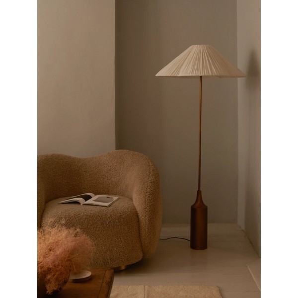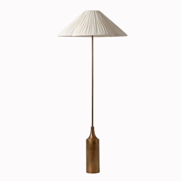 Boeiend, vrouwelijk en textuurrijk. Lindi is onze sierlijke, opvallende staande lamp, ontworpen met bloemmotieven en texturen in gedachten. Zachte linnen plooien vallen als een waterval over een oversized, geschulpte kap en komen samen met een verfijnde, verouderde messing steel en cilindrische voet. De grote, linnen kap laat het licht zachtjes doorschijnen en creëert een zachte en dromerige sfeer in uw interieur. Gebruik hem in een hal, slaapkamer of woonkamer om een grootse stijlverklaring te creëren.