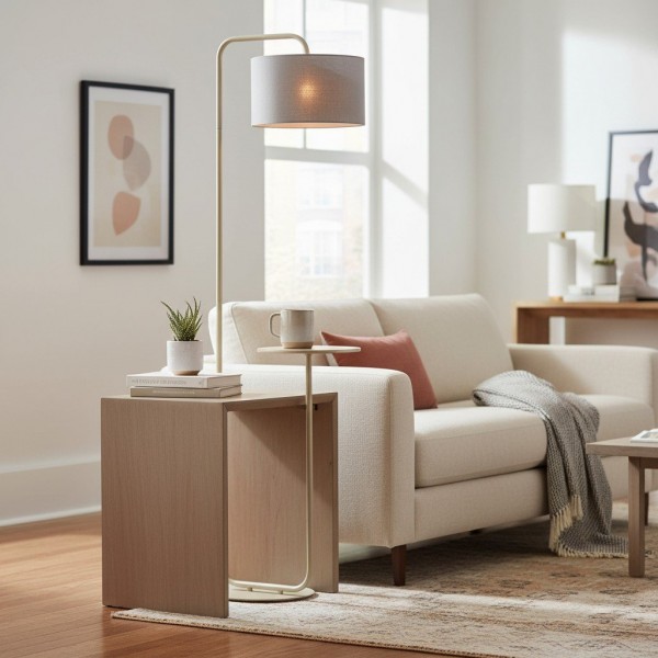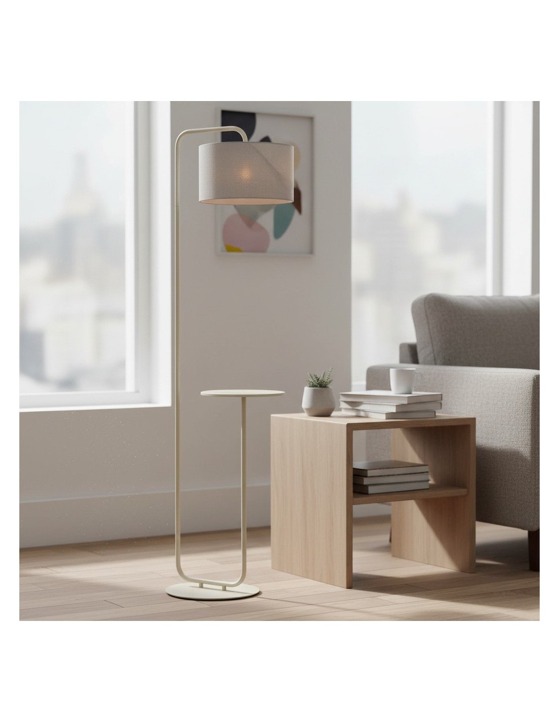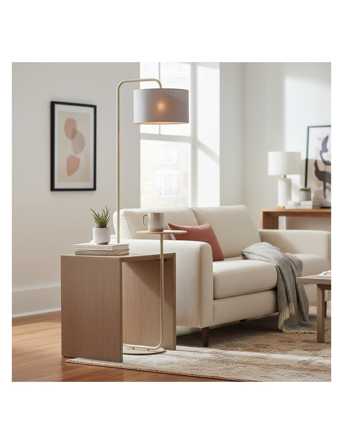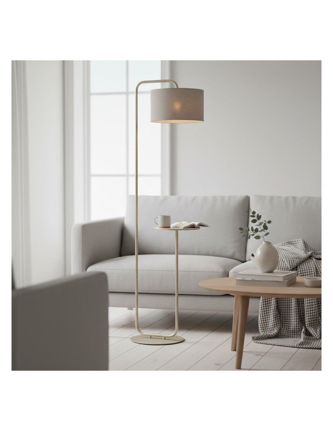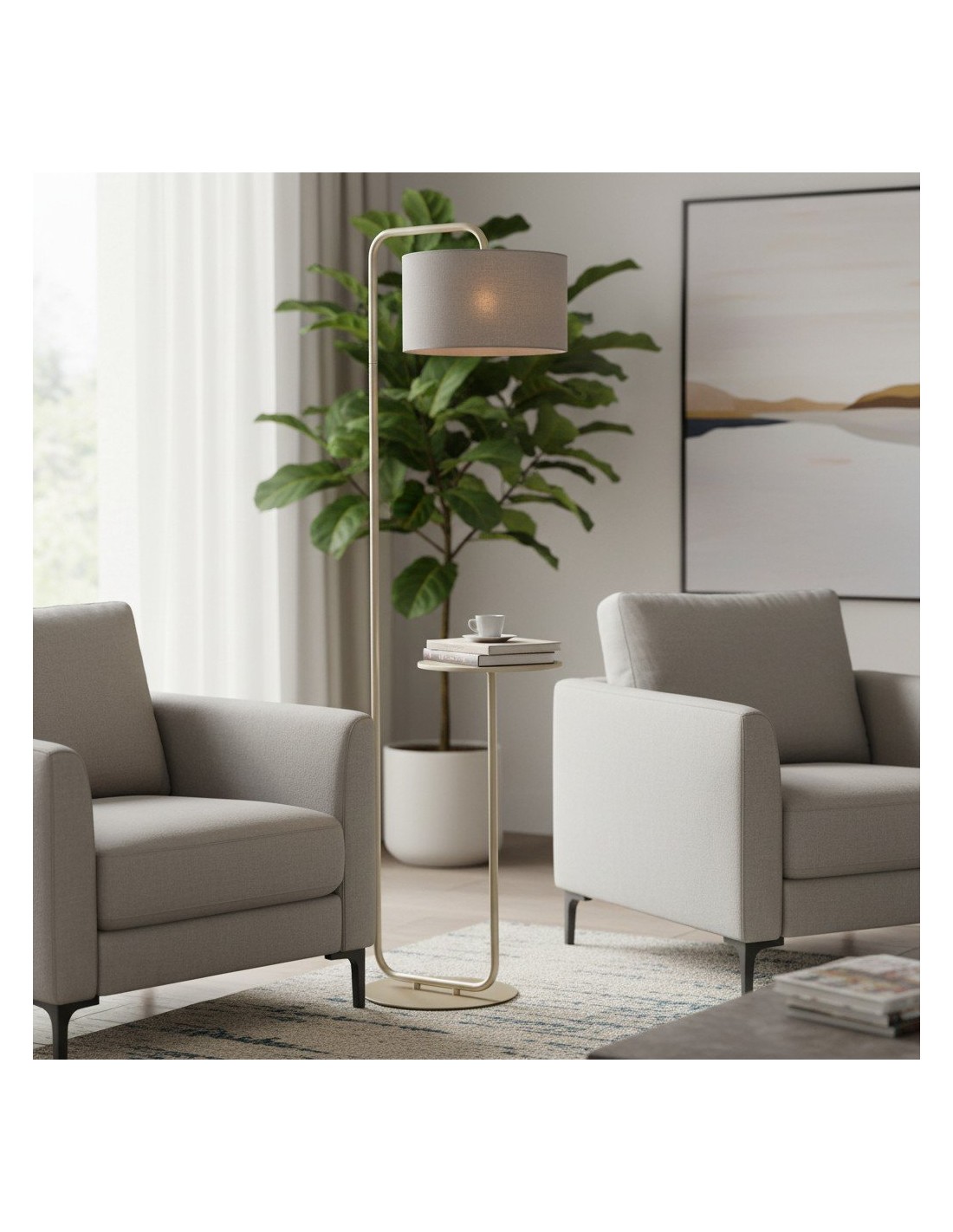 De Lirra vloerlamp combineert een champagnekleurige metalen voet met een geïntegreerd bijzettafeltje. De strakke, moderne lijnen zorgen voor stijl en functionaliteit. Perfect voor woonkamers, slaapkamers, lounges of leeshoekjes, want de lamp biedt sfeerverlichting en een handig oppervlak voor drankjes, boeken of decoratie.