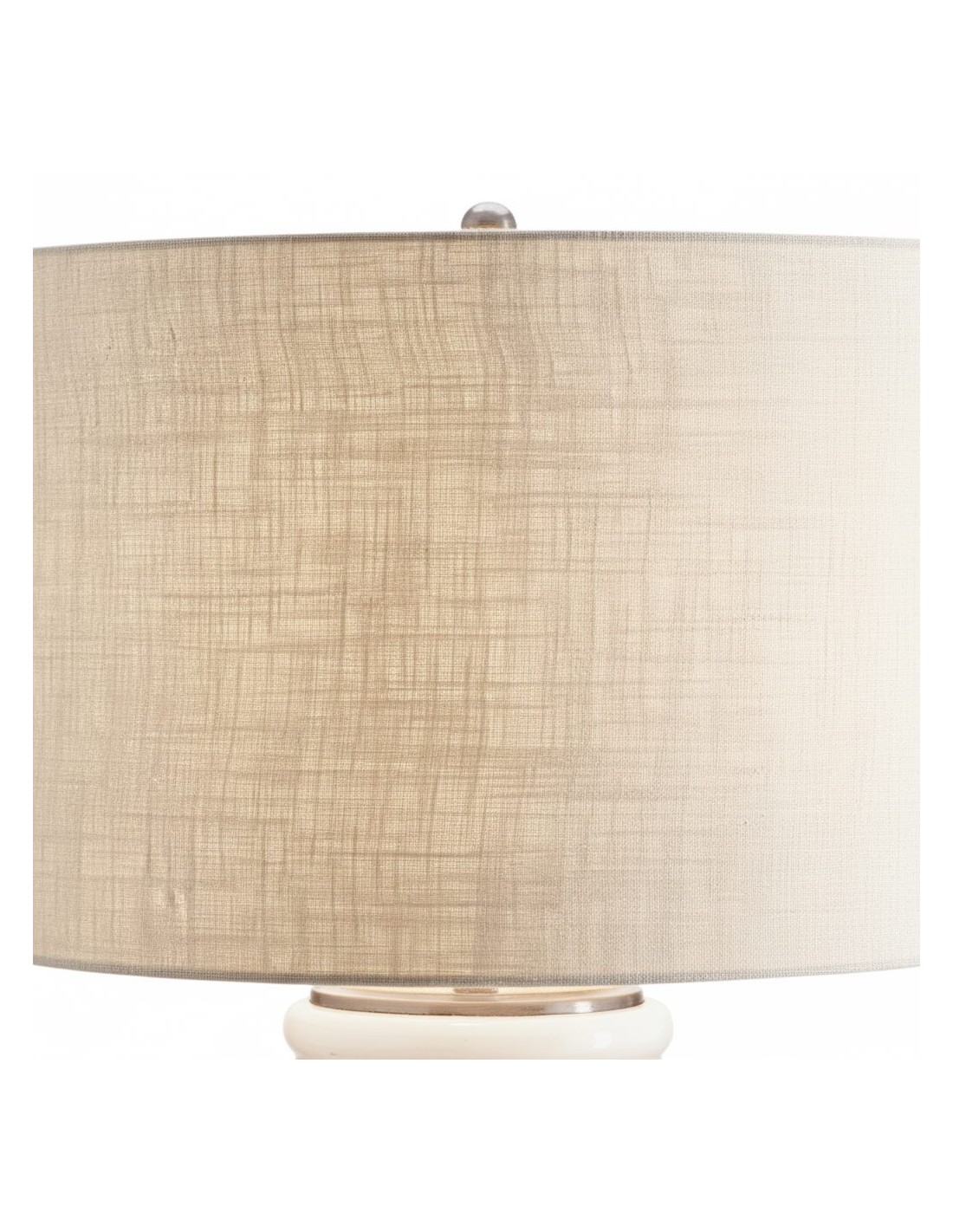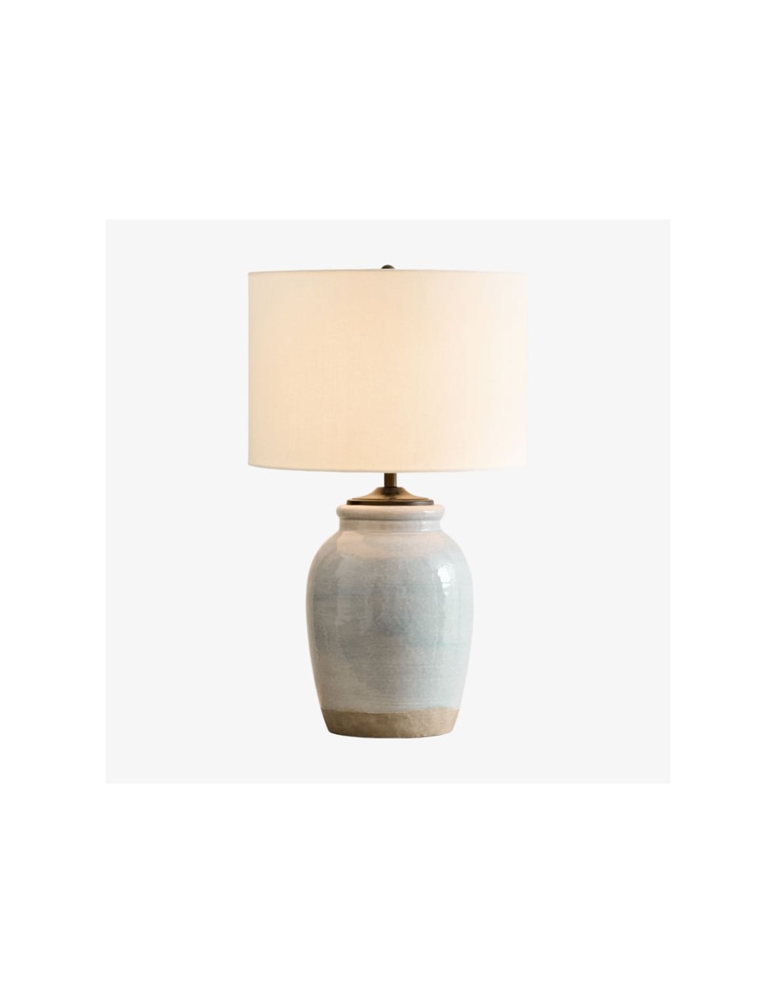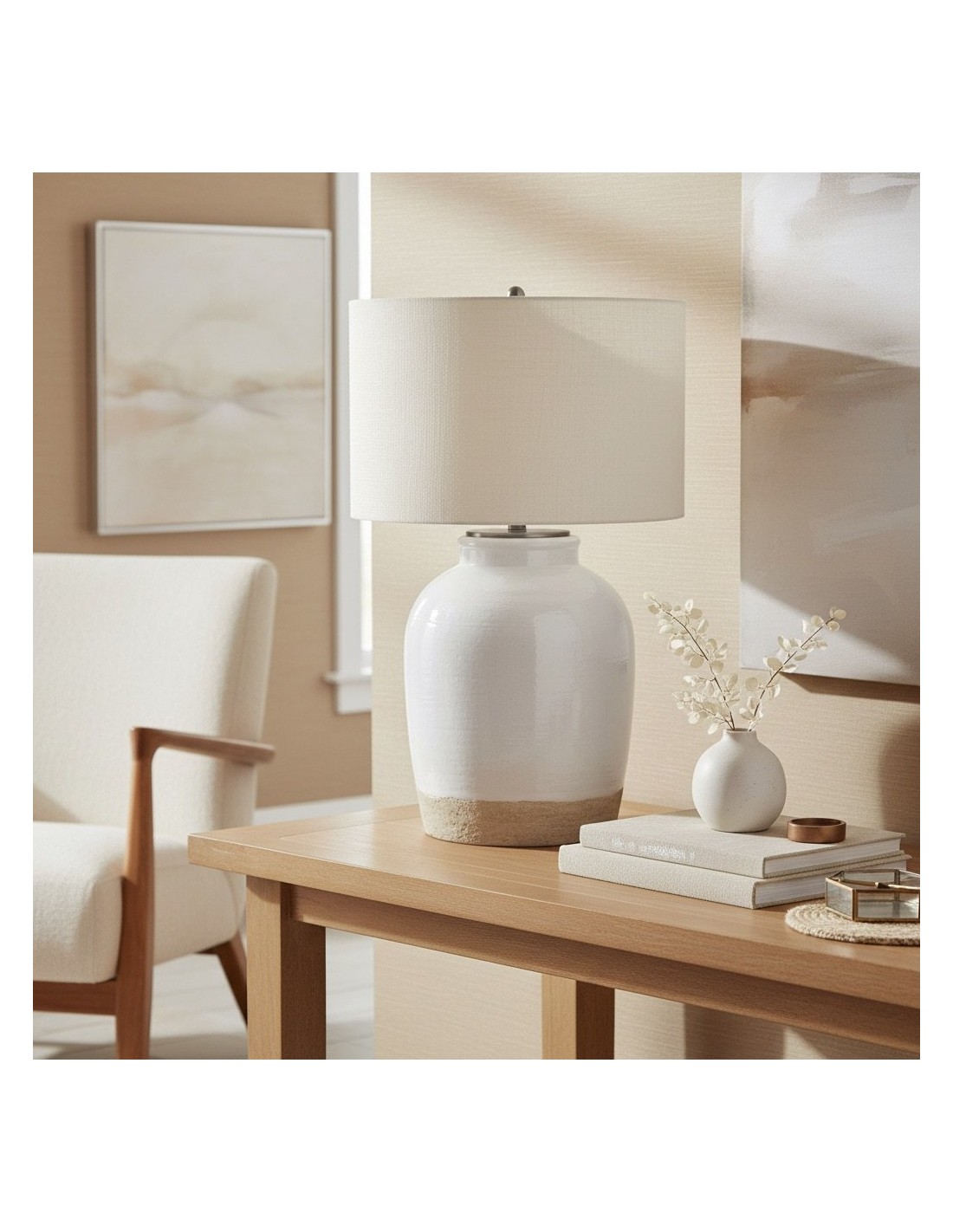 De Mello tafellamp heeft een handgemaakte keramische voet met een zachte, cilindervormige lampenkap. Deze veelzijdige lamp voegt een organische, moderne elegantie toe aan nachtkastjes, bureaus en woonkamers.