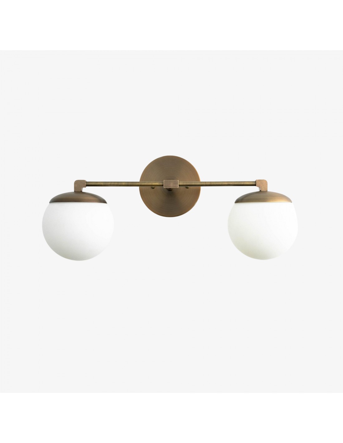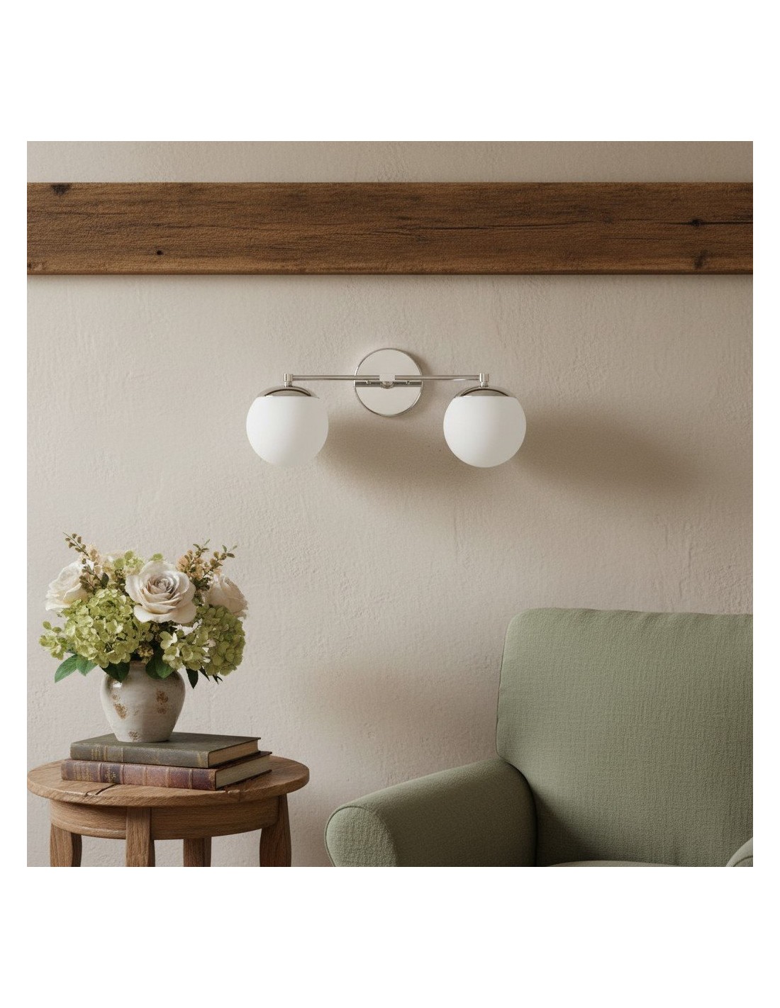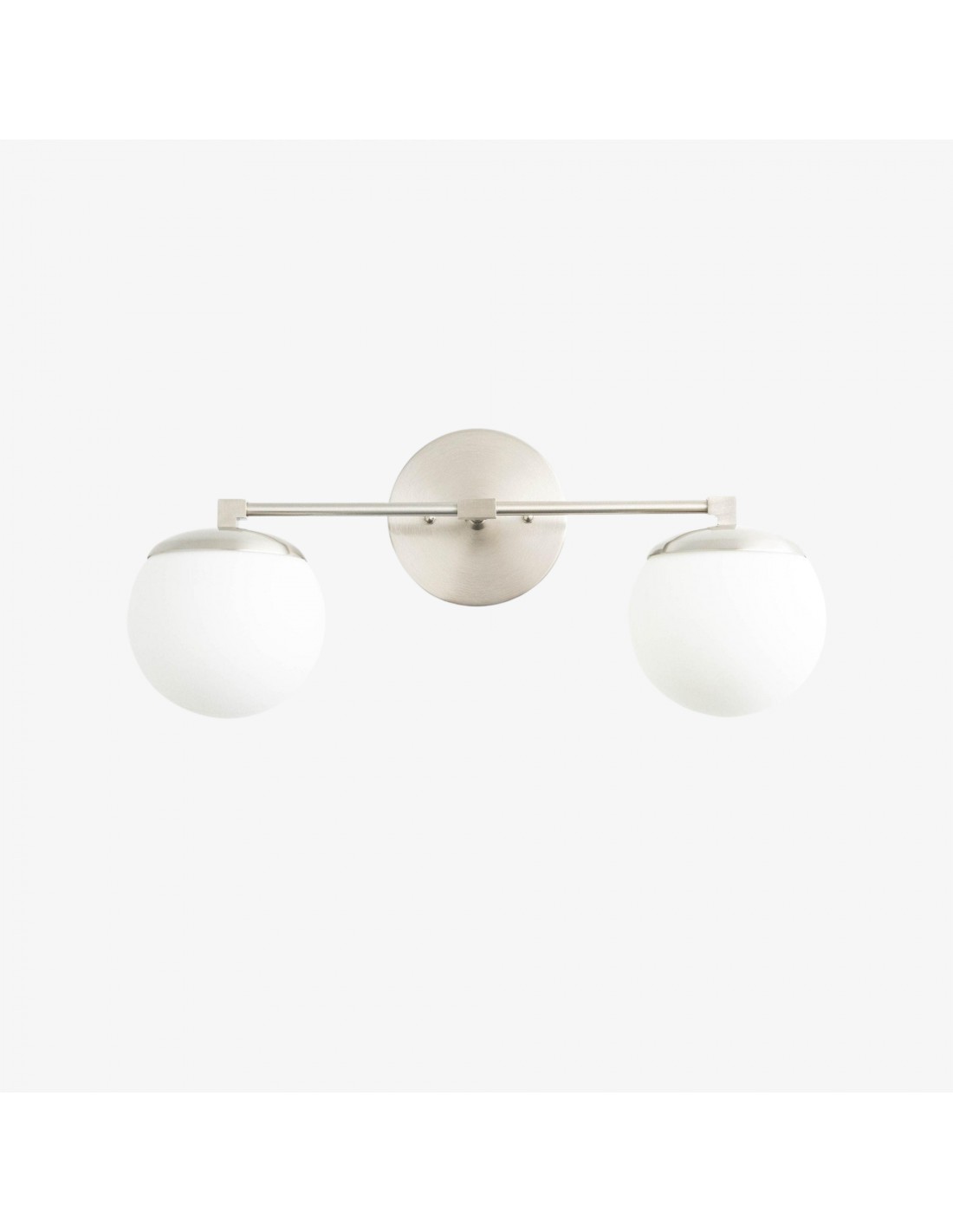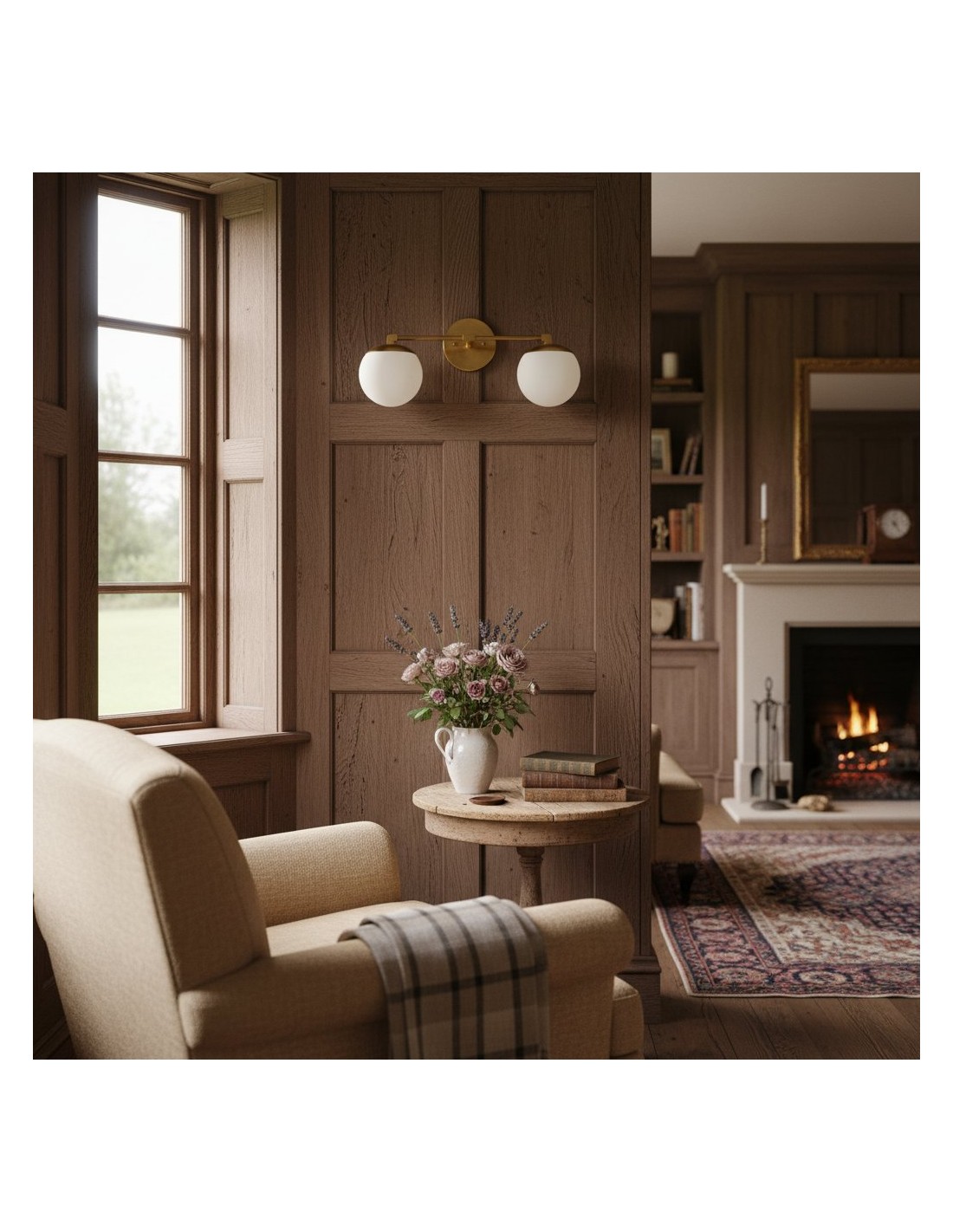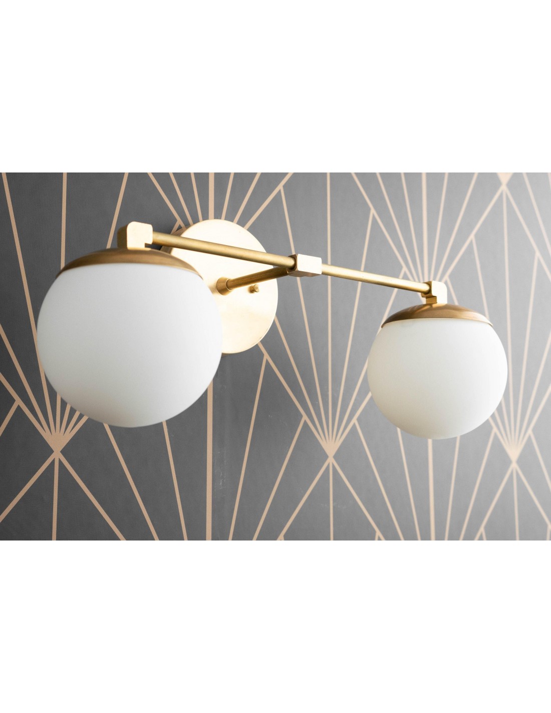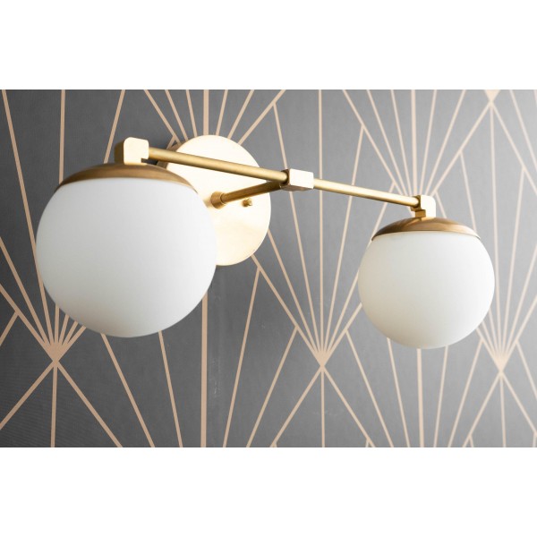 De Glorica glazen kaptafellamp voegt een verfijnde art-decostijl toe aan elke ruimte. Deze veelzijdige wandlamp met een satijnen opalen bol en een armatuur van massief messing kan horizontaal of verticaal worden gemonteerd. De strakke lijnen en warme afwerking zorgen voor een zachte, sfeervolle verlichting in badkamers, gangen of slaapkamers.