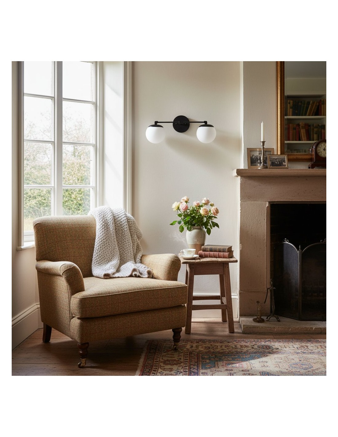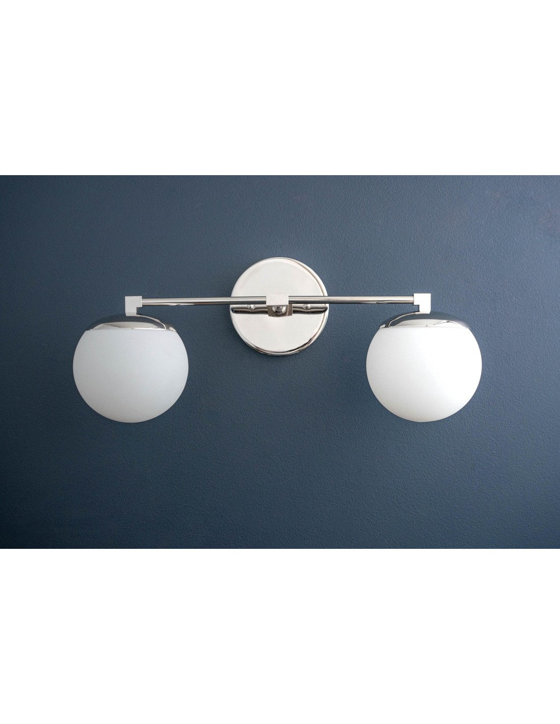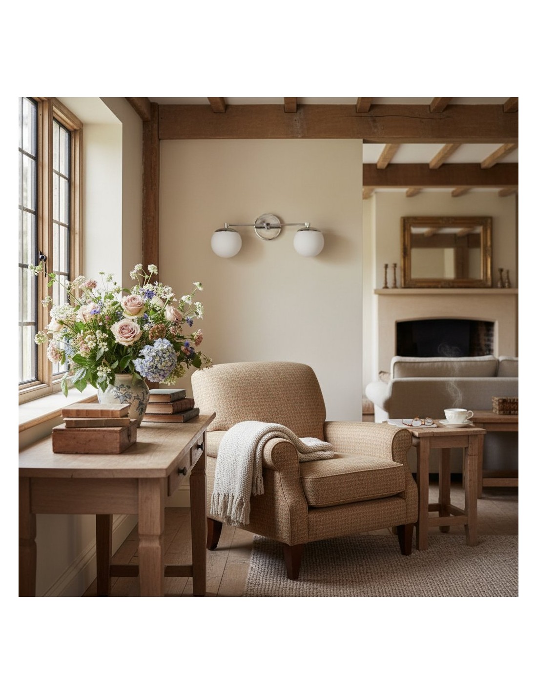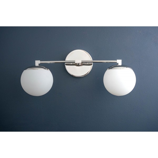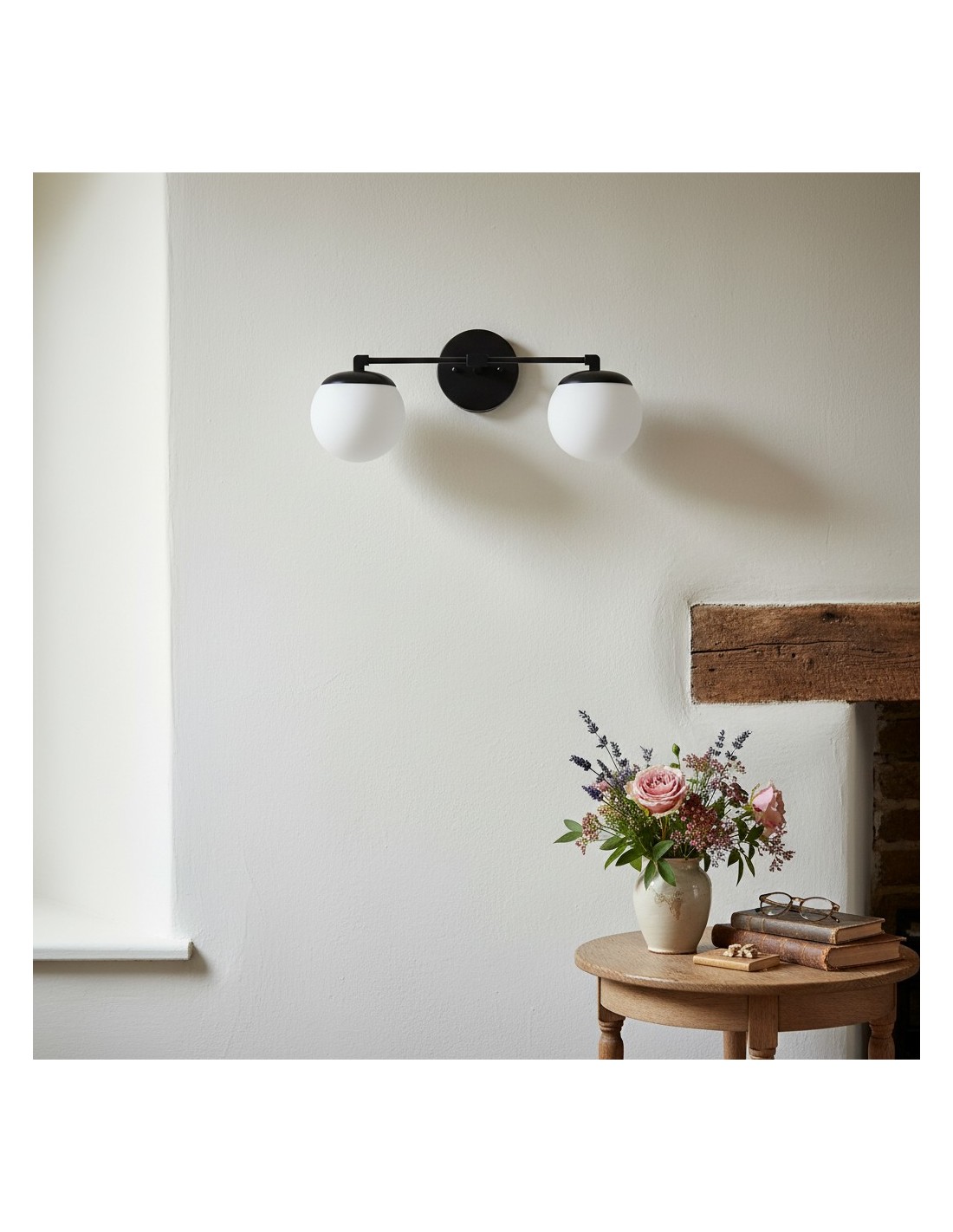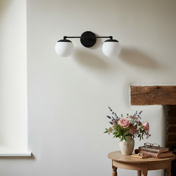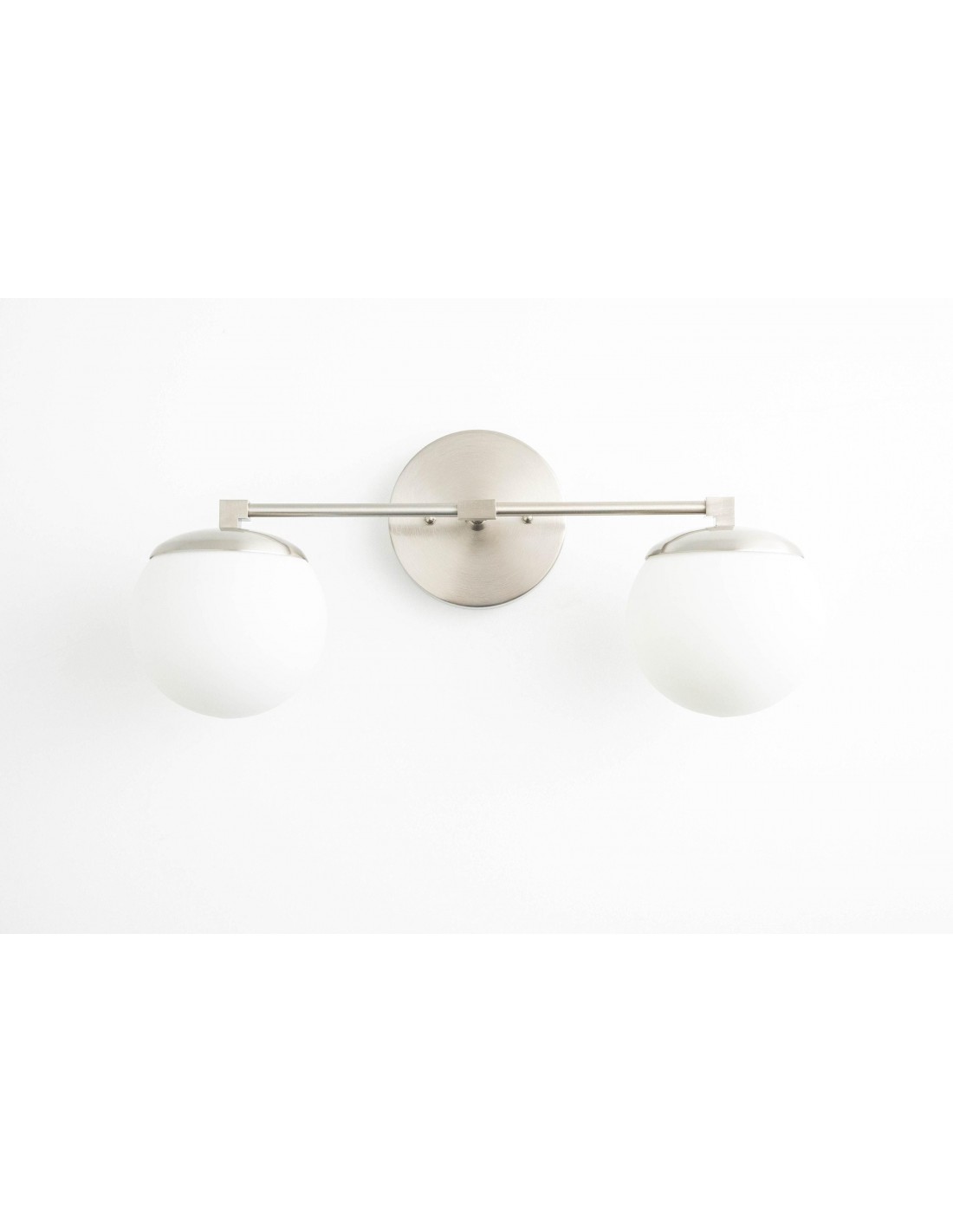 De Glorica glazen kaptafellamp voegt een verfijnde art-decostijl toe aan elke ruimte. Deze veelzijdige wandlamp met een satijnen opalen bol en een armatuur van massief messing kan horizontaal of verticaal worden gemonteerd. De strakke lijnen en warme afwerking zorgen voor een zachte, sfeervolle verlichting in badkamers, gangen of slaapkamers.